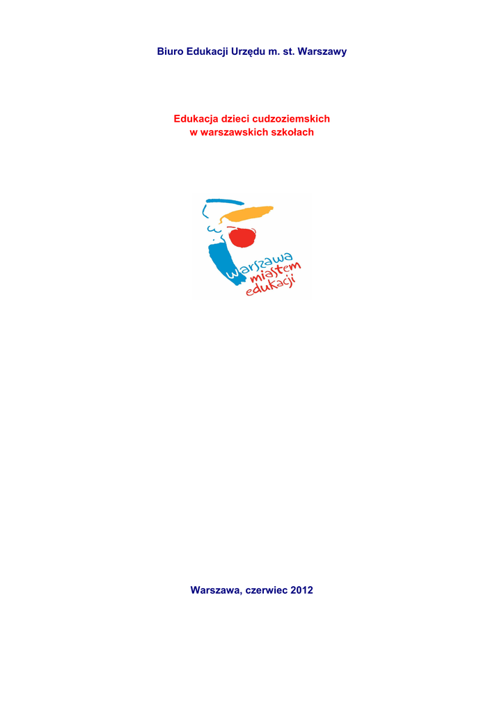 Biuro Edukacji Urzędu m. st. Warszawy Edukacja dzieci cudzoziemskich w warszawskich szkołach Warszawa, czerwiec 2012 I. Wprowadzenie Obecność ponad tysiąca dzieci cudzoziemskich w szkołach prowadzonych przez samorząd miasta stołecznego Warszawy wyznacza środowisku oświatowemu nowe zadania dydaktyczne i wychowawcze. Edukacja dzieci cudzoziemskich łączy się z edukacją międzykulturową i edukacją wielokulturową, z kształtowaniem kompetencji społecznych potrzebnych uczniom i nauczycielom do życia w wielokulturowym otoczeniu. Obecność w szkole dziecka cudzoziemskiego – migranta czy uchodźcy to praktyczna lekcja tolerancji i szacunku wobec inności. Jej pomyślny przebieg zależy od wielu czynników: przygotowania dyrekcji szkoły, nauczycieli i pracowników administracji szkolnej, współdziałania z rodzicami – polskimi i cudzoziemskimi, umiejętnej współpracy z instytucjami i organizacjami zajmującymi się cudzoziemcami, a także wsparcia finansowego i organizacyjnego. „Społeczna Strategia Warszawy w latach 2008-2020”, podstawowy dokument wyznaczający działania w sferze społecznej, dostrzega obecność cudzoziemców jako szansę i zagrożenie dla rozwoju miasta. Z jednej strony przyjazd wysokiej klasy specjalistów i ekspertów zagranicznych wpływa na dynamikę postępu ekonomicznego warszawskiego biznesu, z drugiej strony obecność cudzoziemców, zwłaszcza uchodźców, przyczynia się do rozwarstwień kulturowych i społecznych. Obecnie powstaje program strategiczny „Warszawa różnorodna”, którego głównym celem jest przeciwdziałanie zjawiskom dyskryminacji w różnych obszarach życia społecznego. Warszawska edukacja pierwsze swoje działania zaczęła w 2007 roku. Choć procentowy udział uczniów cudzoziemskich w całej populacji warszawskich uczniów jest niski (ok. 1%), to prognozy trendów migracyjnych oraz tempa rozwoju stołecznej metropolii wskazują na coraz większe zainteresowanie Polską i Warszawą jako miejscem docelowego lub tymczasowego osiedlenia się. Warszawa - największe skupisko cudzoziemców w kraju - ma możliwość stworzenia modelowego rozwiązania edukacji uczniów cudzoziemskich. Ten potencjał stolicy zwiększa obecność wielu instytucji i organizacji zaangażowanych w programy integracji nowych mieszkańców. Uczelnie, organizacje pozarządowe, organizacje międzynarodowe (Urząd Komisarza ds. Uchodźców Narodów Zjednoczonych, Międzynarodowa Organizacja ds. Migracji), instytuty kultury różnych krajów, placówki dyplomatyczne czy międzynarodowe koncerny mogą wspierać władze lokalne w budowaniu systemu integracji cudzoziemców. Rozpoczętym działaniom w edukacji towarzyszyła diagnoza stopnia przygotowania szkół do przyjęcia uczniów cudzoziemskich. Jej wyniki były pomocne w budowaniu warszawskiego systemu edukacji cudzoziemców, opartego na nowych uregulowaniach prawnych, możliwościach organizacyjnych oraz zasadzie współpracy z partnerami szkoły. Obecnie w warszawskich szkołach uczą się dzieci o różnym statusie prawnym – dzieci migrantów ekonomicznych (często nielegalnie przebywających w Polsce) – Wietnamczycy, Ukraińcy, Białorusini, dzieci uchodźców i osób o nieuregulowanej sytuacji prawnej – Czeczeni, Gruzini, przedstawiciele str. 2 narodów kaukaskich; dzieci pracowników z krajów członkowskich UE, dzieci z rodzin powracających z emigracji zarobkowej czy dzieci z małżeństw mieszanych. Biuro Edukacji tworząc koncepcję systemu edukacji dzieci cudzoziemskich czerpie zarówno z doświadczeń szkół publicznych, do których chodzi większość uczniów cudzoziemskich, a także z wieloletniego dorobku Zespołu Szkół im Maharadży Jam Saheba Digvijay Sinhji. Maharadża - hinduski magnat, który otoczył opieką polskie sieroty podczas II wojny światowej – patronuje szkole, w której od kilkunastu lat uczą się cudzoziemcy. Wśród nich są sieroty, uchodźcy polityczni z Tybetu, Chin i Somalii. Doświadczenia nauczycieli pracujących z dziećmi z odległych stron świata okazały się niezwykle pomocne. Podstawy prawne edukacji dzieci cudzoziemskich Unia Europejska zwróciła uwagę na kwestie integracji w społeczeństwie europejskiej w Traktacie w Maastricht, a w 1997 roku szczegółowo opracowała zakres kompetencji UE w zakresie polityki migracyjnej. W Traktacie Amsterdamskim zawarto regulacje dotyczące przekraczania granic państw. Kolejne dokumenty wytyczały kierunki polityki Unii Europejskiej wobec narastającej liczby migrantów. Dyrektywa wspólnotowa 2000/43/WE z 2000 r., poświęcona zasadzie równego traktowania niezależnie od rasy, pochodzenia, pokazała ogólne ramy polityk integracyjnych tworzonych w państwach członkowskich UE. Bardziej szczegółowe zalecenia znalazły się w Dyrektywie Rady 2003/109/EC z 2003 r., w której określono uprawnienia wspierające imigrantów w procesie integracji (np. prawo do edukacji i kształcenia zawodowego, możliwość uznawania dyplomów i innych kwalifikacji w nowym państwie). Niemal od początku w dokumentach unijnych edukacja została uznana za jeden z najważniejszych elementów integracji cudzoziemców w goszczącym społeczeństwie. W Komunikacie Komisji Europejskiej o migracji, integracji i zatrudnieniu z 2003 roku można przeczytać: „Należy zauważyć, że system edukacji odgrywa zasadniczą rolę nie tylko w zdobywaniu wiedzy, ale także jako miejsce zdobywania formalnych i nieformalnych informacji o normach i wartościach społeczeństwa, a także jako pomost międzykulturowy. Jest on ważnym narzędziem zachęcania do pluralizmu i różnorodności, zarówno w stosunku do populacji migrantów, jak i społeczeństwa kraju goszczącego, sprzyjając przez to zwalczaniu dyskryminacji”. Jako wskaźniki świadczące o pomyślnej integracji cudzoziemców uznano m.in. niski procent uczniów opuszczających przedwcześnie system formalnej edukacji, procent dwudziestodwulatków ze średnim wykszta