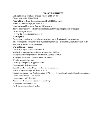 Pracownik biurowy Data zgłoszenia oferty do Urzędu Pracy: 2016-07-08 Oferta ważna do: 2016-07-15 Nazwa firmy: Biuro Konsultingowe ADVISER Jan Łazor Adres: 10-437 Olsztyn, ul. Żółta 10A/18 Nazwa stanowiska pracy: Pracownik biurowy Zakres obowiązków: udział w zespole przygotowującym aplikacje dotacyjne Liczba wolnych miejsc: 1 - w tym dla niepełnosprawnych: 1 Wymagania Preferowany poziom wykształcenia: wyższe, typ wykształcenia: ekonomiczne Inne wymagania: wykształcenie wyższe magisterskie - ekonomika, rachunkowość, mile widziane doświadczenie zawodowe Warunki płacy i pracy Data rozpoczęcia pracy: 2016-07-15 Minimalne wynagrodzenie brutto mies./godz.: 2000.00 Maksymalne wynagrodzenie brutto mies./godz.: 2500.00 Rodzaj zatrudnienia: Umowa na okres próbny Wymiar etatu: Pełny etat Liczba godzin pracy w tygodniu: 40 Zmianowość: jedna zmiana Sposób aplikowania: Bezpośrednio do pracodawcy Adres: 10-437 Olsztyn, ul. Żółta 10A/18 Kontakt z pracodawcą: Jan Łazor, tel: 607-214-144, e-mail: [email protected] Osoba do kontaktu: Jan Łazor Nr telefonu: 607-214-144 Adres e-mail: [email protected] Wymagane dokumenty: cv Język składania aplikacji: polski