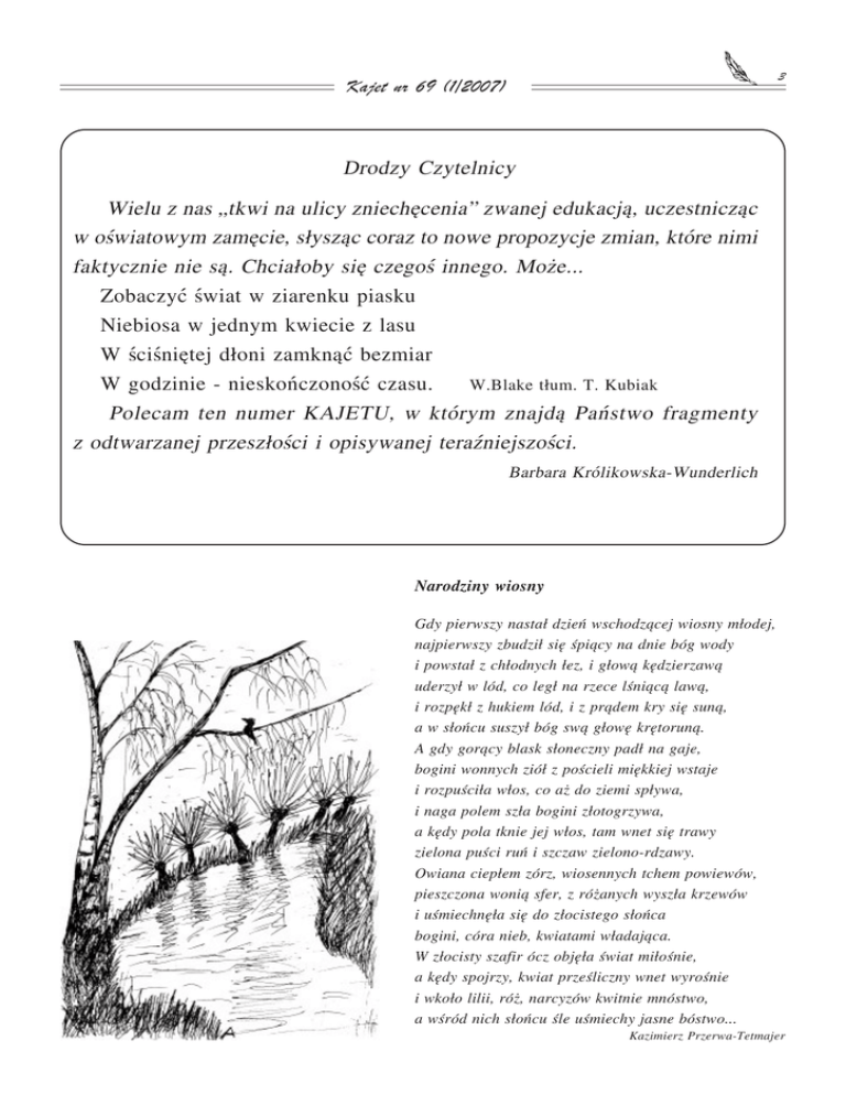 3 Kajet nr 69 (1/2007) Drodzy Czytelnicy Wielu z nas „tkwi na ulicy zniechêcenia” zwanej edukacj¹, uczestnicz¹c w oœwiatowym zamêcie, s³ysz¹c coraz to nowe propozycje zmian, które nimi faktycznie nie s¹. Chcia³oby siê czegoœ innego. Mo¿e... Zobaczyæ œwiat w ziarenku piasku Niebiosa w jednym kwiecie z lasu W œciœniêtej d³oni zamkn¹æ bezmiar W godzinie - nieskoñczonoœæ czasu. W.Blake t³um. T. Kubiak Polecam ten numer KAJETU, w którym znajd¹ Pañstwo fragmenty z odtwarzanej przesz³oœci i opisywanej teraŸniejszoœci. Barbara Królikowska-Wunderlich Narodziny wiosny Gdy pierwszy nasta³ dzieñ wschodz¹cej wiosny m³odej, najpierwszy zbudzi³ siê œpi¹cy na dnie bóg wody i powsta³ z ch³odnych ³ez, i g³ow¹ kêdzierzaw¹ uderzy³ w lód, co leg³ na rzece lœni¹c¹ law¹, i rozpêk³ z hukiem lód, i z pr¹dem kry siê sun¹, a w s³oñcu suszy³ bóg sw¹ g³owê krêtorun¹. A gdy gor¹cy blask s³oneczny pad³ na gaje, bogini wonnych zió³ z poœcieli miêkkiej wstaje i rozpuœci³a w³os, co a¿ do ziemi sp³ywa, i naga polem sz³a bogini z³otogrzywa, a kêdy pola tknie jej w³os, tam wnet siê trawy zielona puœci ruñ i szczaw zielono-rdzawy. Owiana ciep³em zórz, wiosennych tchem powiewów, pieszczona woni¹ sfer, z ró¿anych wysz³a krzewów i uœmiechnê³a siê do z³ocistego s³oñca bogini, córa nieb, kwiatami w³adaj¹ca. W z³ocisty szafir ócz objê³a œwiat mi³oœnie, a kêdy spojrzy, kwiat przeœliczny wnet wyroœnie i wko³o lilii, ró¿, narcyzów kwitnie mnóstwo, a wœród nich s³oñcu œle uœmiechy jasne bóstwo... Kazimierz Przerwa-Tetmajer 4 Kajet nr 69 (1/2007) Skutki „babskiego prze³omu” Zmiany ustrojowe roku 1989, wyznaczone konkretnymi datami (4 czerwca – referendum, 28 grudnia - przyjêcie przez Sejm pakietu nowych ustaw) wywo³a³y tak¿e wœród odbiorców literatury tzw. „apetyt na przemianê”. Literatura, jak pokazuje historia, zawsze powi¹zana jest w swym rozwoju z ¿yciem politycznym, gospodarczym i spo³ecznym, a zatem duchowym spo³eczeñstwa. Poszukiwanie zmian, nowoœci prowadzi do wielu przemian w literaturze. Krytyka literacka og³asza prze³om na podstawie prowokacji w pismach literackich i nowych tomach poezji, po lekturze powieœci o charakterze buntowniczym i satyrycznym, przeœmiewczych w stosunku do tradycji i obyczajowoœci, kontestuj¹cych polskie mity narodowe. W koñcu minê³y najgorsze lata 1981-1989, nieodnajdywanie siê przez pisarzy w oficjalnym, zideologizowanym, zafa³szowanym ¿yciu pañstwowym oraz w tym drugim opozycyjnym, anachronicznym, skazuj¹cym na nieautentycznoœæ. Jednoczeœnie na prze³omie lat 80-tych i 90-tych ujawni³ siê proces wyzwolenia mentalnoœci Polaków spod presji tzw. kultury wysokiej, czy te¿ literackiej. Œwiadczy o tym chocia¿by fakt gwa³townego wzrostu zapotrzebowania na literaturê rozrywkow¹ – tani¹, ³atw¹ i komercyjn¹. Krótko przed 1989 rokiem wzros³y do wielkich liczb - 100 tysiêcy egzemplarzy nak³ady literatury science fiction i fantasy, horrorów, romansów, powieœci detektywistycznych, sensacyjnych, szpiegowskich, erotycznych. Wed³ug Marii Janion zarówno wœród twórców literatury, jak i jej odbiorców nast¹pi³o odwrócenie od paradygmatu romantycznego trwaj¹cego w naszej, polskiej kulturze 150 lat, wedle którego sztuka wystêpuje jako autorytet podsuwaj¹cy wzorce postêpowania i os¹dzaj¹cy nasze czyny. Ten odwrót nie wi¹¿e siê niestety z akceptacj¹ nowych autorytetów. Wolnoœæ myœlenia i s³owa, usankcjonowana konstytucj¹ w grudniu 1989 roku, dodatkowo zostaje wzmocniona przez zniesienie cenzury prewencyjnej rok póŸniej w grudniu 1990 roku. Daje to mo¿liwoœæ decentralizacji wszelkiej dzia³alnoœci wydawniczej, a zatem otwiera spe³nienia twórczych realizacji poza Warszaw¹. Szczególnie widoczny w pierwszej po³owie lat dziewiêædziesi¹tych jest ¿ywio³owy rozwój rynku czasopiœmienniczego. Do dzia³aj¹cych jeszcze przed 1989 rokiem „brulionu”, „Czasu Kultury” i „FA-artu” do³¹czaj¹ inne m.in.: w 1989 „Kresy”, „Pracownia”, „Lampa i Iskra Bo¿a”, w 1990 „Dekada Literacka”, „Ex libris”, „Nowa Fantastyka”, „Teksty Drugie”, „Borussia, „NaG³os”, w 1991 „Tytu³”, „Arkusz”, „Fraza”, w 1992 „Sycyna”, „Pe³nym G³osem”, „Opcje”, w 1994 „Wiadomoœci Kulturalne”, „Nowy Nurt”, „Fronda”, w 1995 „Studium”, „Dykcja”. Przy czasopismach prawie natychmiast pojawiaj¹ siê wydawnictwa, promuj¹ce nowych, m³odych pisarzy i wydaj¹ce ich debiutanckie ksi¹¿ki. Powstaje koniunktura na polsk¹ literaturê najnowsz¹, co uwidacznia siê wzrostem nak³adów przeciêtnych ksi¹¿ek (z 800 egz. do kilkudziesiêciu tysiêcy). Tzw. nowe ksi¹¿ki wydawane s¹ w specjalnych seriach wydawniczych poœwiêconych najnowszej literaturze polskiej np. „Muza” – „Sami swoi”, WAB – „Archipelagi”, Pruszyñski – „Wspó³czesna proza polska”, „Œwiat Ksi¹¿ki” – seria z proz¹ polsk¹. Wydawanie serii wp³ynê³o oczywiœcie na stabilny obieg informacyjno-towarowy, zarówno przyci¹ga³o pisarza zapewniaj¹c mu d³ugofalowoœæ, jak i czytelnika obiecuj¹c mu tzw. „zmiennoœæ w sta³oœci” oraz zwraca³o powszechnie uwagê krytyki. Kolejnym elementem wspomagaj¹cym najnowsz¹ literaturê by³y konkursy literackie. Po 1989 roku ustanowiono ich sporo. Miêdzy innymi: Paszport „Polityki”, Nagrodê „Czasu Kultury”, Nagrodê Czes³awa Mi³osza, Nagrodê Fundacji „brulionu”, £ódzk¹ Nagrodê Literack¹ im J. Kosiñskiego, no i oczywiœcie najbardziej znan¹, przyznawan¹ od 1997 roku Nagrodê Nike. Obok niew¹tpliwie ciekawych objawieñ mêskich twórców literatury, kobiety – pisarki uwalniaj¹ siê od obowi¹zuj¹cego w PRL-u stereotypu pisania jednym g³osem. Krytyka zwraca uwagê na pojawienie siê zjawiska równouprawnienia p³ci w literaturze najnowszej. Kobiety przestaj¹ kreowaæ zu¿yty 