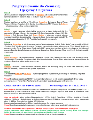 Pielgrzymowanie do Ziemskiej Ojczyzny Chrystusa Dzień 1 Zbiórka uczestników pielgrzymki na lotnisku w Warszawie lub dowóz autokarem na lotnisko i z lotniska dodatkowo płatne 50 zł/os. , a następnie wylot do Tel Avivu. Dzień 2 Przejazd autokarem z lotniska w Tel Avivie do Jerozolimy. Zwiedzanie: Ściana Płaczu, Wieczernik Pański (Msza św.), Grób Davida, Kościół Zaśnięcia NMP. Przejazd do Betlejem – zakwaterowanie w hotelu, posiłek, wypoczynek. Dzień 3 Jerycho – ponoć najstarsze miasto świata wymienione w starym testamencie jak i w ewangeliach (Drzewo Sykomory (św. Łukasza 4(5-8), Góra Kuszena (św. Łukasza 19(1-10)). Betania – Grób Łazarza (Msza św.). Morze Martwe – najwyższe zasolenie akwenu wodnego i największa depresja świata – plażowanie, kąpiel (temperatura wody około 24 ºC, temperatura powietrza około 28 ºC). Powrót do hotelu, posiłek, wypoczynek. Dzień 4 Zwiedzanie Jerozolimy, w której poznamy miejsce Wniebowstąpienia, Kościół „Pater Noster” oraz przepiękny Kościół „Dominus Flevit” i będziemy na Cmentarzu Żydowskim – wszystkie te obiekty położone są na Górze Oliwnej. W dniu tym poznamy również Ogród Oliwny, Grota Zdrady, Grób NMP, uczestniczyć będziemy w Drodze Krzyżowej na Via Dolorose i poznamy Bazylikę Grobu Pańskiego z wejściem na Golgotę i do Grobu Chrystusa (Msza św.). Powrót do hotelu, posiłek, wypoczynek. Dzień 5 Galilea – Nazaret – Bazylika Zwiastowania i Kościół św. Józefa, Cana Galilejska – miejsce 1-go cudu Jezusa Chrystusa, Tabga miejsce Prymatu św. Piotra (Msza św.), Góra Błogosławieństw, Dom św. Piotra w Capharnaum, Yardenit (dostęp do Jordanu) ). Powrót do hotelu, posiłek, wypoczynek. Dzień 6 Betlejem – Bazylika i Grota Narodzenia Chrystusa, Kościół św. Katarzyny, Groty św. Józefa i św. Hieronima, Grota Mleczna (Msza św.). Powrót do hotelu, posiłek, wypoczynek. Dzień 7 2.00 przejazd z Betlejem do Tel Avivu – odprawa paszportowo- bagażowa i wylot powrotny do Warszawy . Przylot do Warszawy. Uwaga! Dodatkowo odpłatnie za 10 USD / os. może być zrealizowany w dniu szóstym przejazd do Hebronu w celu zwiedzenia grobów Patriarchów (Abrahama Izaak i Jakuba) ale to zależy od sytuacji politycznej dnia. Ceny: 2600 zł + 260 USD od osoby Termin wyjazdu: 14 – 21.02.2012 r. Cena obejmuje: Przelot samolotem w obie strony, zakwaterowanie w hotelu - pokoje 2 – os. z łazienkami, pokoje 3 – os. z łazienkami na życzenie, śniadania od 3 -go do 6-go dnia i obiadokolację od 2-go do 6 dnia, posiłek w samolocie w cenie biletu w obie strony, ubezpieczenie KL i NNW. Cena nie obejmuje : wjazd na Górę Błogosławieństw 1 USD/os, Kościół Ojcze Nasz 2 USD/os., Kościół św. Piotra In Gallicantu 2 USD/os., płynięcie łodzią po Jeziorze Genezaret koszt 10 USD/os., - razem na wstępy należy przygotować około 15 USD/os. Do pokoju 1-os. dopłata 150 USD od os. Dopuszczalny bezpłatny bagaż to: 20 kg – bagaż główny oraz 5kg – bagaż podręczny Uwaga! Dodatkowo należy być przygotowanym na wpłatę kierowcy bakszyszu w wysokości 1 dolara dziennie. Uczestnik zobowiązany jest do posiadania ważnego paszportu przez sześć miesięcy od daty wyjazdu. Strój do zwiedzania miejsc świętych powinno cechować: zakryte ramiona, bardzo skromny dekolt oraz przykryte kolana (kobiety mogą być w spodniach) – poza miejscami świętymi strój dowolny. Uwaga! Uczestnicy pielgrzymki mogą dodatkowo ubezpieczyć się od chorób przewlekłych.