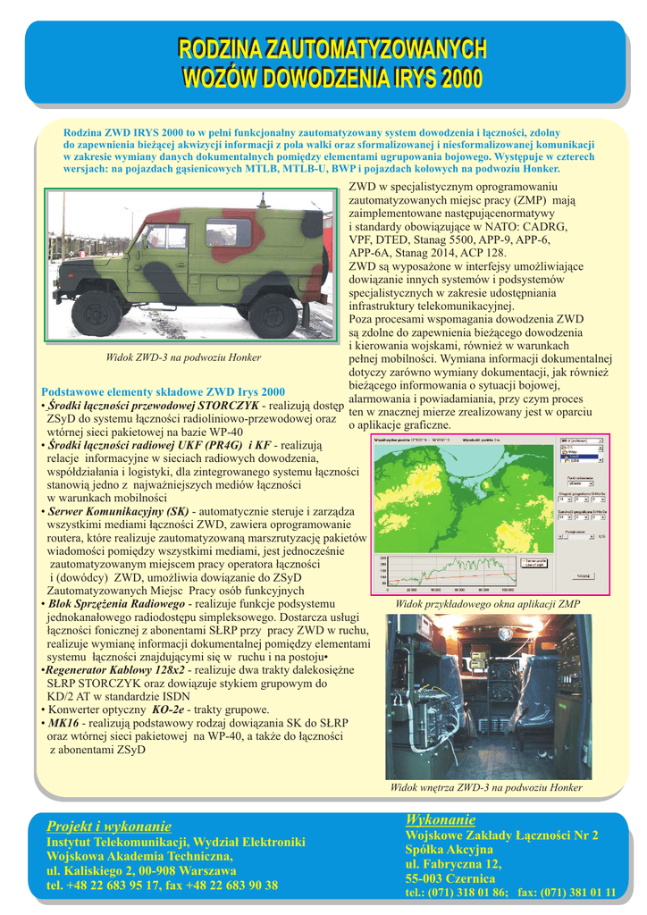 RODZINA ZAUTOMATYZOWANYCH WOZÓW DOWODZENIA IRYS 2000 Rodzina ZWD IRYS 2000 to w pełni funkcjonalny zautomatyzowany system dowodzenia i łączności, zdolny do zapewnienia bieżącej akwizycji informacji z pola walki oraz sformalizowanej i niesformalizowanej komunikacji w zakresie wymiany danych dokumentalnych pomiędzy elementami ugrupowania bojowego. Występuje w czterech wersjach: na pojazdach gąsienicowych MTLB, MTLB-U, BWP i pojazdach kołowych na podwoziu Honker. ZWD w specjalistycznym oprogramowaniu zautomatyzowanych miejsc pracy (ZMP) mają zaimplementowane następującenormatywy i standardy obowiązujące w NATO: CADRG, VPF, DTED, Stanag 5500, APP-9, APP-6, APP-6A, Stanag 2014, ACP 128. ZWD są wyposażone w interfejsy umożliwiające dowiązanie innych systemów i podsystemów specjalistycznych w zakresie udostępniania infrastruktury telekomunikacyjnej. Poza procesami wspomagania dowodzenia ZWD są zdolne do zapewnienia bieżącego dowodzenia i kierowania wojskami, również w warunkach Widok ZWD-3 na podwoziu Honker pełnej mobilności. Wymiana informacji dokumentalnej dotyczy zarówno wymiany dokumentacji, jak również bieżącego informowania o sytuacji bojowej, Podstawowe elementy składowe ZWD Irys 2000 alarmowania i powiadamiania, przy czym proces • Środki łączności przewodowej STORCZYK - realizują dostęp ten w znacznej mierze zrealizowany jest w oparciu ZSyD do systemu łączności radioliniowo-przewodowej oraz o aplikacje graficzne. wtórnej sieci pakietowej na bazie WP-40 • Środki łączności radiowej UKF (PR4G) i KF - realizują relacje informacyjne w sieciach radiowych dowodzenia, współdziałania i logistyki, dla zintegrowanego systemu łączności stanowią jedno z najważniejszych mediów łączności w warunkach mobilności • Serwer Komunikacyjny (SK) - automatycznie steruje i zarządza wszystkimi mediami łączności ZWD, zawiera oprogramowanie routera, które realizuje zautomatyzowaną marszrutyzację pakietów wiadomości pomiędzy wszystkimi mediami, jest jednocześnie zautomatyzowanym miejscem pracy operatora łączności i (dowódcy) ZWD, umożliwia dowiązanie do ZSyD Zautomatyzowanych Miejsc Pracy osób funkcyjnych Widok przykładowego okna aplikacji ZMP • Blok Sprzężenia Radiowego - realizuje funkcje podsystemu jednokanałowego radiodostępu simpleksowego. Dostarcza usługi łączności fonicznej z abonentami SŁRP przy pracy ZWD w ruchu, realizuje wymianę informacji dokumentalnej pomiędzy elementami systemu łączności znajdującymi się w ruchu i na postoju• •Regenerator Kablowy 128x2 - realizuje dwa trakty dalekosiężne SŁRP STORCZYK oraz dowiązuje stykiem grupowym do KD/2 AT w standardzie ISDN • Konwerter optyczny KO-2e - trakty grupowe. • MK16 - realizują podstawowy rodzaj dowiązania SK do SŁRP oraz wtórnej sieci pakietowej na WP-40, a także do łączności z abonentami ZSyD Widok wnętrza ZWD-3 na podwoziu Honker Projekt i wykonanie Instytut Telekomunikacji, Wydział Elektroniki Wojskowa Akademia Techniczna, ul. Kaliskiego 2, 00-908 Warszawa tel. +48 22 683 95 17, fax +48 22 683 90 38 Wykonanie Wojskowe Zakłady Łączności Nr 2 Spółka Akcyjna ul. Fabryczna 12, 55-003 Czernica tel.: (071) 318 01 86; fax: (071) 381 01 11