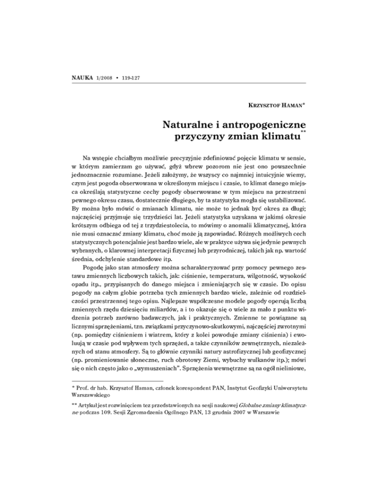 NAUKA 1/2008 • 119-127 KRZYSZTOF HAMAN* Naturalne i antropogeniczne przyczyny zmian klimatu** Na wstępie chciałbym możliwie precyzyjnie zdefiniować pojęcie klimatu w sensie, w którym zamierzam go używać, gdyż wbrew pozorom nie jest ono powszechnie jednoznacznie rozumiane. Jeżeli założymy, że wszyscy co najmniej intuicyjnie wiemy, czym jest pogoda obserwowana w określonym miejscu i czasie, to klimat danego miejsca określają statystyczne cechy pogody obserwowane w tym miejscu na przestrzeni pewnego okresu czasu, dostatecznie długiego, by ta statystyka mogła się ustabilizować. By można było mówić o zmianach klimatu, nie może to jednak być okres za długi; najczęściej przyjmuje się trzydzieści lat. Jeżeli statystyka uzyskana w jakimś okresie krótszym odbiega od tej z trzydziestolecia, to mówimy o anomalii klimatycznej, która nie musi oznaczać zmiany klimatu, choć może ją zapowiadać. Różnych możliwych cech statystycznych potencjalnie jest bardzo wiele, ale w praktyce używa się jedynie pewnych wybranych, o klarownej interpretacji fizycznej lub przyrodniczej, takich jak np. wartość średnia, odchylenie standardowe itp. Pogodę jako stan atmosfery można scharakteryzować przy pomocy pewnego zestawu zmiennych liczbowych takich, jak: ciśnienie, temperatura, wilgotność, wysokość opadu itp., przypisanych do danego miejsca i zmieniających się w czasie. Do opisu pogody na całym globie potrzeba tych zmiennych bardzo wiele, zależnie od rozdzielczości przestrzennej tego opisu. Najlepsze współczesne modele pogody operują liczbą zmiennych rzędu dziesięciu miliardów, a i to okazuje się o wiele za mało z punktu widzenia potrzeb zarówno badawczych, jak i praktycznych. Zmienne te powiązane są licznymi sprzężeniami, tzn. związkami przyczynowo-skutkowymi, najczęściej zwrotnymi (np. pomiędzy ciśnieniem i wiatrem, który z kolei powoduje zmiany ciśnienia) i ewoluują w czasie pod wpływem tych sprzężeń, a także czynników zewnętrznych, niezależnych od stanu atmosfery. Są to głównie czynniki natury astrofizycznej lub geofizycznej (np. promieniowanie słoneczne, ruch obrotowy Ziemi, wybuchy wulkanów itp.); mówi się o nich często jako o „wymuszeniach”. Sprzężenia wewnętrzne są na ogół nieliniowe, * Prof. dr hab. Krzysztof Haman, członek korespondent PAN, Instytut Geofizyki Uniwersytetu Warszawskiego ** Artykuł jest rozwinięciem tez przedstawionych na sesji naukowej Globalne zmiany klimatyczne podczas 109. Sesji Zgromadzenia Ogólnego PAN, 13 grudnia 2007 w Warszawie 120 Krzysztof Haman co w wielkim uproszczeniu oznacza, że skutki nie muszą być proporcjonalne do przyczyn, a łączny skutek działania kilku przyczyn nie jest prostym złożeniem skutków tych przyczyn rozpatrywanych oddzielnie. Należy pamiętać, że procesy atmosferyczne powiązane są z procesami zachodzącymi w oceanach i na powierzchni Ziemi, zwłaszcza w biosferze, i sprzężenia w tym zakresie także powinny być uwzględniane. Układ atmosfera–reszta Ziemi jest więc przykładem bardzo złożonego tzw. nieliniowego układu dynamicznego, jakich wiele spotykamy nie tylko w przyrodzie, ale także w życiu społecznym i gospodarczym. Podział źródeł zmienności układu na czynniki (wymuszenia) zewnętrzne i sprzężenia wewnętrzne jest w pewnym stopniu umowny i może nieco się różnić w różnych ujęciach modelowych. Szereg ważnych cech procesów atmosferycznych determinujących klimat i jego ewolucję wynika z ogólnych własności pewnej szerszej klasy nieliniowych układów dynamicznych, tzw. układów chaotycznych, do których układ atmosfera–reszta Ziemi należy. Spróbuję je przedstawić na przykładzie pewnego bardzo prostego układu, tzw. układu Lorenza. Posiada on tylko trzy zmienne, a więc jego ewolucję można przedstawić graficznie jako tor punktu w przestrzeni (ryc. 1). Ryc. 1. Jedna z trajektorii ilustrującej rozwiązanie układu Lorenza. Widoczne dwa „skrzydła” atraktora, na których ta trajektoria leży, oraz nagłe przeskoki z jednego skrzydła na drugie; można je interpretować jako nagłe zmiany „klimatu” w wyniku działania jedynie wewnętrznych sprzężeń układu Nie występują w nim czynniki zewnętrzne, co dodatkowo upraszcza jego strukturę. Jest to, nawiasem mówiąc, najstarszy model stworzony w latach sześćdziesiątych ubiegłego wieku do badań klimatologicznych, jeszcze bardzo prymitywnych. Warto też wspomnieć, że przy okazji stał się on zalążkiem tzw. teorii chaosu deterministycznego, o której zapewne wszyscy słyszeli, choć może nie wszyscy wiedzą, o co w niej dokładnie chodzi. Naturalne i antropogeniczne przyczyny zmian klimatu 121 Jak widać na rycinie tor ten leży na pewnej figurze geometrycznej (tzw. atraktorze), złożonej jakby z dwóch części podobnych do liścia czy skrzydła motyla. Jeżeli przyjmiemy, że odpowiednikiem klimatu jest statystyka położeń punktów na pewnym odcinku toru, to widać, że klimat ten jest w zasadzie zdeterminowany przez statystykę punktów na danym „liściu”. Przez większość czasu podlega on niewielkim wahaniom, na pewnych odcinkach w przybliżeniu okresowym. Od czasu do czasu następuje jednak nagły przeskok do zupełnie innego „klimatu” zdeterminowanego przez punkty drugiego „liścia”. Dzieje się to pod wpływem jedynie sprzężeń wewnętrznych, bez udziału czynników zewnętrznych! Odpowiednik tego zjawiska znany jest w paleoklimatologii w postaci nagłych zmian klimatu widocznych w śladach zachowanych w osadach z dawnych epok geologicznych. Gdybyśmy obejrzeli tory, których punkty startowe różniłyby się choćby dowolnie mało od punktu startowego toru przedstawionego na rycinie, okazałoby się, że tory te wprawdzie szybko się rozchodzą (tzw. efekt motyla – dowolnie małe błędy w określeniu stanu początkowego mogą prowadzić do dużych błędów w prognozie dalszej ewolucji układu), lec
