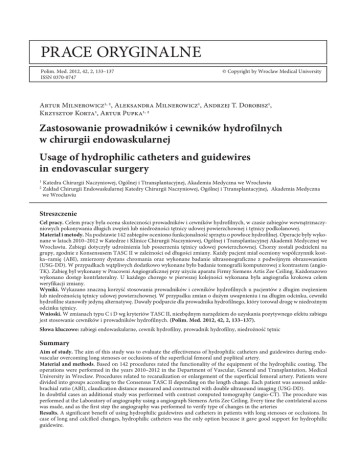 PRACE ORYGINALNE Polim. Med. 2012, 42, 2, 133–137 ISSN 0370-0747 © Copyright by Wroclaw Medical University Artur Milnerowicz1, 2, Aleksandra Milnerowicz1, Andrzej T. Dorobisz1, Krzysztof Korta1, Artur Pupka1, 2 Zastosowanie prowadników i cewników hydrofilnych w chirurgii endowaskularnej Usage of hydrophilic catheters and guidewires in endovascular surgery 1 2 Katedra Chirurgii Naczyniowej, Ogólnej i Ttransplantacyjnej, Akademia Medyczna we Wrocławiu Zakład Chirurgii Endowaskularnej Katedry Chirurgii Naczyniowej, Ogólnej i Ttransplantacyjnej, Akademia Medyczna we Wrocławiu Streszczenie Cel pracy. Celem pracy była ocena skuteczności prowadników i cewników hydrofilnych, w czasie zabiegów wewnątrznaczyniowych pokonywania długich zwężeń lub niedrożności tętnicy udowej powierzchownej i tętnicy podkolanowej. Materiał i metody. Na podstawie 142 zabiegów oceniono funkcjonalność sprzętu o powłoce hydrofilnej. Operacje były wykonane w latach 2010–2012 w Katedrze i Klinice Chirurgii Naczyniowej, Ogólnej i Transplantacyjnej Akademii Medycznej we Wrocławiu. Zabiegi dotyczyły udrożnienia lub poszerzenia tętnicy udowej powierzchownej. Chorzy zostali podzieleni na grupy, zgodnie z Konsensusem TASC II w zależności od długości zmiany. Każdy pacjent miał oceniony współczynnik kostka–ramię (ABI), zmierzony dystans chromania oraz wykonane badanie ultrasonograficzne z podwójnym obrazowaniem (USG-DD). W przypadkach wątpliwych dodatkowo wykonane było badanie tomografii komputerowej z kontrastem (angioTK). Zabieg był wykonany w Pracowni Angiograficznej przy użyciu aparatu Firmy Siemens Artis Zee Ceiling. Każdorazowo wykonano dostęp kontrlateralny. U każdego chorego w pierwszej kolejności wykonana była angiografia krokowa celem weryfikacji zmiany. Wyniki. Wykazano znaczną korzyść stosowania prowadników i cewników hydrofilnych u pacjentów z długim zwężeniem lub niedrożnością tętnicy udowej powierzchownej. W przypadku zmian o dużym uwapnieniu i na długim odcinku, cewniki hydrofilne stanowiły jedyną alternatywę. Dawały podparcie dla prowadnika hydrofilnego, który torował drogę w niedrożnym odcinku tętnicy. Wnioski. W zmianach typu C i D wg kryteriów TASC II, niezbędnym narzędziem do uzyskania pozytywnego efektu zabiegu jest stosowanie cewników i prowadników hydrofilnych. (Polim. Med. 2012, 42, 2, 133–137). Słowa kluczowe: zabiegi endowaskularne, cewnik hydrofilny, prowadnik hydrofilny, niedrożność tętnic Summary Aim of study. The aim of this study was to evaluate the effectiveness of hydrophilic catheters and guidewires during endovascular overcoming long stenoses or occlusions of the superficial femoral and popliteal artery. Material and methods. Based on 142 procedures rated the functionality of the equipment of the hydrophilic coating. The operations were performed in the years 2010–2012 in the Department of Vascular, General and Transplantation, Medical University in Wroclaw. Procedures related to recanalization or enlargement of the superficial femoral artery. Patients were divided into groups according to the Consensus TASC II depending on the length change. Each patient was assessed anklebrachial ratio (ABI), claudication distance measured and constructed with double ultrasound imaging (USG-DD). In doubtful cases an additional study was performed with contrast computed tomography (angio-CT). The procedure was performed at the Laboratory of angiography using a angiograph Siemens Artis Zee Ceiling. Every time the contrlateral access was made, and as the first step the angiography was performed to verify type of changes in the arteries Results. A significant benefit of using hydrophilic guidewires and catheters in patients with long stenoses or occlusions. In case of long and calcified changes, hydrophilic catheters was the only option because it gave good support for hydrophilic guidewire. 134 A. Milnerowicz i inni Conclusions. The changes in the type C and D according to the criteria for TASC II, an essential tool to achieve a positive treatment effect is the use of hydrophilic catheters and guidewires. (Polim. Med. 2012, 42, 2, 133–137) Key words: endovascular procedures, hydrophilic guidewires and catheters, vessel occlusion. Na przestrzeni ostatnich 10 lat znacznie zmieniło się oblicze chirurgii naczyniowej. Jeszcze do niedawna podstawową techniką operacyjną były rozległe zabiegi wymagające otwarcia jamy brzusznej, uzyskanie szerokiego dostępu do tętnicy udowej wspólnej czy dołu podkolanowego. Wraz z rozwojem nieinwazyjnych i inwazyjnych technik obrazowania naczyń, rozpoczęła się nowa era zabiegów małoinwazyjnych. Angiografia klasyczna została zastąpiona angiografią subtrakcyjną, a dzięki zmniejszeniu dawki promieniowania jonizującego zabiegi te stały sie bardziej powszechne. Z końcem XX wieku wydano międzynarodowe zalecenia (TASC), dotyczące wskazań leczenia chorych z przewlekłym niedokrwieniem kończyn dolnych [1]. Podział na grupy w zależności od lokalizacji i długości zmiany stał się kluczowym kanonem kwalifikacji do zabiegu. Kolejne lata pokazały jednak, że granice, które zostały nakreślone nie są tymi ostatecznymi. Rozwój technologii medycznej i produkcji coraz to doskonalszych prowadników i cewników diagnostycznych, przyczynił się do rozszerzenia wskazań dla chirurgii endowaskularnej. Stworzony nowy consensus TASC II, potwierdził światowy trend do próby udrożnienia coraz to dłuższych i trudniejszych niedrożności [2]. Tematem niniejszego opracowania jest ocena korzyści wynikająca z zastosowania cewników i prowadników hydrofilnych, w porównaniu do stosowanych standartowych cewników Materiał i metody Procedury wewnątrznaczyniowe w znieczuleniu miejscowym wykonywano na sali hybrydowej Zakładu Chirurgii Endowaskularnej Kliniki Chirurgii Naczyniowej, Ogólnej i Transplantacyjnej Akademii Medycznej we Wrocławiu.W latach 2010–2012 wykonano 142 