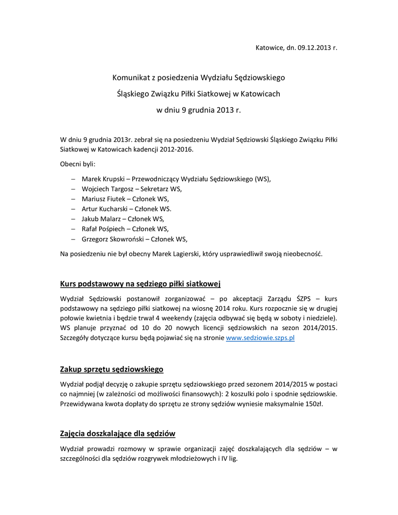 Katowice, dn. 09.12.2013 r. Komunikat z posiedzenia Wydziału Sędziowskiego Śląskiego Związku Piłki Siatkowej w Katowicach w dniu 9 grudnia 2013 r. W dniu 9 grudnia 2013r. zebrał się na posiedzeniu Wydział Sędziowski Śląskiego Związku Piłki Siatkowej w Katowicach kadencji 2012-2016. Obecni byli: − − − − − − − Marek Krupski – Przewodniczący Wydziału Sędziowskiego (WS), Wojciech Targosz – Sekretarz WS, Mariusz Fiutek – Członek WS, Artur Kucharski – Członek WS. Jakub Malarz – Członek WS, Rafał Pośpiech – Członek WS, Grzegorz Skowroński – Członek WS, Na posiedzeniu nie był obecny Marek Lagierski, który usprawiedliwił swoją nieobecność. Kurs podstawowy na sędziego piłki siatkowej Wydział Sędziowski postanowił zorganizować – po akceptacji Zarządu ŚZPS – kurs podstawowy na sędziego piłki siatkowej na wiosnę 2014 roku. Kurs rozpocznie się w drugiej połowie kwietnia i będzie trwał 4 weekendy (zajęcia odbywać się będą w soboty i niedziele). WS planuje przyznać od 10 do 20 nowych licencji sędziowskich na sezon 2014/2015. Szczegóły dotyczące kursu będą pojawiać się na stronie www.sedziowie.szps.pl Zakup sprzętu sędziowskiego Wydział podjął decyzję o zakupie sprzętu sędziowskiego przed sezonem 2014/2015 w postaci co najmniej (w zależności od możliwości finansowych): 2 koszulki polo i spodnie sędziowskie. Przewidywana kwota dopłaty do sprzętu ze strony sędziów wyniesie maksymalnie 150zł. Zajęcia doszkalające dla sędziów Wydział prowadzi rozmowy w sprawie organizacji zajęć doszkalających dla sędziów – w szczególności dla sędziów rozgrywek młodzieżowych i IV lig. Weryfikacja badań lekarskich Wydział Sędziowski uczula sędziów i prosi o zwrócenie szczególnej uwagi podczas weryfikacji badań lekarskich (w szczególności dat i uprawnień lekarzy). W przypadku wątpliwości bardzo prosimy, aby sędziowie S1 i S2 sprawdzali dokumenty wspólnie, a jeśli mają zastrzeżenia, aby opisali wszelkie niejasności w protokole zawodów w rubryce Uwagi. Propozycje zmian w regulaminach obsad i rozgrywek Wydział zaakceptował przedstawione przez Przewodniczącego Referatu Obsad kol. Jakuba Malarza propozycje zmian w „Zasadach funkcjonowania Systemu Obsad ŚZPS”. Zasady te zostaną opublikowane w najbliższym czasie w „Informatorze dla sędziów ŚZPS na sezon 2013/2014”. W/w zasady stanowią załącznik do niniejszego komunikatu i obowiązują od jego publikacji. Wydział pozytywnie zaopiniował również proponowane zmiany w Regulaminach rozgrywek i delegował kol. Jakuba Malarza do rozmów z Przewodniczącym Wydziału Rozgrywek w temacie wprowadzenia zmian w życie. Referat Obsad zwraca się do wszystkich sędziów z prośbą o zapoznanie się i przestrzeganie przygotowanych zasad. W szczególności dotyczy to sposobu dokonywania zamian (i informowania o tym fakcie) oraz uzupełniania wyników spotkań. Zauważone nieprawidłowości będą zgłaszane Wydziałowi Sędziowskiemu. Termin kursokonferencji przed sezonem 2014/2015 Wydział ustalił wstępny termin Kursokonferencji szkoleniowej przed sezonem 2014/2015 na 6-7 września 2014r. Ostateczny termin zostanie podany po otrzymaniu informacji o terminie Kursokonferencji Sędziów Szczebla Centralnego PZPS. Prośba kol. Janusza Podgórskiego Wydział nie przychylił się do prośby kol. Janusza Podgórskiego o podwyższenie uprawnień z IV na III K. Wydział przypomina, że informacja o nałożonej przez Zarząd ŚZPS karze zawieszenia na okres 6 miesięcy znajduje się w Komunikacie z posiedzenia Wydziału Sędziowskiego z dnia 15 marca 2012 roku. Zgodnie z Regulaminem Sędziego ŚZPS - §14, punkt 4 – konsekwencją zawieszenia w prawach Sędziego ŚZPS jest obniżenie od początku kolejnego sezonu uprawnień sędziowskich w rozgrywkach SZPS o jeden szczebel. Jednocześnie Wydział Sędziowski postanowił dopisać kol. Janusza Podgórskiego do listy osób obserwowanych pod kątem zmiany uprawnień po sezonie 2013/2014. Sprawy dyscyplinarne Tomasz Godlewicz W związku z brakiem wyjaśnień, Wydział Sędziowski postanowił zwrócić się do Wydziału Dyscypliny z prośbą o rozpatrzenie nieobecności kol. Tomasza Godlewicza na meczu kadetów w Raciborzu w dniu 15.11.2013r. Mirosław Piecuch Wydział postanowił zwrócić się do Wydziału Dyscypliny z prośbą o rozpatrzenie nieobecności kol. Mirosława Piecucha na turnieju młodziczek w Dąbrowie Górniczej w dniu 24.11.2014r. Barbara Nowrotek Wydział postanowił wstrzymać obsady do końca roku 2013r kol. Barbarze Nowrotek i zwrócić się z prośbą o wyjaśnienie nieregulaminowych zamian w dniach: 30.11.2013r. (obsada pomocnicza na meczu w Dąbrowie Górniczej), 1.12.2013r. (obsada pomocnicza na meczu w Sosnowcu) oraz 7.12.2013r. (turniej młodziczek w Gliwicach) Załącznik nr 1. Zasady funkcjonowania Systemu Obsad ŚZPS 1. Sędziowie są nominowani na spotkania na podstawie Komunikatów rozgrywek publikowanych przez Wydział Rozgrywek ŚZPS na stronie www.szps.pl, w terminach wyznaczonych, a także na podstawie komunikatów PZPS oraz PLPS w zakresie obsad pomocniczych. Obsady publikowane są w internecie w Systemie Obsad ŚZPS pod adresem www.system.szps.pl 2. Aktualny skład Referatu Obsad z podziałem na kategorie rozgrywek, powołany na wniosek Przewodniczącego Referatu Obsad przez Wydział Sędziowski jest dostępny wraz z danymi kontaktowymi na stronie www.system.szps.pl. 3. Zaleca się, aby sędziowie uzupełnili w Systemie Obsad adres e-mail i aktualny numer telefonu kontaktowego. Na adres e-mail sędzia otrzymuje powiadomienia o nowych obsadach oraz o zmianach dokonywanych w ramach posiadanych obsad (w tym także o wyznaczeniu jako sędzia rezerwowy). Numer telefonu jest potrzebny do kontaktu w sytuacjach awaryjnych. 4. Minimalna ilość spotkań w danych sezonie została określona przez WS w osobnym komunikacie. W liczbę tę wliczane są spotkania sędziow