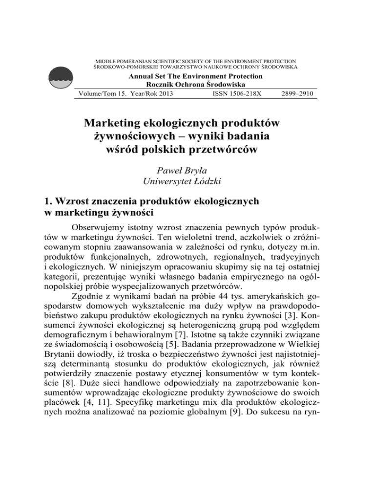 MIDDLE POMERANIAN SCIENTIFIC SOCIETY OF THE ENVIRONMENT PROTECTION ŚRODKOWO-POMORSKIE TOWARZYSTWO NAUKOWE OCHRONY ŚRODOWISKA Annual Set The Environment Protection Rocznik Ochrona Środowiska Volume/Tom 15. Year/Rok 2013 ISSN 1506-218X 2899–2910 Marketing ekologicznych produktów żywnościowych – wyniki badania wśród polskich przetwórców Paweł Bryła Uniwersytet Łódzki 1. Wzrost znaczenia produktów ekologicznych w marketingu żywności Obserwujemy istotny wzrost znaczenia pewnych typów produktów w marketingu żywności. Ten wieloletni trend, aczkolwiek o zróżnicowanym stopniu zaawansowania w zależności od rynku, dotyczy m.in. produktów funkcjonalnych, zdrowotnych, regionalnych, tradycyjnych i ekologicznych. W niniejszym opracowaniu skupimy się na tej ostatniej kategorii, prezentując wyniki własnego badania empirycznego na ogólnopolskiej próbie wyspecjalizowanych przetwórców. Zgodnie z wynikami badań na próbie 44 tys. amerykańskich gospodarstw domowych wykształcenie ma duży wpływ na prawdopodobieństwo zakupu produktów ekologicznych na rynku żywności [3]. Konsumenci żywności ekologicznej są heterogeniczną grupą pod względem demograficznym i behawioralnym [7]. Istotne są także czynniki związane ze świadomością i osobowością [5]. Badania przeprowadzone w Wielkiej Brytanii dowiodły, iż troska o bezpieczeństwo żywności jest najistotniejszą determinantą stosunku do produktów ekologicznych, jak również potwierdziły znaczenie postawy etycznej konsumentów w tym kontekście [8]. Duże sieci handlowe odpowiedziały na zapotrzebowanie konsumentów wprowadzając ekologiczne produkty żywnościowe do swoich placówek [4, 11]. Specyfikę marketingu mix dla produktów ekologicznych można analizować na poziomie globalnym [9]. Do sukcesu na ryn- 2900 Paweł Bryła ku produktów ekologicznych przyczynia się uzyskanie certyfikatu jakości [1]. Według A. Graczyka i K. Mazurek-Łopacińskiej rozwój rynków produktów ekologicznych w Europie jest pobudzany przez przyjęcie strategii zrównoważonego rozwoju UE, której realizacja zależy od czynników kulturowych [6]. B. Pilarczyk i R. Nestorowicz wskazują, iż rynek żywności ekologicznej w Polsce znajduje się w początkowej fazie rozwoju, a podmioty działające na tym rynku w niewielkim stopniu korzystają z doświadczeń przedsiębiorstw zorientowanych marketingowo [10]. Wyniki badań S. Żakowskiej-Biemans wskazują na znaczenie orientacji konsumentów w procesie zakupu żywności ekologicznej w Polsce. Osoby otwarte na nowości są bardziej skłonne do wyboru tego typów produktów. Polscy konsumenci definiują żywność ekologiczną w oparciu o czynnik zdrowotności i bezpieczeństwa [12]. 2. Charakterystyka próby badanej W celu przeanalizowania strategii marketingowych w zakresie oferowania produktów ekologicznych na rynku żywności skierowano ankietę internetową do polskich producentów żywności ekologicznej. Populacja badana objęła wszystkie 282 podmioty, które uzyskały status przetwórcy1 żywności ekologicznej w wykazie Ministerstwa Rolnictwa i Rozwoju Wsi i posiadały adres e-mailowy. Efektywna stopa zwrotu wyniosła 7–10% w zależności od pytania, co można uznać za satysfakcjonujący wynik dla tego rodzaju badań. W badanej próbie polskich producentów żywności ekologicznej dominują firmy działające w formie spółki z ograniczoną odpowiedzialnością (30%) i osoby fizyczne prowadzące działalność gospodarczą (25%). Na trzeciej pozycji znalazły się gospodarstwa rolne (15%), następnie organizacje producentów (10%) i spółki cywilne (10%). W próbie jest także spółdzielnia i spółka jawna. Tylko jeden badany podmiot jest powiązany kapitałowo z partnerem zagranicznym. Badana próba producentów żywności ekologicznej ma ogólnopolski charakter. Jest w niej reprezentowanych 11 województw. Najwięcej jednostek badania pochodzi z województw: mazowieckiego, wielkopolskiego i dolnośląskiego. 1 W niniejszym opracowaniu używamy zamiennie sformułowań „producent” i „przetwórca” żywności ekologicznej, gdyż interesują nas strategie marketingowe firm oferujących produkty ekologiczne dla gospodarstw domowych. Marketing ekologicznych produktów żywnościowych… 2901 Badane podmioty powstawały najczęściej w latach dziewięćdziesiątych. Połowa organizacji objętych badaniem została utworzona do 1993 r., przeważnie w okresie tworzenia się zrębów współczesnej gospodarki wolnorynkowej w Polsce. ¼ podmiotów znajdujących się w próbie badanej utworzono po 1999 r., Najstarsza jednostka badania powstała w 1908 r., a najmłodsza – w 2010 r. Polscy producenci żywności ekologicznej, którzy uzyskali wpis do rejestru Ministerstwa Rolnictwa i Rozwoju Wsi, posiadają zatem z reguły kilkunastoletnie doświadczenie w prowadzeniu działalności gospodarczej. Są to często firmy, które powołano do życia w okresie transformacji systemowej w Polsce i które zdołały wypracować sobie stabilną pozycję na rynku. Badane podmioty były bardzo zróżnicowane pod względem wielkości zatrudnienia. Ich wielkość znajdowała się w przedziale od 1 do 500 osób. Średnia wyniosła 81 osób, a mediana 13,5. ¼ badanych organizacji liczyła do 8 członków/pracowników (w zależności od formy instytucjonalno-prawnej), a ¼ – powyżej 75. W badanej próbie dominowały zatem mikro- i małe przedsiębiorstwa. Interpretacja tych danych wymaga jedna zastrzeżenia, iż czasem podana liczba dotyczy członkostwa w organizacji producentów. W badanej próbie polskich producentów żywności ekologicznej dominują przedsiębiorstwa zajmujące się przetwórstwem surowców pochodzenia roślinnego. Firmy z branży owocowo-warzywnej stanowią ponad 1/3 badanych, na drugiej pozycji są przedsiębiorstwa przetwórstwa zbożowego, a następnie przedstawiciele piekarnictwa. Firmy mleczarskie stanowią 11% próby badanej. Ponadto w próbie znalaz