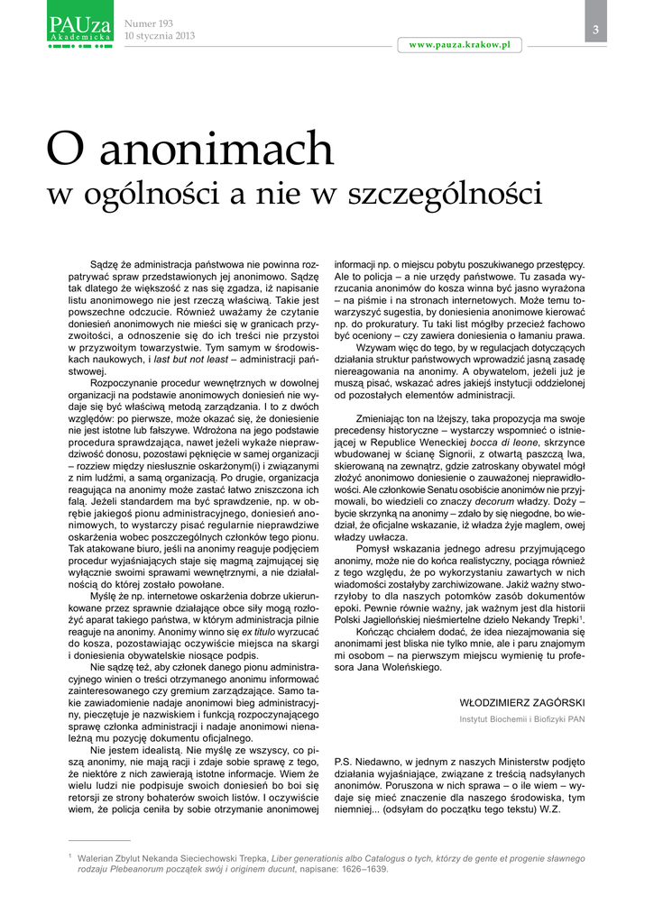 Numer 193 10 stycznia 2013 3 www.pauza.krakow.pl O anonimach w ogólności a nie w szczególności Sądzę że administracja państwowa nie powinna rozpatrywać spraw przedstawionych jej anonimowo. Sądzę tak dlatego że większość z nas się zgadza, iż napisanie listu anonimowego nie jest rzeczą właściwą. Takie jest powszechne odczucie. Również uważamy że czytanie doniesień anonimowych nie mieści się w granicach przyzwoitości, a odnoszenie się do ich treści nie przystoi w przyzwoitym towarzystwie. Tym samym w środowis kach naukowych, i last but not least – administracji państwowej. Rozpoczynanie procedur wewnętrznych w dowolnej organizacji na podstawie anonimowych doniesień nie wydaje się być właściwą metodą zarządzania. I to z dwóch względów: po pierwsze, może okazać się, że doniesienie nie jest istotne lub fałszywe. Wdrożona na jego podstawie procedura sprawdzająca, nawet jeżeli wykaże nieprawdziwość donosu, pozostawi pęknięcie w samej organizacji – rozziew między niesłusznie oskarżonym(i) i związanymi z nim ludźmi, a samą organizacją. Po drugie, organizacja reagująca na anonimy może zastać łatwo zniszczona ich falą. Jeżeli standardem ma być sprawdzenie, np. w obrębie jakiegoś pionu administracyjnego, doniesień anonimowych, to wystarczy pisać regularnie nieprawdziwe oskarżenia wobec poszczególnych członków tego pionu. Tak atakowane biuro, jeśli na anonimy reaguje podjęciem procedur wyjaśniających staje się magmą zajmującej się wyłącznie swoimi sprawami wewnętrznymi, a nie działalnością do której zostało powołane. Myślę że np. internetowe oskarżenia dobrze ukierun kowane przez sprawnie działające obce siły mogą rozło żyć aparat takiego państwa, w którym administracja pilnie reaguje na anonimy. Anonimy winno się ex titulo wyrzucać do kosza, pozostawiając oczywiście miejsca na skargi i doniesienia obywatelskie niosące podpis. Nie sądzę też, aby członek danego pionu administracyjnego winien o treści otrzymanego anonimu informować zainteresowanego czy gremium zarządzające. Samo takie zawiadomienie nadaje anonimowi bieg administracyjny, pieczętuje je nazwiskiem i funkcją rozpoczynającego sprawę członka administracji i nadaje anonimowi nienależną mu pozycję dokumentu oficjalnego. Nie jestem idealistą. Nie myślę ze wszyscy, co pi szą anonimy, nie mają racji i zdaje sobie sprawę z tego, że niektóre z nich zawierają istotne informacje. Wiem że wielu ludzi nie podpisuje swoich doniesień bo boi się retorsji ze strony bohaterów swoich listów. I oczywiście wiem, że policja ceniła by sobie otrzymanie anonimowej 1 informacji np. o miejscu pobytu poszukiwanego przestępcy. Ale to policja – a nie urzędy państwowe. Tu zasada wyrzucania anonimów do kosza winna być jasno wyrażona – na piśmie i na stronach internetowych. Może temu towarzyszyć sugestia, by doniesienia anonimowe kierować np. do prokuratury. Tu taki list mógłby przecież fachowo być oceniony – czy zawiera doniesienia o łamaniu prawa. Wzywam więc do tego, by w regulacjach dotyczących działania struktur państwowych wprowadzić jasną zasadę niereagowania na anonimy. A obywatelom, jeżeli już je muszą pisać, wskazać adres jakiejś instytucji oddzielonej od pozostałych elementów administracji. Zmieniając ton na lżejszy, taka propozycja ma swoje precedensy historyczne – wystarczy wspomnieć o istniejącej w Republice Weneckiej bocca di leone, skrzynce wbudowanej w ścianę Signorii, z otwartą paszczą lwa, skierowaną na zewnątrz, gdzie zatroskany obywatel mógł złożyć anonimowo doniesienie o zauważonej nieprawidłowości. Ale członkowie Senatu osobiście anonimów nie przyjmowali, bo wiedzieli co znaczy decorum władzy. Doży – bycie skrzynką na anonimy – zdało by się niegodne, bo wie dział, że oficjalne wskazanie, iż władza żyje maglem, owej władzy uwłacza. Pomysł wskazania jednego adresu przyjmującego anonimy, może nie do końca realistyczny, pociąga również z tego względu, że po wykorzystaniu zawartych w nich wiadomości zostałyby zarchiwizowane. Jakiż ważny stwo rzyłoby to dla naszych potomków zasób dokumentów epoki. Pewnie równie ważny, jak ważnym jest dla historii Polski Jagiellońskiej nieśmiertelne dzieło Nekandy Trepki 1. Kończąc chciałem dodać, że idea niezajmowania się anonimami jest bliska nie tylko mnie, ale i paru znajomym mi osobom – na pierwszym miejscu wymienię tu profesora Jana Woleńskiego. Włodzimierz Zagórski Instytut Biochemii i Biofizyki PAN P.S. Niedawno, w jednym z naszych Ministerstw podjęto działania wyjaśniające, związane z treścią nadsyłanych anonimów. Poruszona w nich sprawa – o ile wiem – wydaje się mieć znaczenie dla naszego środowiska, tym niemniej... (odsyłam do początku tego tekstu) W.Z. Walerian Zbylut Nekanda Sieciechowski Trepka, Liber generationis albo Catalogus o tych, którzy de gente et progenie sławnego rodzaju Plebeanorum początek swój i originem ducunt, napisane: 1626–1639.