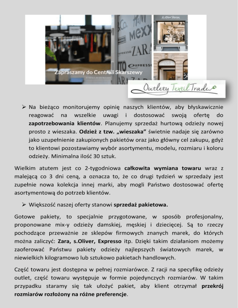 Na bieżąco monitorujemy opinię naszych klientów, aby błyskawicznie reagować na wszelkie uwagi i dostosować swoją ofertę do zapotrzebowania klientów. Planujemy sprzedaż hurtową odzieży nowej prosto z wieszaka. Odzież z tzw. „wieszaka” świetnie nadaje się zarówno jako uzupełnienie zakupionych pakietów oraz jako główny cel zakupu, gdyż to klientowi pozostawiamy wybór asortymentu, modelu, rozmiaru i koloru odzieży. Minimalna ilość 30 sztuk. Wielkim atutem jest co 2-tygodniowa całkowita wymiana towaru wraz z malejącą co 3 dni ceną, a oznacza to, że co drugi tydzień w sprzedaży jest zupełnie nowa kolekcja innej marki, aby mogli Państwo dostosować ofertę asortymentową do potrzeb klientów. Większość naszej oferty stanowi sprzedaż pakietowa. Gotowe pakiety, to specjalnie przygotowane, w sposób profesjonalny, proponowane mix-y odzieży damskiej, męskiej i dziecięcej. Są to rzeczy pochodzące przeważnie ze sklepów firmowych znanych marek, do których można zaliczyć: Zara, s.Oliver, Expresso itp. Dzięki takim działaniom możemy zaoferować Państwu pakiety odzieży najlepszych światowych marek, w niewielkich kilogramowo lub sztukowo pakietach handlowych. Część towaru jest dostępna w pełnej rozmiarówce. Z racji na specyfikę odzieży outlet, część towaru występuje w formie pojedynczych rozmiarów. W takim przypadku staramy się tak ułożyć pakiet, aby klient otrzymał przekrój rozmiarów rozłożony na różne preferencje.
