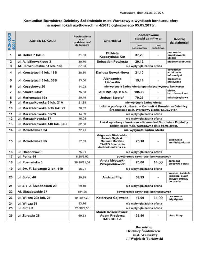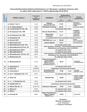 Warszawa, dnia 24.06.2015 r. KONKURS 4/2015 Komunikat Burmistrza Dzielnicy Śródmieście m.st. Warszawy o wynikach konkursu ofert na najem lokali użytkowych nr 4/2015 ogłoszonego 05.05.2015r. ADRES LOKALU Powierzchnia w m2 podstawowa/ dodatkowa OFERENCI Zaoferowane stawki za m2 w zł pow. podstawowa pow. dodatkowa Rodzaj działalności 1 ul. Dobra 7 lok. 8 31,63 Elżbieta Kapczyńska-Kot 37,20 - pracownia projektowania ubioru 2 3 ul. A. Idźkowskiego 3 Al. Jerozolimskie 51 lok. 19a 30,70 Sebastian Powierża 20,12 - pracownia obuwia 4 pl. Konstytucji 5 lok. 18B 28,80 Dariusz Nowak-Nova 21,10 - 5 pl. Konstytucji 5 lok. 36B 33,00 Aleksandra Lisowska 15,11 - 6 ul. Koszykowa 20 14,03 nie wpłynęła żadna oferta spełniająca wymogi konkursu 7 pl. Krucza 23/31 75,53 TARTINKI sp. z o.o. 195,00 - bistro, bar z kanapkami 8 ul. Mariensztat 19a 20,49 Jędrzej Stępień 79,23 - szkoła językowa 9 ul. Marszałkowska 6 lok. 21A 21,88 10 ul. Marszałkowska 9/15 lok. 29 70,32 nie wpłynęła żadna oferta Lokal wycofany z konkursu – Komunikat Burmistrza Dzielnicy Śródmieście m.st. Warszawy z dnia 13.05.2015r. 11 12 ul. Marszałkowska 55/73 ul. Marszałkowska 87 14,69 nie wpłynęła żadna oferta 16,08 13 ul. Marszałkowska 140 lok. 37C 62,66 nie wpłynęła żadna oferta Lokal wycofany z konkursu – Komunikat Burmistrza Dzielnicy Śródmieście m.st. Warszawy z dnia 08.06.2015r. 14 ul. Mokotowska 24 77,21 nie wpłynęła żadna oferta 27,83 15 ul. Mokotowska 55 57,33 16 17 ul. Oleandrów 6 ul. Polna 44 75,91 6,28/3,92 doradztwo w zakresie informatyki pracownia plastyczna nie wpłynęła żadna oferta Małgorzata Niedzielska, Jolanta Szybiak, Mateusz Morski – TAKTO Pracownia Architektoniczna s.c. 25,10 - pracownia architektoniczna nie wpłynęła żadna oferta powtórzenie czynności konkursowych Aneta MroczekPrzepiórkiewicz sprzedaż pieczywa i ciast 18 ul. Poznańska 3 19 ul. św. F. Salezego 2 lok. 110 25,01 20 ul. Solec 46 20,99 21 ul. J. i J. Śniadeckich 20 29,40 nie wpłynęła żadna oferta 22 Al. Ujazdowskie 37 184,26 powtórzenie czynności konkursowych 23 ul. Wilcza 29a lok. 21 24 ul. Wilcza 51 25 ul. Złota 3 26 ul. Żurawia 26 36,10/11,04 84,40/7,29 70,00 14,00 nie wpłynęła żadna oferta Andrzej Filip 39,99 Katarzyna Gajewska 16,00 - 14,00 83,76 nie wpłynęła żadna oferta 21,39/2,53 nie wpłynęła żadna oferta 69,63 Marek Kościkiewicz, Adam Przybysz BASICO s.c. 33,50 - Burmistrz Dzielnicy Śródmieście m.st. Warszawy /-/ Wojciech Turkowski krawiec, kaletnik, kuśnierz, punkt przyjęć odzieży do prania pracownia artystyczna biuro firmy