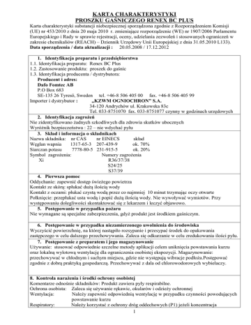 KARTA CHARAKTERYSTYKI PROSZKU GAŚNICZEGO RENEX BC PLUS Karta charakterystyki substancji niebezpiecznej sporządzona zgodnie z Rozporządzeniem Komisji (UE) nr 453/2010 z dnia 20 maja 2010 r. zmieniające rozporządzenie (WE) nr 1907/2006 Parlamentu Europejskiego i Rady w sprawie rejestracji, oceny, udzielania zezwoleń i stosowanych ograniczeń w zakresie chemikaliów (REACH) – Dziennik Urzędowy Unii Europejskiej z dnia 31.05.2010 L133). Data sporządzenia / data aktualizacji : 20.05.2008 / 17.12.2012 1. Identyfikacja preparatu i przedsiębiorstwa 1.1. Identyfikacja preparatu: Renex BC Plus 1.2. Zastosowanie produktu: proszek do gaśnic 1.3. Identyfikacja producenta / dystrybutora: Producent i adres: Dafo Fomtec AB P.O Box 683 SE-135 26 Tyresö, Sweden tel. +46-8 506 405 00 fax. +46-8 506 405 99 Importer i dystrybutor : „KZWM OGNIOCHRON” S.A. 34-120 Andrychów ul. Krakowska 83c Tel. 033-8751070 fax. 033-8751077 czynny w godzinach urzędowych 2. Identyfikacja zagrożeń Nie zidentyfikowano żadnych szkodliwych dla zdrowia skutków ubocznych Wyróżnik bezpieczeństwa : 22 – nie wdychać pyłu 3. Skład i informacja o składnikach Nazwa składnika: nr CAS nr EINECS skład Węglan wapnia 1317-65-3 207-439-9 ok. 70% Siarczan potasu 7778-80-5 231-915-5 ok. 20% Symbol zagrożenia: Numery zagrożenia Xi R36/37/38 S24/25 S37/39 4. Pierwsza pomoc Oddychanie: zapewnić dostęp świeżego powietrza Kontakt ze skórą: spłukać dużą ilością wody Kontakt z oczami: płukać czystą wodą przez co najmniej 10 minut trzymając oczy otwarte Połknięcie: przepłukać usta wodą i popić dużą ilością wody. Nie wywoływać wymiotów. Przy występowaniu dolegliwości skontaktować się z lekarzem i leczyć objawowo. 5. Postępowanie w przypadku pożaru Nie wymagane są specjalne zabezpieczenia, gdyż produkt jest środkiem gaśniczym. 6. Postępowanie w przypadku niezamierzonego uwolnienia do środowiska Wyczyścić powierzchnię, na której nastąpiło rozsypanie i przesypać środek do opakowania zastępczego w celu dalszego przechowywania. Zaleca się odkurzanie w celu zredukowania ilości pyłu. 7. Postępowanie z preparatem i jego magazynowanie Używanie: stosować odpowiednie szczelne metody aplikacji celem uniknięcia powstawania kurzu oraz lokalną wylotową wentylację dla ograniczenia osobistej ekspozycji. Magazynowanie: przechowywać w chłodnym i suchym miejscu, gdzie nie występują wibracje podłoża.Postępować zgodnie z dobrą praktyką gospodarczą. Przechowywać z dala od chlorowodorowych wybielaczy. 8. Kontrola narażenia i środki ochrony osobistej Komentarze odnośnie składników: Produkt zawiera pyły respirabilne. Ochrona osobista: Zaleca się używanie rękawic, okularów i odzieży ochronnej Wentylacja: Należy zapewnić odpowiednią wentylację w przypadku czynności powodujących powstawanie kurzu Respiratory: Należy korzystać z ochrony dróg oddechowych (P1) jeżeli koncentracja 1 przekracza dozwolony poziom Rękawice ochronne: Nie określono zabezpieczenia rąk, jednakże zaleca się stosowanie rękawic. Należy używać rękawic wykonanych z materiałów nieprzepuszczalnych Ochrona oczu: Stosować okulary ochronne do zastosowań chemicznych, gdzie prawdopodobieństwo zanieczyszczenia oczu jest wysokie Praktyki higienicznej pracy: Po zakończeniu każdej zmiany oraz przed posiłkami, przerwą na papierosa i przed korzystaniem z toalety należy umyć ręce Dopuszczalne stężenia wg Rozporządzenia Ministra Pracy i Polityki Społecznej z dnia 29.11.2002r. w sprawie najwyższych dopuszczalnych stężeń i natężeń czynników szkodliwych dla zdrowia w środowisku pracy (Dz.U. nr 217 poz. 1833) : - Inne nietrujące pyły przemysłowe - w tym zawierające wolną (krystaliczną) krzemionkę poniżej 2% - pył całkowity NDS 10 mg/m3 9. Właściwości fizykochemiczne Postać: drobny, biały lub kolorowany proszek Zapach: bez zapachu pH: 4,5 -5 Gęstość: gęstość nasypowa 1000÷1300 kg/m3 Rozpuszczalność: rozpuszczalny w wodzie, ale dodatek silikonu opóźnia rozpuszczanie Palność: niepalny Rozkład: w 190oC w strefie ognia 10. Stabilność i reaktywność Wchodzi w reakcje z kwasami wydzielając jako produkt reakcji dwutlenek węgla. Jeżeli proszek zwilgotnieje lub stwardnieje przestaje się nadawać do gaszenia pożarów. 11. Informacje toksykologiczne Dane z badań toksykologicznych: doustnie, szczur, LD50 oczy, królik, silne podrażnienia Węglan wapnia: 6450mg/kg 750μg/24 godz. Siarczan potasu: 6600mg/kg Połkniecie: nie stwierdzono szkodliwego działania Kontakt ze skórą: może spowodować lekkie podrażnienia Wdychanie: długotrwałe wdychanie może mieć szkodliwy wpływ na pracę płuc Kontakt z oczami: pył może spowodować podrażnienia 12. Informacje ekologiczne Ponieważ produkt rozpuszcza się w wodzie, może spowodować podwyższenie czynnika pH przy wydaleniu do zbiorników wodnych. W przypadku przedostania się dużych ilości do zbiornika wodnego, zawiadomić właściwe organy. 13. Postępowanie z odpadami Usuwać nadmiar środka i zanieczyszczone opakowania zgodnie z przepisami prawnymi władz lokalnych i państwowych. Nie usuwać razem z kwasami. Klasa odpadów: Europejski Katalog Odpadów 160304 14. Informacje o transporcie Środek niesklasyfikowany jako niebezpieczny w transporcie. Brak specjalnych wymagań. Zanieczyszczenia morskie : brak 15. Informacje dotyczące przepisów prawnych Ustawa z dn. 9 stycznia 2009r „O zmianie ustawy o substancjach i preparatach chemicznych oraz niektórych innych ustaw” (Dz.U. nr 20 poz.106). Produkt nie jest przedmiotem klasyfikacji według metody obliczeniowej „Przewodnika ogólnej klasyfikacji EC” zamieszczonej w ostatnim wydaniu. 16. Inne informacje Informacji zawartych w niniejszej karcie udziela się w oparciu o obecny stan wiedzy odpowiednich organów państwowych. Mogą one służyć jako wskazówki dotyczące bezpieczeństwa i ochrony zdrowia, natomiast nie stanowią gwarancji 
