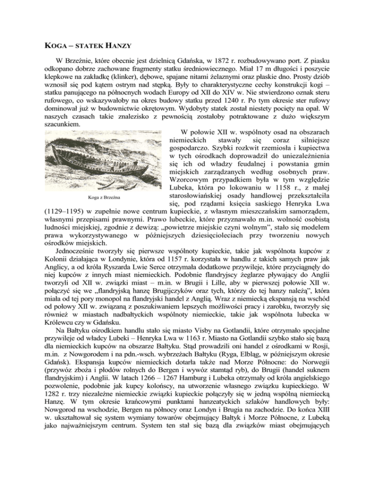 KOGA – STATEK HANZY W Brzeźnie, które obecnie jest dzielnicą Gdańska, w 1872 r. rozbudowywano port. Z piasku odkopano dobrze zachowane fragmenty statku średniowiecznego. Miał 17 m długości i poszycie klepkowe na zakładkę (klinker), dębowe, spajane nitami żelaznymi oraz płaskie dno. Prosty dziób wznosił się pod kątem ostrym nad stępką. Były to charakterystyczne cechy konstrukcji kogi – statku panującego na północnych wodach Europy od XII do XIV w. Nie stwierdzono oznak steru rufowego, co wskazywałoby na okres budowy statku przed 1240 r. Po tym okresie ster rufowy dominował już w budownictwie okrętowym. Wydobyty statek został niestety pocięty na opał. W naszych czasach takie znalezisko z pewnością zostałoby potraktowane z dużo większym szacunkiem. W połowie XII w. wspólnoty osad na obszarach niemieckich stawały się coraz silniejsze gospodarczo. Szybki rozkwit rzemiosła i kupiectwa w tych ośrodkach doprowadził do uniezależnienia się ich od władzy feudalnej i powstania gmin miejskich zarządzanych według osobnych praw. Wzorcowym przypadkiem była w tym względzie Lubeka, która po lokowaniu w 1158 r., z małej starosłowiańskiej osady handlowej przekształciła Koga z Brzeźna się, pod rządami księcia saskiego Henryka Lwa (1129–1195) w zupełnie nowe centrum kupieckie, z własnym mieszczańskim samorządem, własnymi przepisami prawnymi. Prawo lubeckie, które przyznawało m.in. wolność osobistą ludności miejskiej, zgodnie z dewizą: „powietrze miejskie czyni wolnym”, stało się modelem prawa wykorzystywanego w późniejszych dziesięcioleciach przy tworzeniu nowych ośrodków miejskich. Jednocześnie tworzyły się pierwsze wspólnoty kupieckie, takie jak wspólnota kupców z Kolonii działająca w Londynie, która od 1157 r. korzystała w handlu z takich samych praw jak Anglicy, a od króla Ryszarda Lwie Serce otrzymała dodatkowe przywileje, które przyciągnęły do niej kupców z innych miast niemieckich. Podobnie flandryjscy żeglarze pływający do Anglii tworzyli od XII w. związki miast – m.in. w Brugii i Lille, aby w pierwszej połowie XII w. połączyć się we „flandryjską hanzę Brugijczyków oraz tych, którzy do tej hanzy należą”, która miała od tej pory monopol na flandryjski handel z Anglią. Wraz z niemiecką ekspansją na wschód od połowy XII w. związaną z poszukiwaniem lepszych możliwości pracy i zarobku, tworzyły się również w miastach nadbałtyckich wspólnoty niemieckie, takie jak wspólnota lubecka w Królewcu czy w Gdańsku. Na Bałtyku ośrodkiem handlu stało się miasto Visby na Gotlandii, które otrzymało specjalne przywileje od władcy Lubeki – Henryka Lwa w 1163 r. Miasto na Gotlandii szybko stało się bazą dla niemieckich kupców na obszarze Bałtyku. Stąd prowadzili oni handel z ośrodkami w Rosji, m.in. z Nowgorodem i na pdn.-wsch. wybrzeżach Bałtyku (Ryga, Elbląg, w późniejszym okresie Gdańsk). Ekspansja kupców niemieckich dotarła także nad Morze Północne: do Norwegii (przywóz zboża i płodów rolnych do Bergen i wywóz stamtąd ryb), do Brugii (handel suknem flandryjskim) i Anglii. W latach 1266 – 1267 Hamburg i Lubeka otrzymały od króla angielskiego pozwolenie, podobnie jak kupcy kolońscy, na utworzenie własnego związku kupieckiego. W 1282 r. trzy niezależne niemieckie związki kupieckie połączyły się w jedną wspólną niemiecką Hanzę. W tym okresie krańcowymi punktami hanzeatyckich szlaków handlowych były: Nowgorod na wschodzie, Bergen na północy oraz Londyn i Brugia na zachodzie. Do końca XIII w. ukształtował się system wymiany towarów obejmujący Bałtyk i Morze Północne, z Lubeką jako najważniejszym centrum. System ten stał się bazą dla związków miast obejmujących www.dsn.de określony obszar, które stanowiły przeciwwagę dla rosnącej na znaczeniu szlachty, broniły swych kupców i towarów, zabezpieczały szlaki handlowe. Kupiec hanzeatycki był ściśle związany z morzem i żeglarstwem. Jego statkiem była koga, przypominająca konstrukcją przedhanzeatyckie statki fryzyjskie. Jest prawdopodobne, że pierwszą kogę zbudowali właśnie Fryzyjczycy w Niderlandach w połowie XII w. Konstrukcję tę przyjęli szybko Sasi niemieccy i rozwinęli ten typ statku, dostosowując go do przybrzeżnej żeglugi na Bałtyku i Morzu Północnym. Możliwość prowadzenia dalekich podróży morskich w pobliżu lądu była prawdziwą rewolucją w handlu między krajami leżącymi nad morzem. Podstawowymi cechami statku – kogi były: − poszycie klinkierowe (na zakładkę) burt (dno miało często poszycie karawelowe, czyli deski przymocowane były na styk do konstrukcji), − mocne prostokątne belki wystające z burt, prostopadłe do osi wzdłużnej, które wzmacniały konstrukcję statku, − prosta dziobnica i tylnica, w porównaniu z okrągłymi dziobnicami statków wikingów, płaskie dno, − połączenie desek poszycia za pomocą żelaznych gwoździ, − jeden maszt z jednym kwadratowym żaglem, − poprzeczny w stosunku do osi statku układ desek pokładu, które można było wyjmować, dzięki czemu łatwiejszy był dostęp do ładowni. Najwcześniejsze kogi miały otwarte kadłuby. Dopiero w XIII w. pojawiły się pokłady i kasztele, czyli wysokie, zwykle kilkupokładowe nadbudówki na dziobie i na rufie, związane na stałe z kadłubem, mieszczące kajuty oficerów, często bogato zdobione rzeźbami lub malowidłami. Kasztele były także w pewnym sensie konstrukcjami obronnymi, jako że na morzach roiło się od statków pirackich. Wyposażona w jeden żagiel koga była zwrotna (zdolna do pływania pod wiatr) i dość szybka (4–5 mil/godz). Jej manewrowość poprawiła się, gdy ok. 1240 r., zamiast dotychczasowego steru bocznego wiosłowego zastosowano ster rufowy. Na statkach wczesnośredniowiecznych ster był umieszczony na burcie statku (zwykle prawej, stąd nazwa sterburty), i tam stał sternik odwróco