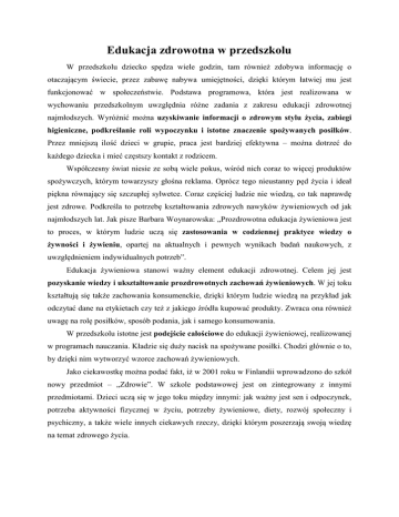 Edukacja zdrowotna w przedszkolu W przedszkolu dziecko spędza wiele godzin, tam również zdobywa informację o otaczającym świecie, przez zabawę nabywa umiejętności, dzięki którym łatwiej mu jest funkcjonować w społeczeństwie. Podstawa programowa, która jest realizowana w wychowaniu przedszkolnym uwzględnia różne zadania z zakresu edukacji zdrowotnej najmłodszych. Wyróżnić można uzyskiwanie informacji o zdrowym stylu życia, zabiegi higieniczne, podkreślanie roli wypoczynku i istotne znaczenie spożywanych posiłków. Przez mniejszą ilość dzieci w grupie, praca jest bardziej efektywna – można dotrzeć do każdego dziecka i mieć częstszy kontakt z rodzicem. Współczesny świat niesie ze sobą wiele pokus, wśród nich coraz to więcej produktów spożywczych, którym towarzyszy głośna reklama. Oprócz tego nieustanny pęd życia i ideał piękna równający się szczupłej sylwetce. Coraz częściej ludzie nie wiedzą, co tak naprawdę jest zdrowe. Podkreśla to potrzebę kształtowania zdrowych nawyków żywieniowych od jak najmłodszych lat. Jak pisze Barbara Woynarowska: „Prozdrowotna edukacja żywieniowa jest to proces, w którym ludzie uczą się zastosowania w codziennej praktyce wiedzy o żywności i żywieniu, opartej na aktualnych i pewnych wynikach badań naukowych, z uwzględnieniem indywidualnych potrzeb”. Edukacja żywieniowa stanowi ważny element edukacji zdrowotnej. Celem jej jest pozyskanie wiedzy i ukształtowanie prozdrowotnych zachowań żywieniowych. W jej toku kształtują się także zachowania konsumenckie, dzięki którym ludzie wiedzą na przykład jak odczytać dane na etykietach czy też z jakiego źródła kupować produkty. Zwraca ona również uwagę na rolę posiłków, sposób podania, jak i samego konsumowania. W przedszkolu istotne jest podejście całościowe do edukacji żywieniowej, realizowanej w programach nauczania. Kładzie się duży nacisk na spożywane posiłki. Chodzi głównie o to, by dzięki nim wytworzyć wzorce zachowań żywieniowych. Jako ciekawostkę można podać fakt, iż w 2001 roku w Finlandii wprowadzono do szkół nowy przedmiot – „Zdrowie”. W szkole podstawowej jest on zintegrowany z innymi przedmiotami. Dzieci uczą się w jego toku między innymi: jak ważny jest sen i odpoczynek, potrzeba aktywności fizycznej w życiu, potrzeby żywieniowe, diety, rozwój społeczny i psychiczny, a także wiele innych ciekawych rzeczy, dzięki którym poszerzają swoją wiedzę na temat zdrowego życia. Ciekawą propozycje zaleceń żywieniowych zaproponował S. Berger tak zwanych 6+1 „U”. Pod tym terminem kryją się następujące kwestie: urozmaicenie, umiarkowanie, uregulowanie, umiejętność przygotowania, uprawianie, unikanie oraz uśmiech. Pod pierwszym „u” kryje się urozmaicenie posiłków. Produkty spożywane przez człowieka mają różną zawartość składników odżywczych, które są potrzebne organizmowi, są wśród nich białka, tłuszcze, witaminy, węglowodany i składniki mineralne. Normy żywienia ustalane są w Instytucie Żywności i Żywienia. Zależą od wieku i płci. W ostatnich czasach zostały opracowane modele optymalnego żywienia. Występują one w postaci graficznej jako piramidy. Zarysowany jest na nich podział produktów na grupy. Im wyższy poziom, tym mniej produktów, które są tam ułożone należy spożywać. Poniżej przedstawię piramidę zdrowego żywienia dla dzieci i młodzieży opracowaną przez Instytut Żywności i Żywienia. Zdjęcie nr 2, Piramida zdrowego żywienia dla dzieci. W piramidzie tej najważniejszą i największą część stanowi spożywanie dużej ilości warzyw i owoców oraz produktów zbożowych. Zaleca picie wody i produktów mlecznych. Co więcej wskazuje się, jak ważna dla dzieci jest aktywność fizyczna, przejawiająca się w różnej formie. Dodatkowo zaleca się unikanie słonych potraw, soli i tłuszczów. Należy także zwrócić uwagę na porcje jakie spożywamy. Istnieje pewien prosty sposób określenia ich. Jest to porównanie do wielkości ręki, na przykład zwinięta ręka odpowiadać może porcji ryżu, a grubość dłoni może określać porcję mięsa. Edukacja żywieniowa zwraca także uwagę na osoby stosujące diety i podkreśla, że nie uznaje żadnej z form wegetariańskich, jeśli chodzi o odżywianie dzieci i młodzieży. Drugie „u” oznacza umiarkowanie w jedzeniu. Kraje rozwinięte cechują się nadmiernym jedzeniem. Związane jest to z różnymi czynnikami społeczno-kulturowymi, ale także tymi dotyczących samej jednostki. Wiąże się to z odkładaniem tłuszczu co może doprowadzić do powstania otyłości. Istotne wydaje się więc w edukacji żywieniowej podkreślanie kaloryczności produktów. Trzecie „u” dotyczy natomiast uregulowania żywienia. Związane jest to z przerwami pomiędzy posiłkami. Warto zapamiętać pewną zasadę, wyrażoną wzorem 5x4x4. Dotyczy ona spożywania posiłków znajdujących się w pięciu grupach, w postaci czterech posiłków, zjadanych co cztery godziny. Ważne jest jedzenie o stałych porach dniach i odpowiedni podział energii. Za najważniejszy posiłek uważa się pierwsze śniadanie, które powinno stanowić od 25 do 30% energii. Spożywane powinno być w spokoju, najlepiej z rodziną, by zacząć wspólnie miło dzień. Badania wykazały także, że dzieci które zjadają pierwsze śniadanie pracują znacznie szybciej od rówieśników, którzy nie jedzą śniadania w domu. Kolejne, czwarte z kolei „u” dotyczy umiejętności przygotowania posiłków. Należy to także rozszerzyć do planowania posiłków. Zwraca się uwagę na zgodność wyboru produktów i ilości z piramidą żywieniową. Podkreślenie ceny i dostępności. Autor wskazuje również na edukację konsumencką, jaka jest związana z zakupem produktów spożywczych. Podkreśla też rolę przechowywania pożywienia w odpowiednich warunkach, tak by uniknąć zepsucia. Piąt