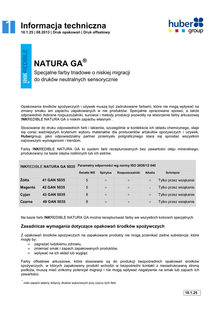 Informacja techniczna 10.1.25 | 08.2013 | Druk opakowań | Druk offsetowy NATURA GA® Specjalne farby triadowe o niskiej migracji do druków neutralnych sensorycznie Opakowania środków spożywczych i używek muszą być zadrukowane farbami, które nie mogą wpływać na zmiany smaku ani zapachu zapakowanych w nie produktów. Specjalnie opracowane spoiwo, a także odpowiednio dobrane rozpuszczalniki, surowce i metody produkcji pozwoliły na stworzenie farby arkuszowej * !NKREDIBLE NATURA GA o niskim zapachu własnym . Stosowanie do druku odpowiednich farb i lakierów, szczególnie w kontekście ich składu chemicznego, staje się coraz ważniejszym kryterium wyboru materiałów dla producentów artykułów spożywczych i używek. Hubergroup, jako odpowiedzialny partner przemysłu poligraficznego stara się sprostać wszystkim najnowszym wymaganiom i trendom. Farby !NKREDIBLE NATURA GA to system farb recepturowanych bez zawartości oleju mineralnego, produkowany na bazie olejów roślinnych lub ich estrów. !NKREDIBLE NATURA GA 5035 Parametry odporności wg normy ISO 2836/12 040 Światło WS Spirytus Rozpuszczalniki Alkalia Schnięcie Żółta 41 GAN 5035 5 + + + Tylko przez wsiąkanie Magenta 42 GAN 5035 5 + + - Tylko przez wsiąkanie Cyjan 43 GAN 5035 8 + + + Tylko przez wsiąkanie Czarna 49 GAN 5035 8 + + + Tylko przez wsiąkanie Na bazie farb !NKREDIBLE NATURA GA można recepturować farby we wszystkich kolorach specjalnych. Zasadnicze wymagania dotyczące opakowań środków spożywczych Z opakowań środków spożywczych na zapakowane produkty nie mogą przenikać żadne substancje, które mogły by: • zagrażać ludzkiemu zdrowiu, • zmieniać smak i zapach zapakowanych produktów, • wpływać na ich skład lub wygląd. Farby offsetowe arkuszowe, które stosowane są do produkcji bezpośrednich opakowań środków spożywczych, w których zapakowany produkt wchodzi w bezpośredni kontakt z niezadrukowaną stroną podłoża, muszą mieć znikomy potencjał migracji i nie mogą wpływać negatywnie na smak lub zapach ich zawartości. * niski zapach własny dotyczy druków wykonanych przy użyciu tych farb 10.1.25 Farby !NKREDIBLE NATURA GA są farbami o niskiej migracji i niskim zapachu własnym. Recepturowane są bez zawartości olejów mineralnych i nie zawierają suszek wspomagających schnięcie oksydacyjne. Surowce stosowane do produkcji tej serii farb zgodne są z zaleceniami EuPIA (EuPIA Guideline) i Ordynacją Szwajcarską (SR 817.023.21). Spoiwa użyte do wytwarzania farb !NKREDIBLE NATURA GA bazują na estrach kwasów tłuszczowych, które oznaczone są toksykologicznie i dopuszczone do kontaktu ze środkami spożywczymi. Na podstawie wytycznych EuPIA dotyczących farb drukarskich stosowanych do zadruku zewnętrznych powierzchni opakowań środków spożywczych farby serii !NKREDIBLE NATURA GA mogą być stosowane do produkcji opakowań środków spożywczych zgodnie z wymogami Rozporządzenia UE nr 1935/2004, jeśli konstrukcja opakowania, metoda produkcji, zastosowanie w opakowaniach dostatecznej warstwy barierowej oraz odpowiednia kontrola procesu produkcji wykluczą możliwość przechodzenia składników farby na zapakowany produkt. Producent opakowania musi określić stopień ryzyka gotowego opakowania środka spożywczego i przeprowadzić odpowiednią kontrolę jakości, aby się upewnić, że migracja do produktu nie przekracza ustawowo zalecanego limitu. Informacje niezbędne do oceny gotowego produktu wg Rozporządzenia UE nr 1935/2004 i/lub Ordynacji Szwajcarskiej 817.023.21 zawiera dokument „Informacje o składzie”. Właściwości specjalne • • • • • • • • • • Seria farb do zadruku zewnętrznej strony opakowań środków spożywczych na papierze i kartonie Niska migracja wg definicji EuPIA/PIJITF 2 Migracja globalna < 10 mg/dm Doskonałe wartości oceny sensorycznej druków w teście Robinson (wg normy EN 1230 cz.1 i 2) Przy produktach, które będą przez dłuższy czas napełniane, obrabiane lub stosowane w wyższych 0 temperaturach (powyżej 70 C) zalecamy stosowanie farby specjalnej serii CORONA-MGA Druk farbami !NKREDIBLE NATURA GA jest porównywalny ze standardowymi farbami arkuszowymi i możliwy na każdego rodzaju maszynach drukujących i wszystkich wsiąkliwych podłożach. Nanoszona 2 warstwa farby poszczególnych kolorów nie powinna przekraczać 2 g/m Stabilna równowaga farbowo-wodna na maszynie Szybkie wsiąkanie w podłoże Schnięcie farb przebiega wyłącznie na zasadzie wsiąkania w podłoże, a nie oksydacyjnie. Dlatego też druki wykonane farbami serii !NKREDIBLE NATURA GA nie posiadają wystarczającej odporności na ścieranie. Konieczne jest ich lakierowanie w linii lakierem dyspersyjnym (neutralnym sensorycznie) Z powodu braku schnięcia oksydacyjnego nie powstają żadne substancje aktywne, np. aldehydy o krótkich wiązaniach łańcuchowych, które mogłyby zaburzyć neutralność sensoryczną druków. Druki wykonane przy użyciu farb !NKREDIBLE NATURA GA nie wydzielają też hexanalu Wskazówki dotyczące stosowania Podawanie roztworu zwilżającego Zalecane jest minimalne podawanie środka zwilżającego, szczególnie przy niewielkim nanoszeniu farby. Koncentracja alkoholu izopropylowego nie powinna przekraczać 10% przy wartości roztworu pH 5,0-5,4. Pielęgnacja wałków Aby zachować neutralność sensoryczną druków wałków nie należy spryskiwać środkami przeciw zasychaniu (typu Anti-trockner) ani odświeżającymi zaschniętą farbę (typu Farbfit). Po umyciu wałki należy starannie wysuszyć. 10.1.25 Lakierowanie lakierem dyspersyjnym Do lakierowania druków zalecamy nasze lakiery dyspersyjne serii ACRYLAC-GA lub ACRYLAC-MGA. Zaleca się nadawanie maksymalnie możliwej ilości lakieru, aby uzyskać zamkniętą warstewkę lakieru na zadrukowanej farbą powierzchni podłoża. Zapobiega to tym samym następującym problemom: - zbyt niskiej odporności na ścieranie, - odciąganiu i sklejaniu ark