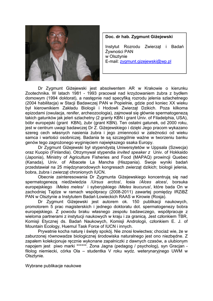 Doc. dr hab. Zygmunt GiŜejewski Instytut Rozrodu Zwierząt i Badań śywności PAN w Olsztynie E-mail: [email protected] Dr Zygmunt GiŜejewski jest absolwentem AR w Krakowie o kierunku Zootechnika. W latach 1981 - 1993 pracował nad krzyŜowaniem Ŝubra z bydłem domowym (1994 doktorat), a następnie nad specyfiką rozrodu jelenia szlachetnego (2004 habilitacja) w Stacji Badawczej PAN w Popielnie, gdzie pod koniec XX wieku był kierownikiem Zakładu Biologii i Hodowli Zwierząt Dzikich. Poza kilkoma epizodami (owulacja, renifer, archeozoologia), zajmował się głównie spermatogenezą takich gatunków jak jeleń szlachetny (2 granty KBN i grant Univ. of Filadelphia, USA), bóbr europejski (grant KBN), Ŝubr (grant KBN). Ten ostatni gatunek, od 2000 roku, jest w centrum uwagi badawczej Dr Z. GiŜejewskiego i dzięki Jego pracom wykazano szereg cech własnych nasienia Ŝubra i jego zmienności w zaleŜności od wieku samca i wartości osobniczej. Badania te są szczególnie waŜne w tworzeniu banku genów tego zagroŜonego wyginięciem największego ssaka Europy. Dr Zygmunt GiŜejewski był stypendystą Uniwersytetów w Uppsala (Szwecja) oraz Kuopio (Finlandia). Otrzymywał stypendia invited speaker z Univ. of Hokkaido (Japonia), Ministry of Agriculture Fisheries and Food (MAPAQ) prowincji Quebec (Kanada), Univ. of Albacete La Mancha (Hiszpania). Swoje wyniki badań przedstawiał na 25 międzynarodowych kongresach zwierząt dzikich; biologii jelenia, bobra, Ŝubra i zwierząt chronionych IUCN. Obecnie zainteresowania Dr Zygmunta GiŜejewskiego koncentrują się nad spermatogenezą niedźwiedzia /Ursus arctos/, łosia /Alces alces/, borsuka europejskiego /Meles meles/ i syberyjskiego /Meles leucurus/, które bada On w zachodniej Tajdze w ramach współpracy (2008-2011) zawartej pomiędzy IRZiBś PAN w Olsztynie a Instytutem Badań Łowieckich RAAS w Kirowie (Rosja). Dr Zygmunt GiŜejewski jest autorem ok. 150 publikacji naukowych, promotorem 5 prac magisterskich i jednego doktoratu dot. spermatogenezy bobra europejskiego. Z powodu braku własnego zespołu badawczego, współpracuje z wieloma partnerami z instytucji naukowych w kraju i za granicą. Jest członkiem TBR, Komisji Etycznej ds. Badań Naukowych, Komisji Andrologii, członkiem E. J. of Mountain Ecology, Huemul Task Force of IUCN i innych. Prywatnie kocha naturę i święty spokój. Nie znosi łowiectwa; chociaŜ wie, Ŝe w zaburzonej równowadze biologicznej środowiska naturalnego jest ono niezbędne. Z zapałem kolekcjonuje ręcznie wykonane zapalniczki z dawnych czasów, a ulubionym napojem jest piwo marki ******. śona Jagna (pedagog / psycholog), syn Gracjan filolog niemiecki, córka Ola – studentka V roku wydz. weterynaryjnego UWM w Olsztynie. Wybrane publikacje naukowe - GIśEJEWSKI, Z., WOJTAL, P., CSAPÓ, J., GIśEJEWSKI, J., JACZEWSKI, Z. and CSAPÓ J. JR, 2004. Remains of Late Pleistocene reindeer from Chmielewo, North-East Poland. Europ. J. of Wild. Res., 50; 207-212 - BIERLA J.B., GIśEJEWSKI Z., LEIGH C.M, EKWALL H., SÖDERQUIST L., RODRIGUEZMARTINEZ H., ZALEWSKI K., BREED W.G., 2007. Sperm Morphology of the Eurasian Beaver, Castor fiber: An example of a Species of Rodent with Highly Derived and Pleiomorphic Sperm Populations. Journal of Morphology, 268: 683-689 - GIśEJEWSKI Z, SZAFRAŃSKA B, STEPLEWSKI Z, PANASIEWICZ G, CIERESZKO A and H. KOPROWSKI, 2008.Cottonseed Feeding Delivers Sufficient Quantities of Gossypol as a Male Deer Contraceptive. Europ. J. Wildlife Res., 54: 469-477 - KRASIŃSKA M., GIśEJEWSKI Z., CZYKIER E., KRASIŃSKI Z.A. and MATUSZEWSKA M. 2009. Changes of weight and size of European bison testes during postnatal development. Acta Theriol., 54 (2): 111-126 - TERHI ISO-TOURU, JUHA KANTANEN, MENG-HUA LI, ZYGMUNT GIZEJEWSKI and JOHANNA VILKKI, 2009. Divergent evolution in the cytoplasmic domains of PRLR and GHR genes in Artiodactyla. BMC Evolutionary Biology 2009, 9:172, doi:10.1186/1471-2148-9-172 - JIMÉNEZ, J., GUINEO, G., CORTI, P, SMITH, J.A., FLUECK, W., VILA, A., GIZEJEWSKI, Z., GILL, R., MCSHEA, B. & GEIST, V. 2009. Hippocamelus bisulcus. In: IUCN 2009. IUCN Red List of Threatened Species. http://www.iucnredlist.org/details/10054/0 Wykład monograficzny wygłoszony w dniu 13.11.2009 r. „ Specyfika rozrodu zwierząt wolnoŜyjących: Ŝubr, jeleń szlachetny, bóbr europejski ” Wymienione gatunki zwierząt naleŜą do najbardziej wartościowych przedstawicieli rodzimej fauny. Rozród ich jest inny niŜ u zwierząt domowych, poniewaŜ jest całkowicie uzaleŜniony od mechanizmów zegara biologicznego, który warunkuje waŜne związane z nim funkcje fizjologiczne. Głównymi zagadnieniami wykładu będzie charakterystyka specyfiki rozrodu wymienionych gatunków; przedstawienie róŜnic i podobieństw ze szczególnym uwzględnieniem sezonowych zmian jakości nasienia na przykładzie jelenia szlachetnego.