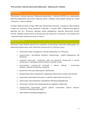 Warszawskie Centrum Innowacji Edukacyjno - Społecznych i Szkoleń Kim jesteśmy? Warszawskie Centrum Innowacji Edukacyjno-Społecznych i Szkoleń (WCIES) jest samorządową placówką doskonalenia nauczycieli, instytucją wiedzy i edukacji, której zadania wpisują się w hasło „Warszawa – miastem edukacji”. Centrum zostało powołane 10 lipca 2008 roku uchwałą Rady Warszawy, z inicjatywy Biura Edukacji Urzędu m.st. Warszawy. Swoją działalność rozpoczęło 1 września 2008 r. Organem prowadzącym placówkę jest m.st. Warszawa, natomiast nadzór pedagogiczny sprawuje Mazowiecki Kurator Oświaty. Siedziba Centrum mieści się obecnie przy ulicy Hożej 88 w Warszawie, a od września 2012 r. placówka będzie funkcjonować przy ul. Starej 4. Jakie są nasze cele? Głównymi celami działania placówki jest wspieranie warszawskiego środowiska edukacyjnego oraz podniesienie jakości pracy szkół i placówek oświatowych m.st. Warszawy przez: • realizowanie zadań wynikających z polityki edukacyjnej m.st. Warszawy, • organizowanie i prowadzenie doradztwa metodycznego i nadzór pedagogiczny nad doradcami, • wspieranie nauczycieli i dyrektorów szkół oraz placówek oświatowych w rozwoju zawodowym i wypełnianiu różnych funkcji w systemie oświaty, • wprowadzanie systemowych rozwiązań z (projekty, szkolenia, konferencje, seminaria), • promowanie innowacji edukacyjnych i społecznych, • przygotowanie oferty szkoleniowej i organizacja różnych form wymiany doświadczeń, • inicjowanie różnorodnych form pracy w szkołach i placówkach oświatowych, • opracowanie, upowszechnienie i gromadzenie informacji pedagogicznej, • inicjowanie i nawiązywanie międzynarodowej współpracy edukacyjnej, • uspołecznienie warszawskiej oświaty poprzez i uczniów na funkcjonowanie szkoły, • indywidualne konsultacje pedagogiczne. zakresu edukacji wzmocnienie i wychowania wpływu rodziców 1 Do kogo adresujemy nasze działania? WCIES adresuje swoje działania do całego środowiska edukacyjnego Warszawy, a w szczególności do: o kadry zarządzającej oświatą, o dyrektorów szkół, o nauczycieli, o doradców metodycznych, o rodziców, o młodzieży, o liderów organizacji pozarządowych, o przedstawicieli biur pionu społecznego Urzędu m.st. Warszawy. Wszystkie proponowane przez Warszawskie Centrum Innowacji formy doskonalenia są bezpłatne. Proponujemy bogatą ofertę różnorodnych form szkoleniowych, przygotowanych przez nauczycieli doradców metodycznych, realizowanych na zlecenie Biura Edukacji, a także wynikających z realizacji celów statutowych Centrum i bieżących potrzeb warszawskiego środowiska oświatowego. Zachęcamy także do indywidualnych spotkań z doradcami Struktura / Zespół WCIES Pracownicy merytoryczni Centrum to: nauczyciele konsultanci, specjaliści oraz nauczyciele doradcy metodyczni m.st. Warszawy. Doradca metodyczny - to nauczyciel powołany do wspierania rozwoju zawodowego innych nauczycieli w ramach reprezentowanego przez siebie pzredmiotu lub specjalności. Wykorzystujac posiadaną wiedzę, umiejetnosci i doswiadczenia pomaga nauczycielom podejmować decyzje w sprawach zawodowych. 2 Model warszawskiego doradcy metodycznego 3 Organizacja doradztwa metodycznego / Zespoły metodyczne (interdyscyplinarne) Zespół wychowania przedszkolnego oraz Zespół edukacji wczesnoszkolnej Zespół pomocy psychologiczno - pedagogicznej i szkolnictwa specjalnego * poradnie psychologiczno - pedagogiczne * pedagodzy szkolni * terapia * kształcenie specjalne: oligofrenopedagogika, surdopedagogika, tyflopedagogika Zespół przedmiotów humanistycznych * język polski * wiedza o kulturze * historia * biblioteka * wiedza o społeczeństwie Zespół nauk ścisłych i technologii informacyjnej * matematyka * technologia informatyczna * informatyka Zespół nauk przyrodniczych * przyroda * geografia * chemia * fizyka * biologia Zespół języków obcych * rosyjski * angielski * niemiecki * hiszpański * i inne języki romańskie 4 Zespół przedmiotów zawodowych, podstaw przedsiębiorczości i doradztwa zawodowego * przedmioty zawodowe w różnych specjalnościach * edukacja ekonomiczna i konsumencka * doradztwo zawodowe Zespół rozwijania uzdolnień i zainteresowań, edukacji artystycznej i technicznej * muzyka * plastyka * technika * praca z uczniem zdolnym * edukacja kulturalna Zespół wychowania fizycznego * wychowanie fizyczne * edukacja zdrowotna * zajęcia dodatkowe Zespół religii, etyki i filozofii * religia * filozofia Wybrane, strategiczne programy realizowane we WCIES ADRESAT – KADRA ZARZĄDZAJĄCA OŚWIATĄ, DYREKTORZY SZKÓŁ Działania WCIES skierowane do kadry zarządzającej oświatą oraz dyrektorów placówek oświatowych mają na celu doskonalenie zawodowe, ułatwianie wymiany doświadczeń, promowanie twórczych dyrektorów oraz innowacyjnych rozwiązań w zarządzaniu i kierowaniu placówką oświatową. Podejmowane i realizowane różnorodne formy współpracy i wymiany doświadczeń, w tym konferencje, seminaria oraz kursy kwalifikacyjne, służą zarówno aktualizacji wiedzy w obszarze zarządzania i kierowania placówką, a także rozwojowi osobistemu i doskonaleniu m.in. kompetencji zarządzania czasem, podejmowania decyzji, delegowania uprawnień warunkujących sprawną organizację pracy własnej oraz pracy zespołu nauczycielskiego. Szczególnym adresatem podejmowanych przez WCIES działań skierowanych do kadry kierowniczej, są młodzi stażem dyrektorzy placówek oświatowych. Skierowane do nich formy doskonalenia mają na celu wsparcie w realizacji zadań związanych z kierowaniem placówką oraz w rozwoju osobistym. 5 Młodzi stażem dyrektorzy uczestnicząc w projektach np. Mentoring – jako forma wsparcia młodego dyrektora, mają możliwość indywidualnych konsultacji z mentorami-doświadczonymi dyrektorami placówek oświatowych, a także udziału w spotkaniach rozwojowych z profesjonalnymi coachami Na uwa