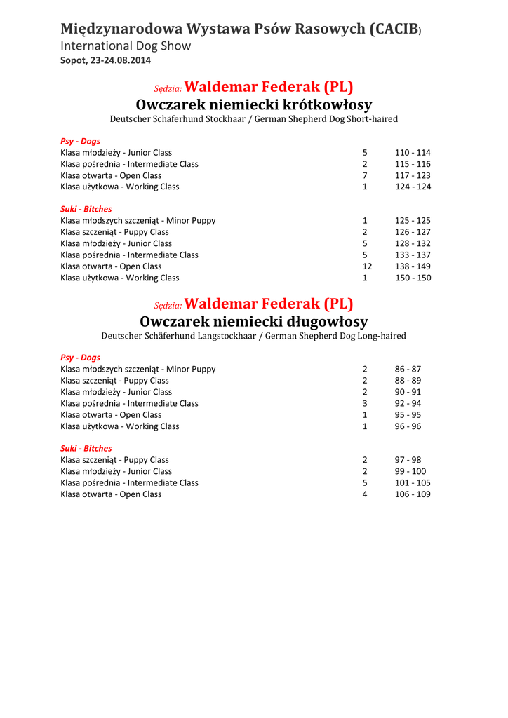 Międzynarodowa Wystawa Psów Rasowych (CACIB) International Dog Show Sopot, 23-24.08.2014 Waldemar Federak (PL) Owczarek niemiecki krótkowłosy Sędzia: Deutscher Schäferhund Stockhaar / German Shepherd Dog Short-haired Psy - Dogs Klasa młodzieży - Junior Class Klasa pośrednia - Intermediate Class Klasa otwarta - Open Class Klasa użytkowa - Working Class 5 2 7 1 110 - 114 115 - 116 117 - 123 124 - 124 Suki - Bitches Klasa młodszych szczeniąt - Minor Puppy Klasa szczeniąt - Puppy Class Klasa młodzieży - Junior Class Klasa pośrednia - Intermediate Class Klasa otwarta - Open Class Klasa użytkowa - Working Class 1 2 5 5 12 1 125 - 125 126 - 127 128 - 132 133 - 137 138 - 149 150 - 150 Waldemar Federak (PL) Owczarek niemiecki długowłosy Sędzia: Deutscher Schäferhund Langstockhaar / German Shepherd Dog Long-haired Psy - Dogs Klasa młodszych szczeniąt - Minor Puppy Klasa szczeniąt - Puppy Class Klasa młodzieży - Junior Class Klasa pośrednia - Intermediate Class Klasa otwarta - Open Class Klasa użytkowa - Working Class 2 2 2 3 1 1 86 - 87 88 - 89 90 - 91 92 - 94 95 - 95 96 - 96 Suki - Bitches Klasa szczeniąt - Puppy Class Klasa młodzieży - Junior Class Klasa pośrednia - Intermediate Class Klasa otwarta - Open Class 2 2 5 4 97 - 98 99 - 100 101 - 105 106 - 109