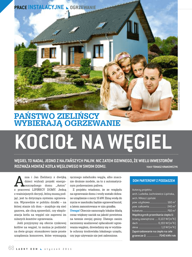 OGRZEWANIE WIZUALIZACJA: LIPIŃSCY DOMY; FOT.: SHUTTERSTOCK PRACE INSTALACYJNE PAŃSTWO ZIELIŃSCY WYBIERAJĄ OGRZEWANIE KOCIOŁ NA WĘGIEL WĘGIEL TO NADAL JEDNO Z NAJTAŃSZYCH PALIW. NIC ZATEM DZIWNEGO, ŻE WIELU INWESTORÓW ROZWAŻA MONTAŻ KOTŁA WĘGLOWEGO W SWOIM DOMU. TEKST TOMASZ KRAKOWCZYK A nna i Jan Zielińscy z dwójką ręcznego załadunku węgla, albo znacz- dzieci wybrali projekt energo- nie droższe modele, za to z automatycz- oszczędnego nym podawaniem paliwa. domu „Aston” z pracowni LIPIŃSCY DOMY. Jedną Z projektu wiadomo, że ze względu z ważniejszych decyzji, którą muszą pod- na ogrzewanie domu i wody zostało dobra- jąć, jest ta dotycząca systemu ogrzewa- ne urządzenie o mocy 15 kW. Zimą wodę do nia. Wprawdzie w pobliżu działki – na mycia w zasobniku będzie ogrzewał kocioł, której stanie ich dom – znajduje się sieć a latem zamontowana w nim grzałka. gazowa, ale chcą sprawdzić, czy eksplo- Uwaga! Obecnie samorządy lokalne kładą atacja kotła na węgiel nie zapewni im coraz większy nacisk na jakość powietrza niższych kosztów ogrzewania. na terenie swojej gminy. Dlatego zanim Jeśli przyjrzymy się ofercie rynkowej zaczniemy analizować opłacalność ogrze- kotłów na węgiel, to można je podzielić wania węglem, dowiedzmy się w wydzia- na dwie grupy: stosunkowo tanie proste le ochrony środowiska lokalnego urzędu, urządzenia komorowe, które wymagają czy jego używanie nie jest zabronione. 68 Ł A D N Y D O M s t y c z e ń 2 0 1 1 DOM PARTEROWY Z PODDASZEM Autorzy projektu: arch. Ludwika Juchniewicz-Lipińska, arch. Miłosz Lipiński pow. użytkowa ........................... 160 m2 pow. całkowita ........................... 240 m2 kubatura .................................... 760 m3 Współczynnik przenikania ciepła U: ściany zewnętrzne .... 0,122 W/(m2K) dach ............................. 0,193 W/(m2K) okna ................................. 1,0 W/(m2K) Zapotrzebowanie na ciepło na cele grzewcze Q .................. 7040 kWh/rok OGRZEWANIE WYMAGANIA DLA KOTŁA NA WĘGIEL W trakcie obsługi kotła na węgiel (dokładanie paliwa, usuwa- lizować np. w wolno stojącym garażu lub domku gospodarczym. nie popiołu) nie sposób uniknąć unoszenia się pyłu. Dlatego Ale uwaga, takie rozwiązanie wiąże się z dość uciążliwym przewożeniem opału do kotłowni. urządzenia te należy montować w oddzielnych pomieszcze- Komin i wentylacja. Pomieszczenie kotłowni zostało wypo- niach. Kotłownia. W prezentowanym domu uwzględniono to po- sażone, zgodnie z prawem budowlanym, w nawiew o przekro- mieszczenie, co nie jest obecnie standardem w gotowych pro- ju minimum 200 cm2 oraz wywiew, czyli oddzielny kanał wen- 2 jektach. Kotłownia ma 7,5 m , więc – zgodnie z przepisami – wy- tylacyjny o przekroju 14×14 cm. starczy do swobodnej obsługi i konserwacji kotła. Usytuowana W kotłowni przewidziano przewód dymowy, ale jest on prze- została w sąsiedztwie kuchni, z którą jest połączona drzwiami znaczony do podłączenia kominka. Do odprowadzania spalin wewnętrznymi. W projekcie zaznaczono konieczność montażu z kotła trzeba będzie zatem dostawić jeszcze jeden przewód. szczelnych drzwi, ale brak przedsionka pomiędzy kuchnią a kot- Można go wymurować z pełnej cegły, ale lepiej zastosować goto- łownią może i tak powodować przenoszenie się pyłu, dymu i za- we systemy przewodów dymowych z kształtek ceramicznych. In- pachów z kotłowni do wnętrza domu. Rozwiązaniem mogą być nym rozwiązaniem jest montaż komina ze stali żaroodpornej, drzwi podwójne. Kotłownia ma jeszcze drugie drzwi, przez któ- z atestem do spalin z węgla. 1 KOTŁOWNIA NA KOCIOŁ WĘGLOWY re wychodzi się na zewnątrz. dostawiony komin Uwaga! Ze względu na umieszczenie kotłowni na tym samym ewentualnie dodatkowe drzwi poziomie co ogrzewane pomieszczenia, należy zastosować układ centralnego ogrzewania, w którym obieg wody grzew- kotłownia czej będzie wymuszony pompą obiegową. wejście boczne Magazyn paliwa. Jeśli moc kotła nie przekracza 25 kW, skład wywania go w specjalnie przygotowanym boksie lub pojemnikach. Jednak ze względu na wielkość kotłowni w naszym domu, lepiej utworzyć w niej podręczny skład paliwa, główny zaś zloka- RYS.: LIPIŃSCY DOMY paliwa może znajdować się w kotłowni, pod warunkiem przecho- MAGAZYN PALIWA ORAZ SKŁAD POPIOŁU MOŻE ZNAJDOWAĆ SIĘ NA ZEWNĄTRZ DOMU, NA PRZYKŁAD W WYDZIELONEJ CZĘŚCI Z WOLNO STOJĄCEGO GARAŻU kuchnia Dom można ogrzewać na wiele sposobów. Dotyczy to zarówno źródeł ciepła (węgiel, drewno, gaz, energia elektryczna), jak i urządzeń (kotły, kominki, pompy ciepła, piece akumulacyjne). Na przykładzie konkretnego domu, chcemy w kolejnych numerach naszego miesięcznika sprawdzić różne rozwiązania. Będziemy oceniać nakłady, jakie trzeba ponieść na zakup i montaż urządzeń, oraz wygodę obsługi. Przyjrzymy się też kosztom eksploatacyjnym. Warto w tym miejscu podkreślić, że dom, który wybraliśmy, jest zdecydowanie lepiej ocieplony niż wymagają tego przepisy. Mamy bowiem nadzieję, że takie właśnie domy będą coraz częściej budowane. 3 RZUT PIĘTRA garderoba pokój dzienny pokój gościnny garderoba 2 RZUT PARTERU sypialnia łazienka sypialnia kuchnia kotłownia RYS.: LIPIŃSCY DOMY gabinet wiatrołap sypialnia wejście www.ladnydom.pl s t y c z e ń 2 0 1 1 Ł A D N Y D O M 69 PRACE INSTALACYJNE OGRZEWANIE KOTŁY Z RĘCZNYM ZAŁADUNKIEM PALIWA Ten rodzaj kotłów na węgiel, nazywanych też komorowymi, jest najbardziej rozpowszechniony na rynku. Z tego też względu producenci wciąż udoskonalają ich konstrukcję. Na przykład powietrze do spalania może być teraz dostarczane poprzez wentylator nadmuchowy, który jest sterowany elektronicznie. Wymienniki ciepła tych kotłów mogą być wykonane ze stali kotłowej lub z żeliwa. Pierwsze są tańsze; są też wyposażone w ruchomy ruszt ułatwiający czyszc