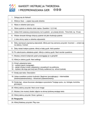 KAHOOT! INSTRUKCJA TWORZENIA I PRZEPROWADZANIA GIER 1. Zaloguj się do Kahoot! 2. Kliknij w Quiz → pojawi się puste okienko 3. Wpisz w okienko tytuł quizu 4. Wpisz pytanie w okienko obok napisu: Question 1 (2,3 itd) 5. Ustaw limit czasowy przeznaczony na to pytanie po prawej stronie Time limit, np. 10 sec 6. Wstaw obrazek którego dotyczy pytanie lub jako ilustracja pytania 7. U dołu strony wpisz w okienka odpowiedzi 8. Żeby zaznaczyć poprawną odpowiedź, kliknij pod nią czerwony przycisk: Incorrect → zmieni się na zielony: Correct 9. Żeby dodać kolejne pytanie, kliknij w biały guzik: Add question 10. Po zakończeniu układania pytań, kilknij w zielony guzik: Next reorder questions 11. Możesz zmienić kolejność pytań przeciągając je w górę/dół 12. Kliknij w zielony guzik: Next settings 13. Zmień ustawienia testu: 14. wybierz język (Language), 15. (jeżeli chcesz) zmień ustawienia z prywatnych na publiczne, 16. wybierz dla kogo jest twój test (Primary audience) np. school (szkoła) 17. Dodaj opis testu: Description 18. Ustaw suwakiem poziom trudności: Beginner (początkujący) Intermediate (średniozaawansowany) Advanced (zaawansowany) 19. Dodaj tagi słowa kluczowe uławiające wyszukanie Twojego quizu, np. biologia, komórka, gimnazjum 20. Kliknij zielony przycisk: Next cover image 21. Możesz (nie musisz) dodać zdjęcie na stronę tytułową swojego testu 22. Kliknij zielony przycisk: Done i gotowe :) 23. Rozgrywka 24. Kliknij fioletowy przycisk: Play now KAHOOT! INSTRUKCJA TWORZENIA I PRZEPROWADZANIA GIER 25. Kliknij fioletowy przycisk: Launch, żeby uruchomić quiz 26. Pojawi się ekran rejestracji uczestników → uczniowie wchodzą na swoich urządzeniach na stronę kahoot.it, a następnie wpisują numer gry (game pin), który wyświetlił się u góry strony Wejście na stronę ułatwi kod QR (do pobrania pdf bit.ly/1fAdRl7 ) 27. Po wpisaniu numeru gry (game pin) uczniowie muszą wpisać swoją nazwę: imię lub nick i kliknąć: Join game (przyłącz się do gry). Otrzymają komunikat: You’re In! (jesteś w grze) i czekają na uruchomienie gry przez Ciebie 28. Po lewej stronie widać, ilu graczy dołącza do gry: Players 29. Kliknij fioletowy przycisk: Start game (rozpocznij grę) 30. Na tablicy/ekranie wyświetli się pytanie i odpowiedzi (w róznych kolorach) Uczniowie na urządzeniu zobaczą tylko kolorowe kształty (sześciokąt, elipsa, trójkąt, kwadrat) klikają kolor zgodny z odpowiedzią na tablicy 31. Gdy uczniowie odpowiedzą, na tablicy widać wykres (słupki) rozkład odpowiedzi 32. Żebyprzejść do tabeli wyników klikasz fioletowy guzik po prawej stronie ekranu: Next 33. Żeby przejść do następnego pytania klikasz fioletowy guzik po prawej stronie ekranu: Next 34. Powtarszasz czynności do wyczerpania pytań 35. Na koniec klikasz fioletowy guzik po prawej stronie: End 36. Pojawia się komunikat, kto jest zwycięzcą i wynik punktowy 37. Klikasz fioletowy guzik: Next 38. Kolejna plansza, to szybkie badanie opinii uczniów na temat quizu: gwiazdka poziom radochy (czy to była dobra zabawa), learning czy się czegoś nauczyli, recommend czy polecają ten quiz, feeling wrażenie ogólne 39. Klikasz fioletowy guzik: Final scores ostateczny ranking 40. Ostatnia plansza to tabela wyników. Można tu pobrać wyniki quizu w formacie .xls → kliknij pomarańczowy guzik: Download results KAHOOT! INSTRUKCJA TWORZENIA I PRZEPROWADZANIA GIER