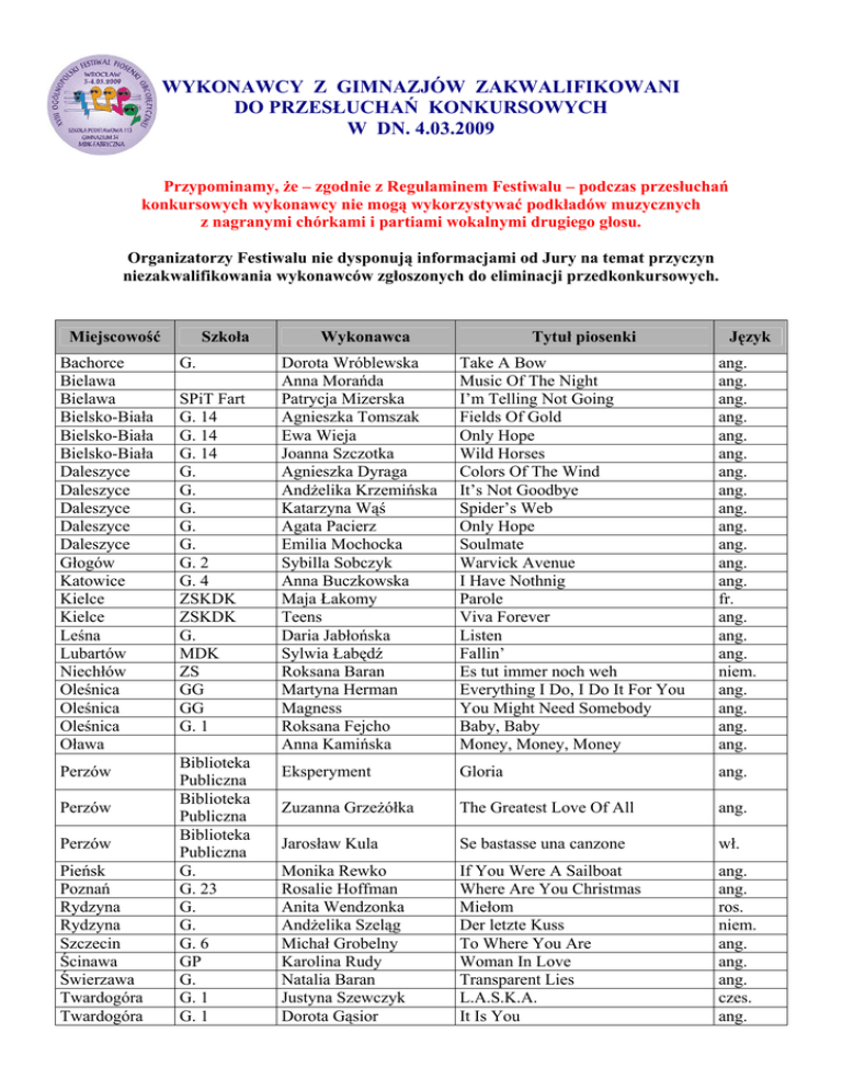 WYKONAWCY Z GIMNAZJÓW ZAKWALIFIKOWANI DO PRZESŁUCHAŃ KONKURSOWYCH W DN. 4.03.2009 Przypominamy, że – zgodnie z Regulaminem Festiwalu – podczas przesłuchań konkursowych wykonawcy nie mogą wykorzystywać podkładów muzycznych z nagranymi chórkami i partiami wokalnymi drugiego głosu. Organizatorzy Festiwalu nie dysponują informacjami od Jury na temat przyczyn niezakwalifikowania wykonawców zgłoszonych do eliminacji przedkonkursowych. Miejscowość Bachorce Bielawa Bielawa Bielsko-Biała Bielsko-Biała Bielsko-Biała Daleszyce Daleszyce Daleszyce Daleszyce Daleszyce Głogów Katowice Kielce Kielce Leśna Lubartów Niechłów Oleśnica Oleśnica Oleśnica Oława Perzów Perzów Perzów Pieńsk Poznań Rydzyna Rydzyna Szczecin Ścinawa Świerzawa Twardogóra Twardogóra Szkoła G. SPiT Fart G. 14 G. 14 G. 14 G. G. G. G. G. G. 2 G. 4 ZSKDK ZSKDK G. MDK ZS GG GG G. 1 Biblioteka Publiczna Biblioteka Publiczna Biblioteka Publiczna G. G. 23 G. G. G. 6 GP G. G. 1 G. 1 Wykonawca Tytuł piosenki Język Dorota Wróblewska Anna Morańda Patrycja Mizerska Agnieszka Tomszak Ewa Wieja Joanna Szczotka Agnieszka Dyraga Andżelika Krzemińska Katarzyna Wąś Agata Pacierz Emilia Mochocka Sybilla Sobczyk Anna Buczkowska Maja Łakomy Teens Daria Jabłońska Sylwia Łabędź Roksana Baran Martyna Herman Magness Roksana Fejcho Anna Kamińska Take A Bow Music Of The Night I’m Telling Not Going Fields Of Gold Only Hope Wild Horses Colors Of The Wind It’s Not Goodbye Spider’s Web Only Hope Soulmate Warvick Avenue I Have Nothnig Parole Viva Forever Listen Fallin’ Es tut immer noch weh Everything I Do, I Do It For You You Might Need Somebody Baby, Baby Money, Money, Money ang. ang. ang. ang. ang. ang. ang. ang. ang. ang. ang. ang. ang. fr. ang. ang. ang. niem. ang. ang. ang. ang. Eksperyment Gloria ang. Zuzanna Grzeżółka The Greatest Love Of All ang. Jarosław Kula Se bastasse una canzone wł. Monika Rewko Rosalie Hoffman Anita Wendzonka Andżelika Szeląg Michał Grobelny Karolina Rudy Natalia Baran Justyna Szewczyk Dorota Gąsior If You Were A Sailboat Where Are You Christmas Miełom Der letzte Kuss To Where You Are Woman In Love Transparent Lies L.A.S.K.A. It Is You ang. ang. ros. niem. ang. ang. ang. czes. ang. Tychy Tychy Tychy Uniejów Wisznia Mała Wrocław Wrocław Wrocław Wrocław Wrocław Wrocław G. 2 G. 2 G. 2 ZS OKSiR CK Agora Wrocław KP Debiut Wrocław Wrocław Wrocław Wrocław Wrocław Wrocław Wrocław Wrocław Wrocław KP Debiut KP Debiut KP Debiut KP Debiut OSM OSM PGJ Parnas WK Anima WK Anima Wrocław WK Anima Wrocław Wrocław Wrocław Wrocław Wrocław Wrocław Wrocław Wrocław Wrocław Wrocław Wrocław Zbąszynek Żórawina Żórawina Żórawina G. 7 G. 7 G. 9 G. 9 G. 16 G. 34 G. 34 G. 40 G. 40 G. 40 G. 40 G. GCK GCK GCK KP Debiut KP Debiut KP Debiut KP Debiut Joanna Mandzikowska Paulina Szymczak Snikers Michał Komajda Klaudia Adamus Maria Lewandowska Urszula Bacia Małgorzata Dembna Magda Smoczyńska Monika Motak Jagoda Biernacka Aleksandra Mierzejewska Klaudia Ziobro Urszula Issel KP Debiut Mały Debiut Malwina Żegleń Wanda Pieniak P&M Kamila Pawłowska Aleksandra Linowska Aleksandra Linowska, Kamila Pawłowska Anna Radzikowska Piotr Bublewicz Urszula Huba Dominika Bojanowska The Prank Dominika Stawiecka Alicja Zaremba Michalina Zając Karol Żłobiński Zofia Marcinkowska Red Carpet Allegria Kinga Pabiniak Natalia Łozińska Julita Szwender Spider’s Web Killing Me Softly Mamma Mia Over My Shoulder Fly Me To The Moon Only Hope Le monture Imagine Eye Of The Tiger Tears In Heaven If You Were A Sailboat ang. ang. ang. ang. ang. ang. fr. ang. ang. ang. ang. Almaz ang. How Can I Not Love You Out Here Of My Own I Got Rhythm Lovely Day I Believe I Can Fly Sway Start Of Something New Besame mucho Je me souviens ang. ang. ang. ang. ang. ang. ang. hiszp. fr. More Than Words ang. My Road My Immortal If I Were A Boy Ich lebe Give Me A Sign Wanted In den Cafernen Tea in Sahara I Feel Good Mercedes Benz I Believe I Can Fly Chiquitita Agapise me A mi manera Hijo de la luna ang. ang. ang. niem. ang. ang. niem. ang. ang. ang. ang. hiszp. gr. hiszp. hiszp.