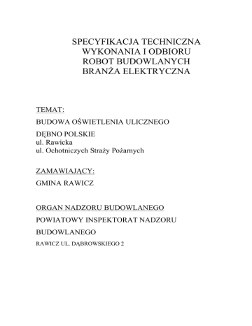 SPECYFIKACJA TECHNICZNA WYKONANIA I ODBIORU ROBOT BUDOWLANYCH BRANśA ELEKTRYCZNA TEMAT: BUDOWA OŚWIETLENIA ULICZNEGO DĘBNO POLSKIE ul. Rawicka ul. Ochotniczych StraŜy PoŜarnych ZAMAWIAJĄCY: GMINA RAWICZ ORGAN NADZORU BUDOWLANEGO POWIATOWY INSPEKTORAT NADZORU BUDOWLANEGO RAWICZ UL. DĄBROWSKIEGO 2 SPECYFIKACJA TECHNICZNA WYKONANIA I ODBIORU ROBÓT BUDOWLANYCH 1. WSTĘP 1.1 Typ robót CPV 45310000-3 roboty w zakresie instalacji elektrycznych CPV 45316000-5 instalowanie systemów oświetleniowych i sygnalizacyjnych CPV 45316100-6 instalowanie zewnętrznego sprzętu oświetleniowego CPV 45316110-9 instalowanie drogowego sprzętu oświetleniowego CPV 45315300-1 instalowanie linii energetycznych CPV 45311000-0 roboty w zakresie przewodów instalacji elektrycznych oraz opraw elektrycznych 1.2 Przedmiot S.T. Przedmiotem niniejszej specyfikacji technicznej są wymagania dotyczące wykonania i odbioru robót w zakresie budowy kablowej linii oświetlenia ulicznego ze słupami oświetleniowymi i szafkami oświetleniowymi w Dębnie Polskim gm. Rawicz ul. Rawickiej i ul.Ochotniczych StraŜy PoŜarnych. 1.3 Zakres stosowania S.T. Specyfikacja Techniczna jest stosowana jako dokument przetargowy przy zlecaniu i realizacji robót wymienionych w punkcie 1.1. 1.4 Zakres robót objętych S.T. Ustalenia zawarte w mniejszej Specyfikacji Technicznej dotyczą prowadzenia robót związanych z wykonaniem instalacji elektrycznych zgodnie z dokumentacją projektową, opisami technicznymi, rysunkami i obejmują budowę kablowej linii oświetlenia ulicznego ze słupami oświetleniowymi: • ułoŜenie projektowanych kabli energetycznych, • posadowienie słupów oświetlenia, • posadowienie szafek oświetlenia ulicznego, 1.5 Określenia podstawowe Określenia podstawowe w niniejszej Specyfikacji Technicznej są zgodne z obowiązującymi odpowiednimi normami. 1.6 Ogólne wymagania dotyczące robót Wykonawca robót jest odpowiedzialny za jakość stosowanych materiałów i wykonywanych robót oraz za zgodność robót z Dokumentacją Projektową, specyfikacją Techniczną i obowiązującymi normami. Wszystkie materiały i urządzenia instalowane zrządzającego w trakcie realizacją wykonywania umowy po robót podlegają przedstawieniu zatwierdzeniu przez przez wykonawcę z wyprzedzeniem 7 dniowym informacji o źródle produkcji, zakupu lub pozyskania materiałów, atestach, wynikach odpowiednich badań i próbek. Ponadto Wykonawca wykona roboty zgodnie z poleceniem Inwestora i Inspektora Nadzoru. Wykonawca jest odpowiedzialny za dokładne w planie i wyznaczenie wysokości wszystkich elementów robót zgodnie z wymiarami i rzędnymi określonymi w dokumentacji projektowej. Następstwa jakiegokolwiek błędu spowodowanego przez wykonawcę w wytyczeniu i wyznaczaniu robót zostaną poprawione przez wykonawcę na własny koszt. Decyzje zarządzającego budową dotyczące akceptacji lub odrzucenia materiałów i elementów robót będą oparte na wymaganiach sformułowanych w umowie, dokumentacji projektowej i specyfikacji technicznej , a takŜe w normach i wytycznych wykonania i odbioru robót. 1.7 Zapewnienie bezpieczeństwa i ochrona zdrowia W trakcie realizacji robót wykonawca będzie stosował się do wszystkich obowiązujących przepisów i wymagań w zakresie bezpieczeństwa i ochrony zdrowia. W tym celu w ramach prac przygotowawczych do realizacji robót , zgodnie z wymogami ustawy-Prawo budowlane jest zobowiązany opracować i przedstawić do akceptacji zarządzającemu realizacją umowy, program zapewnienia bezpieczeństwa i ochrony zdrowia. Na jego podstawie musi zapewnić, Ŝeby personel nie pracował w warunkach, które są niebezpieczne, szkodliwe dla zdrowia i nie spełniają wymogów sanitarnych. 2. MATERIAŁY Materiały do wykonania w/w robót elektrycznych stosować zgodnie z Dokumentacją Projektową, opisami technicznymi, rysunkami i obowiązującymi normami. Dostawa materiałów przeznaczonych do robót elektrycznych powinna nastąpić dopiero po odpowiednim przygotowaniu miejsca montaŜu. Jeśli jest to konieczne ze względu na rodzaj materiałów to powinny być zabezpieczone od zewnętrznych wpływów atmosferycznych. W czasie transportu i składowania końce wszystkich rodzajów kabli i przewodów powinny być zabezpieczone przed zawilgoceniem i innymi wpływami środowiska. Materiały, wyroby i urządzenia, dla których wymaga się świadectwo jakości, np.: aparaty, kable, urządzenia prefabrykowane itp., naleŜy dostarczać wraz ze świadectwami jakości, kartami gwarancyjnymi lub protokołami odbioru technicznego. Przy odbiorze materiałów naleŜy zwrócić uwagę na zgodność stanu faktycznego z dowodami dostawy. Wykonawca jest zobowiązany , Ŝeby materiały i urządzenia tymczasowo składowane na budowie były zabezpieczone przed uszkodzeniem 3. SPRZĘT Roboty elektroenergetyczne mogą być wykonywane ręcznie lub przy uŜyciu sprzętu mechanicznego zaakceptowanego przez Inwestora. Przy mechanicznym wykonywaniu robót Wykonawca powinien dysponować sprzętem sprawnym technicznie, przewidzianym do wykonania tego typu robót, który nie spowoduje niekorzystnego wpływu na jakość wykonywanych robót i środowisko. Roboty ziemne wykonywane na zbliŜenie do urządzeń podziemnych winny być wykonywane ręcznie. Roboty elektryczne prowadzone będą przy uŜyciu następującego sprzętu mechanicznego: 4. śuraw samochodowy o udźwigu 4t (1) Spawarka transformatorowa o max. natęŜeniu do 500A Podnośnik montaŜowy PHM na samochodzie (2) Wibromłot TRANSPORT Materiały przewidziane do wykonania robót mogą być przewoŜone dowolnymi środkami transportu z zachowaniem zasad kodeksu drogowego. Dla materiałów długich naleŜy stosować przyczepy, dłuŜycowe, a materiały wysokie naleŜy zabezpieczyć w czasie transportu przed przewróceniem oraz przesuwaniem. Bębny z kablami naleŜy przetaczać zgodnie z kierunkiem strzałki na tabliczce bębna. Unikać transportu kabli w temperaturz