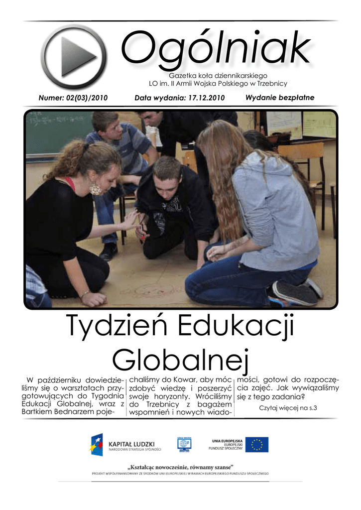 Ogólniak Gazetka koła dziennikarskiego LO im. II Armii Wojska Polskiego w Trzebnicy Numer: 02(03)/2010 Data wydania: 17.12.2010 Wydanie bezpłatne Tydzień Edukacji Globalnej W październiku dowiedzieliśmy się o warsztatach przygotowujących do Tygodnia Edukacji Globalnej, wraz z Bartkiem Bednarzem poje- chaliśmy do Kowar, aby móc mości, gotowi do rozpoczęzdobyć wiedzę i poszerzyć cia zajęć. Jak wywiązaliśmy swoje horyzonty. Wróciliśmy się z tego zadania? do Trzebnicy z bagażem Czytaj więcej na s.3 wspomnień i nowych wiado- 2 AKTUALNOŚCI •03.XI.2010 - Próbna matura z matematyki dla klas III LO (OKE) •03.XI.2010 - Klasa II c LO uczestniczyła w sesji Rady Powiatu •04.XI.2010 - Wyjazd klasy I c i I b LO do Muzeum Narodowego (op. p. K. Możdżeń i A. Biarda) •05.XI.2010 - Szkolny etap Olimpiady Języka Niemieckiego •05. XI. 2010 - Wyjazd klasy I a i II e LO do Biblioteki Pedagogicznej we Wrocławiu (op. p. A. Jagodzińska i J. Majchrzak) •10. XI.2010 - Zaprzysiężenie nowego Prezydium SU •12.XI.2010 - Inauguracja projektu „Mobilny przewodnik po powiecie trzebnickim” •15 -19.XI.2010 - Tydzień Edukacji Globalnej (op. p.Monika Komisarczyk) •15.XI.2010 - Szkolny etap Olimpiady Języka Angielskiego •15.XI.2010 - „Lekcja ze Z.Herbertem” - spotkanie z W. Bonowiczem (op. p. B. Łukaniec) •18.XI.2010 - Etap szkolny Olimpiady Teologii Katolickiej •19. XI.2010 - 6 przedstawicieli klasy I c LO wzięło udział w Internetowym etapie Konkursu „Wirtualny Festiwal Śladów Przeszłości” (op. p. M. Komisarczyk) •22.XI.2010 - Zaduszki Jazzowe (p. B. Łukaniec) •23 - 26.XI.2010 - Próbna matura z Operonem dla klas III LO • 22.XI.2010 - Spotkanie członków wolontariatu z dziennikarką U. Lubecką •29. XI. 2010 - Uczniowie kl. II a LO wzięli udział w „Lekcji historii w Bazylice” (op. p. A Sempik) • 30. XI. 2010 - Ogólnopolska Akcja Góra Grosza • 01.XII.2010 - Światowy Dzień Wali z AIDS • 03. XII. 2010 - Kiermasz wyrobów świątecznych (wolontariat, SAPLO) STOPKA REDAKCYJNA Opiekunka projektu: p. Kamila Możdżeń Berbeć Redaktor naczelny, DTP: Bartosz Bednarz, 1a Reporteży / kolportaż: Iga Lech, 3c Eunika Zięba, 2b Małgorzata Mróz, 1a Patrycja Iwaszuk, 2b Magda Kowalczyk, 2b Aleksandra Maj, 2c Katarzyna Malesa, 2c Marta Adamczyk, 1a Adam Górnicz, 2b Mateusz Hercuń, 2d Konrad Marecki, 1a Gościnnie: Gabriela Czachor, 2d Zdjęcia: Agata Winiarska, 3aG Mateusz Kempa, 2d http://dziennikarzykilku. blogspot.com/ Ogólniak, nr 02/2010, 17.12.2010 OSIĄGNIĘCIA • 26 listopada Karolina Pietraszewska ( III c ) odebrała stypendium PRM • Drużyna w składzie : Jakub Dąbrowski, Karol i Paweł Marschollek z kl. I c, dwukrotnie odpowiedziała najszybciej ze wszystkich drużyn w Polsce, zdobywając nagrody w konkurencji Wirtualnego Festiwalu „Ślady przeszłości” w ramach CEO (op. p. M. Komisarczyk) • Nasze liceum zajęło 51 miejsce (na 213) we współzawodnictwie sportowym, w ramach Dolnośląskiej Licealiady Młodzieży, organizowanej przez Szkolny Związek Sportowy we Wrocławiu w roku szkolnym 2009/2010 • 5 osobowa drużyna LO zajęła VIII miejsce, a Patryk Skóra (II b) indywidualnie 12 miejsce (na 75 osób) w Międzyszkolnych Zawodach Strzeleckich we Wrocławiu (op. p. K. Bartosz) • 4 osobowa drużyna LO zajęła V miejsce w Międzyszkolnych Zawodach strzeleckich Klas Pierwszych w XV LO we Wrocławiu (op. p. K. Bartosz) http://dziennikarzykilku.blogspot.com/ 3 15-19 LISTOPADA 2010 TYDZIEŃ EDUKACJI GLOBALNEJ W POWIATOWYM ZESPOLE SZKÓŁ NR 1 W TRZEBNICY Po krótkim wprowadzeniu, przyszedł czas na prezentację głównego zagadnienia warsztatów – obywatelstwa. Krótka przebieżka po historii, pojęcie obywatela w starożytnych Atenach, czasach feudalnych i współczesności. Przygotowaliśmy salę, przedzielając ją na pół taśmą i przyklejając na jednej ze ścian- TAK, a na równoległej do niej- NIE. Kiedy uczniowie pojawili się w klasie, poprosiliśmy ich o ponowne zajęcie miejsc w kole. Przeszliśmy do bardzo istotnej części warsztatów. Wykorzystaliśmy przedzieloną salę i dwie kartki zawieszone na ścianach. Uczestnicy zależnie od zdania, przy którym będą, mają za zadanie stawiać kroki na jedną ze stron, uzasadniając swoją opinię. Pytanie testowe brzmiało „Czy Pepsi jest lepsza niż Coca-Cola?”. Już na początku wywiązała się żywa dyskusja i przekonujące argumenty obu stron. Przeszliśmy do zagadnień związanych z tematem warsztatów. Największe zainteresowanie, wzbudziło pytanie dotyczące wprowadzenia inwigilacji w Polsce. Uczniowie bardzo wyraźnie zareagowali, natychmiast uzasadniając swoją opinię. Pytanie testowe brzmiało „Czy Pepsi jest lepsza niż Coca-Cola?”. Już na początku wywiązała się żywa dyskusja i przekonujące argumenty obu stron. Przeszliśmy do zagadnień związanych z tematem warsztatów. Największe zainteresowanie, wzbudziło pytanie dotyczące wprowadzenia inwigilacji w Polsce. Uczniowie bardzo wyraźnie zareagowali, natychmiast uzasadniając swoją opinię. Ruszyliśmy do innych klas liceum. Było ich aż 7! Wykorzystywaliśmy tą samą formę przekazu informacji, w każdej klasie reakcje na zadania były bardzo zbliżone, a energizery wzbudzały równie duże emocje. Poniedziałkowe popołudnie upłynęło w świetle działań polityczno-społecznych. W szkolnej auli gościliśmy przedstawicieli lokalnej władzy, szukając odpowiedzi na pytania obywatelskie, rozmawialiśmy z naszymi ekspertami. Każdego dnia spotykaliśmy się na zajęciach z edukacji obywatelskiej. Środa była przełomowym dniem, z jednej strony był to półmetek naszych działań, z drugiej –ważne przedsięwzięcie i wielki test - dla nas. W całej szkole rozwiesiliśmy plaka- 4 Ogólniak, nr 02/2010, 17.12.2010 plakaty promujące emisję krótkometrażowego filmu „W imię honoru”. Piątkowy poranek nie zachęcał do prowadzenia warsztatów, za oknem