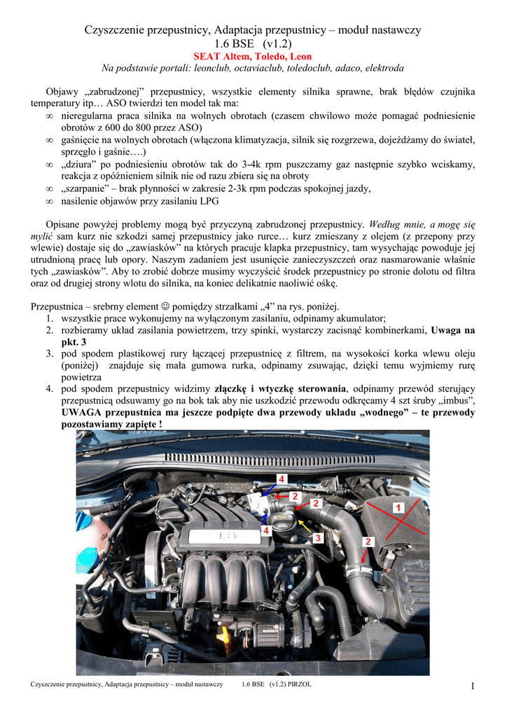 Czyszczenie przepustnicy, Adaptacja przepustnicy – moduł nastawczy 1.6 BSE (v1.2) SEAT Altem, Toledo, Leon Na podstawie portali: leonclub, octaviaclub, toledoclub, adaco, elektroda Objawy „zabrudzonej” przepustnicy, wszystkie elementy silnika sprawne, brak błędów czujnika temperatury itp… ASO twierdzi ten model tak ma: • nieregularna praca silnika na wolnych obrotach (czasem chwilowo może pomagać podniesienie obrotów z 600 do 800 przez ASO) • gaśnięcie na wolnych obrotach (włączona klimatyzacja, silnik się rozgrzewa, dojeżdżamy do świateł, sprzęgło i gaśnie….) • „dziura” po podniesieniu obrotów tak do 3-4k rpm puszczamy gaz następnie szybko wciskamy, reakcja z opóźnieniem silnik nie od razu zbiera się na obroty • „szarpanie” – brak płynności w zakresie 2-3k rpm podczas spokojnej jazdy, • nasilenie objawów przy zasilaniu LPG Opisane powyżej problemy mogą być przyczyną zabrudzonej przepustnicy. Według mnie, a mogę się mylić sam kurz nie szkodzi samej przepustnicy jako rurce… kurz zmieszany z olejem (z przepony przy wlewie) dostaje się do „zawiasków” na których pracuje klapka przepustnicy, tam wysychając powoduje jej utrudnioną pracę lub opory. Naszym zadaniem jest usunięcie zanieczyszczeń oraz nasmarowanie właśnie tych „zawiasków”. Aby to zrobić dobrze musimy wyczyścić środek przepustnicy po stronie dolotu od filtra oraz od drugiej strony wlotu do silnika, na koniec delikatnie naoliwić ośkę. Przepustnica – srebrny element ☺ pomiędzy strzałkami „4” na rys. poniżej. 1. wszystkie prace wykonujemy na wyłączonym zasilaniu, odpinamy akumulator; 2. rozbieramy układ zasilania powietrzem, trzy spinki, wystarczy zacisnąć kombinerkami, Uwaga na pkt. 3 3. pod spodem plastikowej rury łączącej przepustnicę z filtrem, na wysokości korka wlewu oleju (poniżej) znajduje się mała gumowa rurka, odpinamy zsuwając, dzięki temu wyjmiemy rurę powietrza 4. pod spodem przepustnicy widzimy złączkę i wtyczkę sterowania, odpinamy przewód sterujący przepustnicą odsuwamy go na bok tak aby nie uszkodzić przewodu odkręcamy 4 szt śruby „imbus”, UWAGA przepustnica ma jeszcze podpięte dwa przewody układu „wodnego” – te przewody pozostawiamy zapięte ! Czyszczenie przepustnicy, Adaptacja przepustnicy – moduł nastawczy 1.6 BSE (v1.2) PIRZOL 1 Przepustnicę nie wyjmujemy całkowicie z auta ! Pozostanie ona podpięta dwoma przewodami do układu chłodzenia/grzania silnika. Przewody są elastyczne umożliwią nam obracanie o 90 stopni i wyczyszczenie przepustnicy. Do oczyszczenia wnętrza przepustnicy używamy szmatki nasączonej benzyną oraz pędzelka. Czyścimy obydwie strony wlot i wylot. Możemy delikatnie (wymaga jednak siły, uwaga otwiera się tylko w jedną stronę) otworzyć przepustnicę, poruszać w małym zakresie i spryskać osadzenie ośki płynem do czyszczenia przepustnic lub WD-40 (mechanicy niech się wypowiedzą). WD-40 i delikatne ruchy przepustnicą (nacisk palcem) spowodują wypłynięcie osadu i brudu. Po oczyszczeniu i wysuszeniu, polecam zakroplenie osadzenia oski czystym olejem którym mamy zalany silnik i ponowne delikatne jej poruszanie. Widok przepustnicy od strony filtra powietrza. 5. widok wnętrza przepustnicy od strony filtra powietrza 6. ośka i jej osadzenie, tu używamy WD-40 następnie po oczyszczeniu delikatnie oliwimy czystym olejem który mamy zalany silnik 7. złącze sterowania i zasilania Czyszczenie przepustnicy, Adaptacja przepustnicy – moduł nastawczy 1.6 BSE (v1.2) PIRZOL 2 ADAPTACJA Oto wybrane przykłady sytuacji, po których powinno się przeprowadzić omawianą tu procedurę: • Akumulator pojazdu został odłączony, ponownie podłączony lub się rozładował. • Sterownik silnika został wymieniony na nowy lub wymontowany i ponownie zainstalowany. • Zespół przepustnicy został przeczyszczony, wymieniony na nowy lub wymontowany i ponownie zainstalowany. • Pedał przyśpieszenia został wymieniony na nowy lub wymontowany i ponownie zainstalowany. Aby prawidłowo przeprowadzić procedurę adaptacji przepustnicy, muszą zostać spełnione następujące warunki: • Brak błędów a pamięci sterownika silnika. • Napięcie akumulatora przynajmniej 11.5 V • Przepustnica w pozycji: "Bieg jałowy" (noga z gazu). • Przepustnica czysta! • Wyłączone urządzenia elektryczne pobierające dużą ilość energii elektrycznej (ogrzewanie szyb, foteli, klimatyzacja, oświetlenie zewnętrzne) • Temperatura płynu chłodzącego pomiędzy 5 a 95ºC • W niektórych "mniejszych" silnikach (1.0-1.4 ccm np. VW Lupo, Polo...) przed właściwą procedurą adaptacji przepustnicy, należy wykasować wcześniej wyuczone wartości zapisane w sterowniku silnika. Robi się to zapisując wartość "0" na "zerowym" kanale adaptacji (00). PODCZAS WYKONYWANIA POWYŻSZEJ PROCEDURY NIE WOLNO DOTYKAĆ PEDAŁU GAZU I SILNIK NIE MOŻE BYĆ URUCHOMIONY. PROCEDURA ADAPTACJI PRZEPUSTNICY W POJAZDACH Z PRZEPUSTNICˇ DBW (protokół KWP-2000) (Sprawdź czy komunikacja z silnikiem jest realizowana przez protokół KWP-2000 - informacja widoczna w lewym, górnym rogu ekranu "Odczyt z sterownika"). Niektóre przykłady pojazdów, w których sterownik silnika wykorzystuje KWP-2000 ( rok prod. 2002 + ): / A4 / Passat / Touareg. Zapłon włączony, silnik nie pracuje! [Wybór] [01 - Silnik] [Nastawy podst. - 04] Wybierz grupę "060". [Idź!] Na górze ekranu powinna pojawić się informacja: Nastawy podstawowe: OFF. Kliknij przycisk: [ON/OFF/Dalej] Powinien pojawić się komunikat: Nastawy podstawowe: ON. Po przełączeniu na Nastawy podstawowe w górnym, prawym polu ekranu pojawi się informacja: "Adapt. trwa" i rozpocznie się proces adaptacji. Można będzie również usłyszeć pracę przepustnicy i zauważyć jak zmieniają się pewne wartości wyświetlane przez program VAG-COM. System należy pozostawić w nastawach podstawowych przez około 30 sekund, 