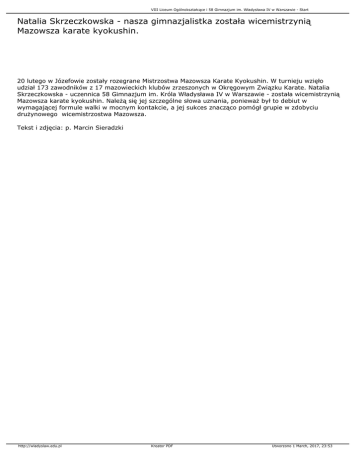 VIII Liceum Ogólnokształcące i 58 Gimnazjum im. Władysława IV w Warszawie - Start Natalia Skrzeczkowska - nasza gimnazjalistka została wicemistrzynią Mazowsza karate kyokushin. 20 lutego w Józefowie zostały rozegrane Mistrzostwa Mazowsza Karate Kyokushin. W turnieju wzięło udział 173 zawodników z 17 mazowieckich klubów zrzeszonych w Okręgowym Związku Karate. Natalia Skrzeczkowska - uczennica 58 Gimnazjum im. Króla Władysława IV w Warszawie - została wicemistrzynią Mazowsza karate kyokushin. Należą się jej szczególne słowa uznania, ponieważ był to debiut w wymagającej formule walki w mocnym kontakcie, a jej sukces znacząco pomógł grupie w zdobyciu drużynowego wicemistrzostwa Mazowsza. Tekst i zdjęcia: p. Marcin Sieradzki http://wladyslaw.edu.pl Kreator PDF Utworzono 1 March, 2017, 23:53
