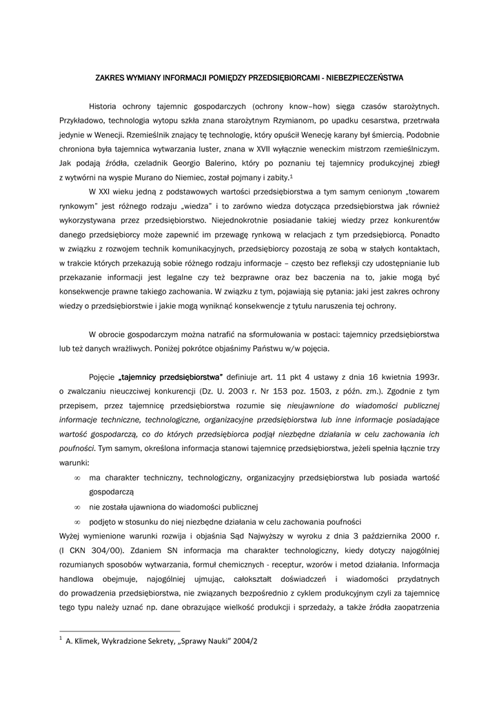 ZAKRES WYMIANY WYMIANY INFORMACJI POMIĘDZY PRZEDSIĘBIORCAMI - NIEBEZPIECZEŃSTWA Historia ochrony tajemnic gospodarczych (ochrony know–how) sięga czasów starożytnych. Przykładowo, technologia wytopu szkła znana starożytnym Rzymianom, po upadku cesarstwa, przetrwała jedynie w Wenecji. Rzemieślnik znający tę technologię, który opuścił Wenecję karany był śmiercią. Podobnie chroniona była tajemnica wytwarzania luster, znana w XVII wyłącznie weneckim mistrzom rzemieślniczym. Jak podają źródła, czeladnik Georgio Balerino, który po poznaniu tej tajemnicy produkcyjnej zbiegł z wytwórni na wyspie Murano do Niemiec, został pojmany i zabity.1 W XXI wieku jedną z podstawowych wartości przedsiębiorstwa a tym samym cenionym „towarem rynkowym” jest różnego rodzaju „wiedza” i to zarówno wiedza dotycząca przedsiębiorstwa jak również wykorzystywana przez przedsiębiorstwo. Niejednokrotnie posiadanie takiej wiedzy przez konkurentów danego przedsiębiorcy może zapewnić im przewagę rynkową w relacjach z tym przedsiębiorcą. Ponadto w związku z rozwojem technik komunikacyjnych, przedsiębiorcy pozostają ze sobą w stałych kontaktach, w trakcie których przekazują sobie różnego rodzaju informacje – często bez refleksji czy udostępnianie lub przekazanie informacji jest legalne czy też bezprawne oraz bez baczenia na to, jakie mogą być konsekwencje prawne takiego zachowania. W związku z tym, pojawiają się pytania: jaki jest zakres ochrony wiedzy o przedsiębiorstwie i jakie mogą wyniknąć konsekwencje z tytułu naruszenia tej ochrony. W obrocie gospodarczym można natrafić na sformułowania w postaci: tajemnicy przedsiębiorstwa lub też danych wrażliwych. Poniżej pokrótce objaśnimy Państwu w/w pojęcia. Pojęcie „tajemnicy przedsiębiorstwa” definiuje art. 11 pkt 4 ustawy z dnia 16 kwietnia 1993r. o zwalczaniu nieuczciwej konkurencji (Dz. U. 2003 r. Nr 153 poz. 1503, z późn. zm.). Zgodnie z tym przepisem, przez tajemnicę przedsiębiorstwa rozumie się nieujawnione do wiadomości publicznej informacje techniczne, technologiczne, organizacyjne przedsiębiorstwa lub inne informacje posiadające wartość gospodarczą, co do których przedsiębiorca podjął niezbędne działania w celu zachowania ich poufności. Tym samym, określona informacja stanowi tajemnicę przedsiębiorstwa, jeżeli spełnia łącznie trzy warunki: • ma charakter techniczny, technologiczny, organizacyjny przedsiębiorstwa lub posiada wartość gospodarczą • nie została ujawniona do wiadomości publicznej • podjęto w stosunku do niej niezbędne działania w celu zachowania poufności Wyżej wymienione warunki rozwija i objaśnia Sąd Najwyższy w wyroku z dnia 3 października 2000 r. (I CKN 304/00). Zdaniem SN informacja ma charakter technologiczny, kiedy dotyczy najogólniej rozumianych sposobów wytwarzania, formuł chemicznych - receptur, wzorów i metod działania. Informacja handlowa obejmuje, najogólniej ujmując, całokształt doświadczeń i wiadomości przydatnych do prowadzenia przedsiębiorstwa, nie związanych bezpośrednio z cyklem produkcyjnym czyli za tajemnicę tego typu należy uznać np. dane obrazujące wielkość produkcji i sprzedaży, a także źródła zaopatrzenia 1 A. Klimek, Wykradzione Sekrety, „Sprawy Nauki” 2004/2 i zbytu, w ujęciu szczegółowym. Informacja "nie ujawniona do wiadomości publicznej" to informacja nieznana ogółowi lub osobom, które ze względu na prowadzoną działalność są zainteresowane jej posiadaniem (konkurencja). Taka informacja staje się "tajemnicą przedsiębiorstwa", kiedy przedsiębiorca dokonuje czynności mających na celu utrzymanie tej informacji w tajemnicy dla pewnych grup odbiorców, konkurentów i wynika to z charakteru tych czynności (np. umieszczenie w umowie o współpracy klauzuli poufności, która rozszerza zakres informacji traktowanych jako tajemnica przedsiębiorstwa). Celem dodatkowego rozwinięcia powyższej informacji, prezentujemy Państwu przykładowe rodzaje informacji, które generowane są przez poszczególne działy w przedsiębiorstwie i stanowią jego tajemnicę: Dotyczy wszystkich działów: • Zakres współpracy w tym: Terminy obowiązywania lub odnawiania umów Potrzeby klientów, np. w zakresie asortymentu, oprogramowania, obsługi, itp. Otrzymane zapytania ofertowe Złożone oferty Fakt prowadzenia negocjacji i ich przebieg Sprzedaż • Lista klientów z danymi na użytek wewnętrzny przedsiębiorcy • Informacje dotyczące osób decyzyjnych u klientów • Ceny transakcyjne, poufne cenniki (np. na określone inwestycje) Marketing • Prognozy i plany sprzedaży • Informacje uzyskane podczas badania konkurencji • Informacje uzyskane podczas badania klientów • Wartość budżetów reklamowych • Plany kampanii marketingowych lub reklamowych Dostawcy, podwykonawcy, pracownicy • Informacje o dostawcach i stosowanych cenach • Informacja o jakości dostaw lub usług poszczególnych dostawców, terminach realizacji • Informacja o stosowanych zakazach konkurencji • Informacje o wynagrodzeniach pracowników Kontrola jakości jakości • Informacje o wadliwościach poszczególnych produktów, zgłaszanych reklamacjach • Statystyki w tym zakresie • Procedury kontroli jakości Produkcja • Informacja koszt-cena • Dane dotyczące dostawców • Stosowane receptury, przepisy, metody produkcji, procedury • Pozytywne i negatywne know-how Badania i rozwój • Plany rozwoju, kierunki rozwoju • Wynalazki przed zgłoszeniem wniosku patentowego • Wyniki badań • Wyniki poszukiwań nowych produktów lub usług • Pozytywne know-how w zakresie badań i rozwoju • Negatywne know-how, czyli informacje o niepowodzeniach i ślepych uliczkach Informacje finansowe • Wewnętrzne dokumenty finansowe • Budżety, prognozy, raporty • Nieujawniane rachunki zysków i strat • Obowiązkowe sprawozdania finansowe przed ujawnieniem Wewnę