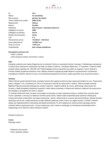 ID: AL4 Status: do sprzedaży Stan budowy: gotowa do użytku Termin oddania do użytku: 2009-10-00 Miejscowość: Albena Nazwa: Serdika Położenie: Nad morzem / wybrzeże północne Odległość od morza: 3800 Odległość od lotniska: 30 km Rodzaj nieruchomości: domy Typ: 4, 5 Powierzchnia od-do: 133.66m2 - 150.43m2 Cena całkowita od: 147000 euro Cena za m2 od: 1100 euro Umeblowanie: jako usługa dodatkowa Szczególnie polecane dla - rodzin z dziećmi - osób ceniących spokój i obcowanie z naturą Opis Kompleks położony jest między Rogachevem (w okolicach Warny) a wybrzeżem Morza Czarnego. Z delikatnego wzniesienia, na którym jest usytuowany rozpościera się widok na Albenę i Kranevo. Kompleks składa się z 17 budynków, z których każdy posiada własny ogródek (ok. 300-350 m2). Wokół każdego domku rozpościera się widok na wzgórza i morze. Można tu również znaleźć przyjemne kawiarnie i bary. Między domkami znajdują się alejki idealne do spacerowania i podziwiania przepięknych widoków. Można tu liczyć na dwudziestoczterogodzinną ochronę, opiekę ogrodnika oraz utrzymanie basenu. Atrakcje Albena oferuje wysoki standard hoteli, pomiędzy którymi dla wygody turystów kursuje wakacyjna kolejka chu-chu. Piaszczysta plaża o długości 7 km i szerokości do 150 m to wymarzone warunki do wypoczynku i relaksu. Albena posiada odznakę Błękitnej Flagi przyznawanej ekologicznie czystym regionom. Łagodne zejście do morza, płytki brzeg, piaszczyste dno morskie, a także kompleksy hotelowych basenów i place zabaw sprawiają, iż Albena jest idealnym miejscem dla wypoczynku dla każdego a szczególnie dla rodzin z dziećmi. To również niezliczona ilość rozrywek, poczynając od słynnego na całym wybrzeżu kasyna z variette show, poprzez kluby nocne i dyskoteki, a kończąc na elitarnym ośrodku jazdy konnej. Albena dzięki znakomitej bazie sportowo rekreacyjnej ceniona jest wśród zwolenników czynnego wypoczynku i sportu. Odbywa się tu coroczny rajd samochodowy, festiwal piosenki dziecięcej oraz liczne, międzynarodowe turnieje siatkówki plażowej, tenisa, boksu czy regaty morskie. W 2002 w Albenie odbyły się międzynarodowe mistrzostwa akrobatyki powietrznej. Po dniu spędzonym wśród promieni gorącego słońca, uliczkami Albeny spacerują turyści, a liczne restauracje, puby i tawerny zachęcają, by skosztować wyśmienitej kuchni i bułgarskiego wina. Można tu także odwiedzić kabaret. Atrakcje turystyczne Cechy Dlaczego warto? Położenie nad morzem Ciche, spokojne miejsce www.menada.pl Doskonałe miejsce dla całej rodziny Cechy: Duży basen Bar Park i aleje spacerowe Parkingi Usługi Z nami nie musisz się martwić o utrzymanie domu w ciągu roku - Dla naszych Klientów zapewniamy utrzymanie nieruchomości, ochronę 24 h przez cały rok, oświetlenie, bezpieczeństwo elektryczne i wodne, naprawy, sprzątanie i czyszczenie części wspólnych, zieleni, czyszczenie apartamentu czy też płatności rachunków. Uzyskiwanie dodatkowych dochodów z ewentualnego wynajmu apartamentu - Zapewniamy bowiem organizację wynajmu apartamentu. Obsługa posprzedażowa Zasady płatności Plan zapłaty 20% przy podpisaniu umowy przedwstępnej 40% przy stanie surowym zamkniętym 20% po wykończeniu posadzek 20% przy oddaniu pod klucz Koszty Cena podana w cenniku jest ostateczna. Należy pamiętać, iż oprócz ceny za nieruchomość dochodzą koszty związane z opłatą notarialną i (jest to około od 3,5% do 4,0% wartości zakupu - w zależności od opcji, którą wybierze Inwestor). www.menada.pl