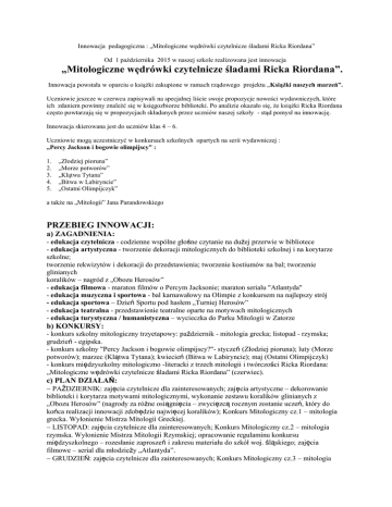 Innowacja pedagogiczna : „Mitologiczne wędrówki czytelnicze śladami Ricka Riordana” Od 1 października 2015 w naszej szkole realizowana jest innowacja „Mitologiczne wędrówki czytelnicze śladami Ricka Riordana”. Innowacja powstała w oparciu o książki zakupione w ramach rządowego projektu „Książki naszych marzeń”. Uczniowie jeszcze w czerwcu zapisywali na specjalnej liście swoje propozycje nowości wydawniczych, które ich zdaniem powinny znaleźć się w księgozbiorze biblioteki. Po analizie okazało się, że książki Ricka Riordana często powtarzają się w propozycjach składanych przez uczniów naszej szkoły - stąd pomysł na innowację. Innowacja skierowana jest do uczniów klas 4 – 6. Uczniowie mogą uczestniczyć w konkursach szkolnych opartych na serii wydawniczej : „Percy Jackson i bogowie olimpijscy” : 1. 2. 3. 4. 5. „Złodziej pioruna” „Morze potworów” „Klątwa Tytana” „Bitwa w Labiryncie” „Ostatni Olimpijczyk” a także na „Mitologii” Jana Parandowskiego PRZEBIEG INNOWACJI: a) ZAGADNIENIA: - edukacja czytelnicza - codzienne wspólne głośne czytanie na dużej przerwie w bibliotece - edukacja artystyczna - tworzenie dekoracji mitologicznych do biblioteki szkolnej i na korytarze szkolne; tworzenie rekwizytów i dekoracji do przedstawienia; tworzenie kostiumów na bal; tworzenie glinianych koralików – nagród z „Obozu Herosów” - edukacja filmowa - maraton filmów o Percym Jacksonie; maraton serialu "Atlantyda" - edukacja muzyczna i sportowa - bal karnawałowy na Olimpie z konkursem na najlepszy strój - edukacja sportowa – Dzień Sportu pod hasłem „Turniej Herosów” - edukacja teatralna - przedstawienie teatralne oparte na motywach mitologicznych - edukacja turystyczna / humanistyczna – wycieczka do Parku Mitologii w Zatorze b) KONKURSY: - konkurs szkolny mitologiczny trzyetapowy: październik - mitologia grecka; listopad - rzymska; grudzień - egipska. - konkurs szkolny "Percy Jackson i bogowie olimpijscy?"- styczeń (Złodziej pioruna); luty (Morze potworów); marzec (Klątwa Tytana); kwiecień (Bitwa w Labiryncie); maj (Ostatni Olimpijczyk) - konkurs międzyszkolny mitologiczno -literacki z trzech mitologii i twórczości Ricka Riordana: „Mitologiczne wędrówki czytelnicze śladami Ricka Riordana” (czerwiec). c) PLAN DZIAŁAŃ: PAŹDZIERNIK: zajęcia czytelnicze dla zainteresowanych; zajęcia artystyczne – dekorowanie biblioteki i korytarza motywami mitologicznymi, wykonanie zestawu koralików glinianych z „Obozu Herosów” (nagrody za różne osiągnięcia – zwycięzcą rocznym zostanie uczeń, który do końca realizacji innowacji zdobędzie najwięcej koralików); Konkurs Mitologiczny cz.1 – mitologia grecka. Wyłonienie Mistrza Mitologii Greckiej. LISTOPAD: zajęcia czytelnicze dla zainteresowanych; Konkurs Mitologiczny cz.2 – mitologia rzymska. Wyłonienie Mistrza Mitologii Rzymskiej; opracowanie regulaminu konkursu międzyszkolnego – rozesłanie zaproszeń i zakresu materiału do szkół woj. śląskiego; zajęcia filmowe – serial dla młodzieży „Atlantyda”. GRUDZIEŃ: zajęcia czytelnicze dla zainteresowanych; Konkurs Mitologiczny cz.3 – mitologia egipska. Wyłonienie Mistrza Mitologii Egipskiej oraz Szkolnego Mistrza Mitologii; zajęcia filmowe – serial dla młodzieży „Atlantyda”. STYCZEŃ: zajęcia czytelnicze dla zainteresowanych; zajęcia filmowe – maraton „Percy’ego Jacksona”; Konkurs Czytelniczy „Percy Jackson i bogowie olimpijscy” cz. 1 – „Złodziej pioruna”. LUTY: zajęcia czytelnicze dla zainteresowanych; zajęcia sportowo-muzyczne – bal na Olimpie; Konkurs Czytelniczy „Percy Jackson i bogowie olimpijscy” cz. 2 – „Morze potworów”. MARZEC: zajęcia czytelnicze dla zainteresowanych; Konkurs Czytelniczy „Percy Jackson i bogowie olimpijscy” cz. 3 – Klątwa Tytana”; zajęcia teatralne – przygotowanie przedstawienia. KWIECIEŃ: zajęcia czytelnicze dla zainteresowanych; Konkurs Czytelniczy „Percy Jackson i bogowie olimpijscy” cz. 4 – „Bitwa w Labiryncie”; zajęcia teatralne – przygotowanie przedstawienia. MAJ: Konkurs Czytelniczy „Percy Jackson i bogowie olimpijscy” cz. 5 – „Ostatni Olimpijczyk”; wyłonienie szkolnego zwycięzcy; zajęcia teatralne – przygotowanie przedstawienia; wycieczka do Parku Mitologii w Zatorze. CZERWIEC: zajęcia sportowe – Dzień Sportu pod hasłem „Turniej Herosów”; zajęcia teatralne – przygotowanie przedstawienia; zajęcia czytelnicze dla zainteresowanych; Międzyszkolny Konkurs Czytelniczy „Mitologiczne wędrówki czytelnicze śladami Ricka Riordana”; impreza podsumowująca konkurs międzyszkolny oraz roczną innowację – rozdanie nagród, przedstawienie teatralne dla społeczności szkolnej oraz zaproszonych gości. CZERWIEC / LIPIEC: informacja o przebiegu innowacji i sprawozdanie z jej realizacji, wzbogacone materiałami zdjęciowymi / filmowymi, zamieszczone na stronie internetowej szkoły oraz przesłane na lokalne portale informacyjne. Autor innowacji : mgr Beata Węgrzynek Współpraca : mgr Anna Milerska, mgr Kornelia Magiera, mgr Ewa Piotrowska, mgr Patryk Misztal Wyniki konkursu „Mitologia grecka” I miejsce : Amelia z klasy 5b – 28 punktów ( 30) II miejsce : Agata z klasy 6 c - 27 punktów III miejsce : Ania z klasy 5a – 26 punktów Uwaga : Konkurs „Mitologia rzymska” – 30 listopada 2015 Uwaga : W grudniu – konkurs „Mitologia egipska” ZAPRASZAMY WSZYSTKICH CHĘTNYCH „ Na kółku plastycznym uczniowie rysowali podobizny postaci mitologicznych oraz wykonywali z modeliny kolorowe koraliki rozdawane uczniom za udział w konkursach szkolnych ”