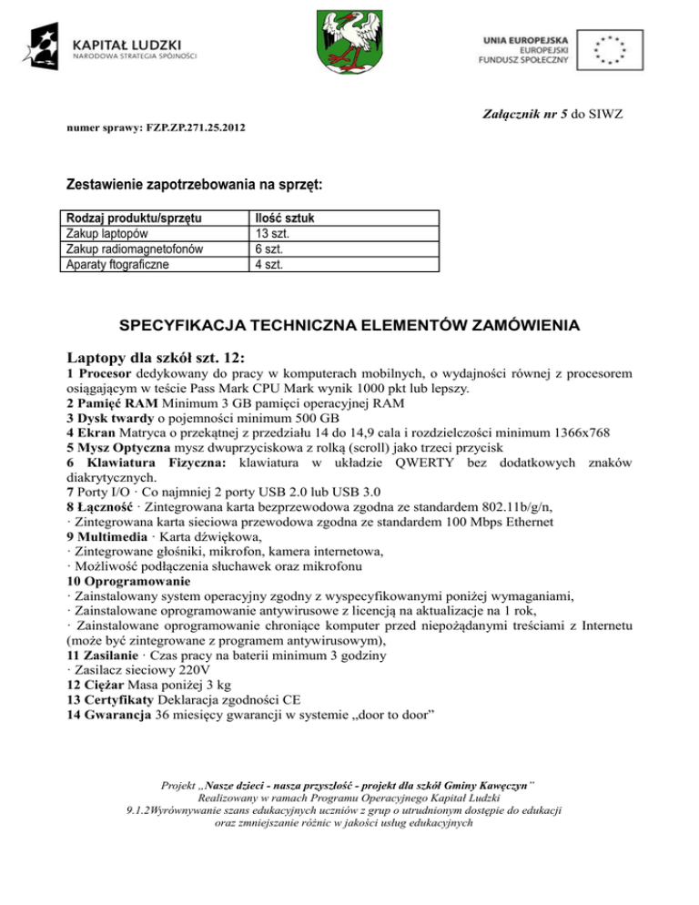 Załącznik nr 5 do SIWZ numer sprawy: FZP.ZP.271.25.2012 Zestawienie zapotrzebowania na sprzęt: Rodzaj produktu/sprzętu Zakup laptopów Zakup radiomagnetofonów Aparaty ftograficzne Ilość sztuk 13 szt. 6 szt. 4 szt. SPECYFIKACJA TECHNICZNA ELEMENTÓW ZAMÓWIENIA Laptopy dla szkół szt. 12: 1 Procesor dedykowany do pracy w komputerach mobilnych, o wydajności równej z procesorem osiągającym w teście Pass Mark CPU Mark wynik 1000 pkt lub lepszy. 2 Pamięć RAM Minimum 3 GB pamięci operacyjnej RAM 3 Dysk twardy o pojemności minimum 500 GB 4 Ekran Matryca o przekątnej z przedziału 14 do 14,9 cala i rozdzielczości minimum 1366x768 5 Mysz Optyczna mysz dwuprzyciskowa z rolką (scroll) jako trzeci przycisk 6 Klawiatura Fizyczna: klawiatura w układzie QWERTY bez dodatkowych znaków diakrytycznych. 7 Porty I/O · Co najmniej 2 porty USB 2.0 lub USB 3.0 8 Łączność · Zintegrowana karta bezprzewodowa zgodna ze standardem 802.11b/g/n, · Zintegrowana karta sieciowa przewodowa zgodna ze standardem 100 Mbps Ethernet 9 Multimedia · Karta dźwiękowa, · Zintegrowane głośniki, mikrofon, kamera internetowa, · Możliwość podłączenia słuchawek oraz mikrofonu 10 Oprogramowanie · Zainstalowany system operacyjny zgodny z wyspecyfikowanymi poniżej wymaganiami, · Zainstalowane oprogramowanie antywirusowe z licencją na aktualizacje na 1 rok, · Zainstalowane oprogramowanie chroniące komputer przed niepożądanymi treściami z Internetu (może być zintegrowane z programem antywirusowym), 11 Zasilanie · Czas pracy na baterii minimum 3 godziny · Zasilacz sieciowy 220V 12 Ciężar Masa poniżej 3 kg 13 Certyfikaty Deklaracja zgodności CE 14 Gwarancja 36 miesięcy gwarancji w systemie „door to door” Projekt „Nasze dzieci - nasza przyszłość - projekt dla szkół Gminy Kawęczyn” Realizowany w ramach Programu Operacyjnego Kapitał Ludzki 9.1.2Wyrównywanie szans edukacyjnych uczniów z grup o utrudnionym dostępie do edukacji oraz zmniejszanie różnic w jakości usług edukacyjnych Laptop dla biura projektu szt. 1: 1 Procesor: dedykowany do pracy w komputerach mobilnych, o wydajności równej z procesorem osiągającym w teście Pass Mark CPU Mark wynik 1800 pkt lub lepszy. 2 Pamięć: RAM Minimum 4 GB pamięci operacyjnej RAM 3 Dysk Twardy: o pojemności minimum 500 GB 4 Matryca: o przekątnej z przedziału 14,9 do 15,9 cala i rozdzielczości minimum 1366x768 5 Napęd optyczny: napęd optyczny z możliwością zapisu i odczytu nośników DVD+/- RW/RAM 6 Mysz Optyczna: mysz dwuprzyciskowa z rolką (scroll) jako trzeci przycisk 7 Klawiatura: Fizyczna klawiatura w układzie QWERTY bez dodatkowych znaków diakrytycznych. 8 Porty: I/O · Co najmniej 3 porty USB 2.0 lub USB 3.0, · Złącze VGA lub możliwość podłączenia VGA za pomocą przejściówki, · Złącze HDMI 9 Łączność: zintegrowana karta bezprzewodowa zgodna ze standardem 802.11b/g/n, · Zintegrowana karta sieciowa przewodowa zgodna ze standardem 100 Mbps Ethernet 10 Multimedia · Karta dźwiękowa, · Zintegrowane głośniki, mikrofon, kamera internetowa, · Możliwość podłączenia słuchawek oraz mikrofonu · Uniwersalny czytnik zewnętrznych kart pamięci 11 Oprogramowanie · Zainstalowany system operacyjny zgodny z wyspecyfikowanymi poniżej wymaganiami, · Zainstalowane oprogramowanie antywirusowe z licencją na aktualizacje na 1 rok, · Zainstalowane oprogramowanie chroniące komputer przed niepożądanymi treściami z Internetu (może być zintegrowane z programem antywirusowym), · Zainstalowany pakiet oprogramowania biurowego zgodny z wyspecyfikowanymi poniżej wymaganiami. 12 Zasilanie · Czas pracy na baterii minimum 4 godziny · Zasilacz sieciowy 220V 13 Ciężar: Masa poniżej 3 kg 14 Certyfikaty: Deklaracja zgodności CE 15 Gwarancja: 36 miesięcy gwarancji w systemie „door to door”. Specyfikacja systemu operacyjnego dla komputerów szkół i biura 1. System operacyjny z graficznym interfejsem użytkownika w języku polskim, w tym także system interaktywnej pomocy w języku polskim. Zlokalizowane w języku polskim, co najmniej następujące elementy: menu, odtwarzacz multimediów, pomoc, komunikaty systemowe. 2. System operacyjny powinien mieć zintegrowany system aktualizacji darmowych poprawek bezpieczeństwa, przy czym komunikacja z użytkownikiem powinna odbywać się w języku polskim. 3. System operacyjny musi mieć publicznie znany cykl życia przedstawiony przez producenta i dotyczący rozwoju i wsparcia technicznego – w szczególności w zakresie bezpieczeństwa. 4. Możliwość zdalnej automatycznej instalacji, konfiguracji, administrowania oraz aktualizowania systemu. 5. System operacyjny musi pozwalać na pracę w różnych sieciach komputerowych (sieci lokalne Projekt „Nasze dzieci - nasza przyszłość - projekt dla szkół Gminy Kawęczyn” Realizowany w ramach Programu Operacyjnego Kapitał Ludzki 9.1.2Wyrównywanie szans edukacyjnych uczniów z grup o utrudnionym dostępie do edukacji oraz zmniejszanie różnic w jakości usług edukacyjnych LAN, Internet), w tym także automatycznie rozpoznawać sieci i ich ustawienia bezpieczeństwa, rozpoznawać automatycznie urządzenia peryferyjne działające w tej sieci np. drukarki, tablice interaktywne oraz łączyć się automatycznie z raz zdefiniowanymi sieciami. 6. System operacyjny musi pozwalać na uruchomienie niezbędnych aplikacji i przyłączenie się do odpowiednich sieci w Systemie Informacji Oświatowej. 7. System operacyjny przystosowany do pracy z aplikacjami w modelu chmury obliczeniowej, 8. System operacyjny pozwalający na wdrążenie jednolitej polityki bezpieczeństwa dla wszystkich komputerów w sieci szkolnej. Specyfikacja oprogramowania biurowego dla przenośnego komputera: 1. zintegrowany pakiet aplikacji biurowych musi zawierać co najmniej: a) edytor tekstów b) arkusz kalkulacyjny c) narzędzie do prowadzenia i przygotowania prezentacji d)zainstalowanie na jednym komputerze produktów pochodzą