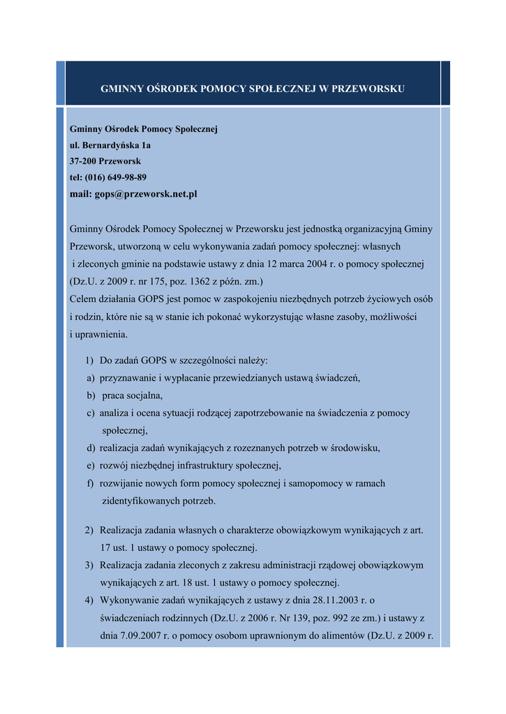 GMINNY OŚRODEK POMOCY SPOŁECZNEJ W PRZEWORSKU Gminny Ośrodek Pomocy Społecznej ul. Bernardyńska 1a 37-200 Przeworsk tel: (016) 649-98-89 mail: [email protected] Gminny Ośrodek Pomocy Społecznej w Przeworsku jest jednostką organizacyjną Gminy Przeworsk, utworzoną w celu wykonywania zadań pomocy społecznej: własnych i zleconych gminie na podstawie ustawy z dnia 12 marca 2004 r. o pomocy społecznej (Dz.U. z 2009 r. nr 175, poz. 1362 z późn. zm.) Celem działania GOPS jest pomoc w zaspokojeniu niezbędnych potrzeb życiowych osób i rodzin, które nie są w stanie ich pokonać wykorzystując własne zasoby, możliwości i uprawnienia. 1) Do zadań GOPS w szczególności należy: a) przyznawanie i wypłacanie przewiedzianych ustawą świadczeń, b) praca socjalna, c) analiza i ocena sytuacji rodzącej zapotrzebowanie na świadczenia z pomocy społecznej, d) realizacja zadań wynikających z rozeznanych potrzeb w środowisku, e) rozwój niezbędnej infrastruktury społecznej, f) rozwijanie nowych form pomocy społecznej i samopomocy w ramach zidentyfikowanych potrzeb. 2) Realizacja zadania własnych o charakterze obowiązkowym wynikających z art. 17 ust. 1 ustawy o pomocy społecznej. 3) Realizacja zadania zleconych z zakresu administracji rządowej obowiązkowym wynikających z art. 18 ust. 1 ustawy o pomocy społecznej. 4) Wykonywanie zadań wynikających z ustawy z dnia 28.11.2003 r. o świadczeniach rodzinnych (Dz.U. z 2006 r. Nr 139, poz. 992 ze zm.) i ustawy z dnia 7.09.2007 r. o pomocy osobom uprawnionym do alimentów (Dz.U. z 2009 r. Nr 1 poz. 7 ze zm.) jako zlecone gminie z zakresu administracji rządowej. 5) Realizacja zadań wynikających z ustawy z dnia 9.06.2011 r. o wspieraniu rodziny i systemie pieczy zastępczej (Dz.U. Nr 149, poz. 887) 6) Realizacja "Niebieskiej Karty" w związku z wykonywaniem zadań wynikających z ustawy z dnia 29 lipca 2005 roku o przeciwdziałaniu przemocy w rodzinie ( Dz. U. z 2005 r. Nr 180, poz. 1493 z późn. zm.) Pomocy społecznej na zasadach określonych w ustawie o pomocy społecznej udziela się osobom i rodzinom w szczególności z powodu: 1) ubóstwa, 2) sieroctwa, 3) bezdomności, 4) bezrobocia, 5) niepełnosprawności, 6) długotrwałej lub ciężkiej choroby, 7) przemocy w rodzinie, 7a) potrzeby ochrony ofiar handlu ludźmi, 8) potrzeby ochrony macierzyństwa lub wielodzietności, 9) bezradności w sprawach opiekuńczo-wychowawczych i prowadzenia gospodarstwa domowego, zwłaszcza w rodzinach niepełnych lub wielodzietnych, 10) trudności w integracji cudzoziemców, którzy uzyskali w Rzeczypospolitej Polskiej status uchodźcy lub ochronę uzupełniającą, 11) trudności w przystosowaniu do życia po zwolnieniu z zakładu karnego, 12) alkoholizmu lub narkomanii, 13) klęski żywiołowej lub ekologicznej. Prawo do świadczeń pieniężnych z pomocy społecznej przysługuje: 1) osobie samotnie gospodarującej, której dochód nie przekracza kwoty 634,00 zł 2) osobie w rodzinie, której dochód na osobę nie przekracza kwoty 514,00 zł 3) rodzinie, której dochód nie przekracza sumy kwot kryterium dochodowego na osobę w rodzinie - przy jednoczesnym wystąpieniu co najmniej jednego z powodów wymienionych powyżej lub innych okoliczności uzasadniających udzielenie pomocy społecznej Świadczeniami z pomocy społecznej są: 1) Świadczenia pieniężne: a) zasiłek stały, b) zasiłek okresowy, c) zasiłek celowy i specjalny zasiłek celowy, d) świadczenie pieniężne na utrzymanie i pokrycie wydatków związanych z nauką języka polskiego dla cudzoziemców, którzy uzyskali w Rzeczypospolitej Polskiej status uchodźcy, ochronę uzupełniającą lub zezwolenia na pobyt czasowy udzielone w związku z okolicznością o której mowa w art. 159 ust. 1 pkt. 1 lit. c lub d ustawy z dnia 12 grudnia 2013 r. o cudzoziemcach, e) wynagrodzenie należne opiekunowi z tytułu sprawowania opieki przyznane przez sąd 2) Świadczenia niepieniężne: a) praca socjalna, b) bilet kredytowany, c) składki na ubezpieczenie zdrowotne, d) składki na ubezpieczenia społeczne, e) pomoc rzeczowa, w tym na ekonomiczne usamodzielnienie, f) sprawienie pogrzebu, g) poradnictwo specjalistyczne, h) interwencja kryzysowa, i) schronienie, j) posiłek, k) niezbędne ubranie, l) usługi opiekuńcze w miejscu zamieszkania, w ośrodkach wsparcia oraz w rodzinnych domach pomocy, m) specjalistyczne usługi opiekuńcze w miejscu zamieszkania oraz w ośrodkach wsparcia, n) mieszkania chronione, o) pobyt i usługi w domu pomocy społecznej, p) opieka i wychowanie w rodzinie zastępczej i w placówce opiekuńczowychowawczej. ŚWIADCZENIA RODZINNE Świadczeniami rodzinnymi są: 1) Zasiłek rodzinny i dodatki do zasiłku rodzinnego 2) Jednorazowa zapomoga z tytułu urodzenia się dziecka 3) Świadczenia opiekuńcze: zasiłek pielęgnacyjny, specjalny zasiłek opiekuńczy, świadczenie pielęgnacyjne Zasiłek rodzinny i dodatki do zasiłku rodzinnego Prawo do zasiłku rodzinnego, który ma na celu częściowe pokrycie wydatków na utrzymanie dziecka, przysługuje rodzicom, jednemu z rodziców, opiekunowi prawnemu lub faktycznemu dziecka, do ukończenia przez dziecko 18 lat. Okres ten wydłuża się 1) do 21 lat, jeśli dziecko uczy się w szkole (nie dotyczy studiów) 2) do 24 lat, jeśli dziecko uczy się lub studiuje i legitymuje się orzeczeniem o umiarkowanym albo znacznym stopniu niepełnosprawności. Do ukończenia 24 roku życia przysługuje także osobie uczącej się (pełnoletnia osoba, która się uczy i jednocześnie utrzymuje się samodzielnie, gdyż rodzice nie żyją, bądź od obojga zasądzono alimenty. Prawo do zasiłku rodzinnego ustala się na okres zasiłkowy, który trwa od dnia 1 listopada do dnia 31 października następnego roku kalendarzowego - począwszy od miesiąca, w którym wpłynął wniosek z prawidłowo wypełnionymi dokumentami i jest uzależniony m.in. od spełnienia kryterium dochodowego: dochód nie może przekroczy kwoty 674,00 zł