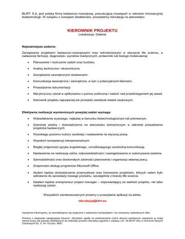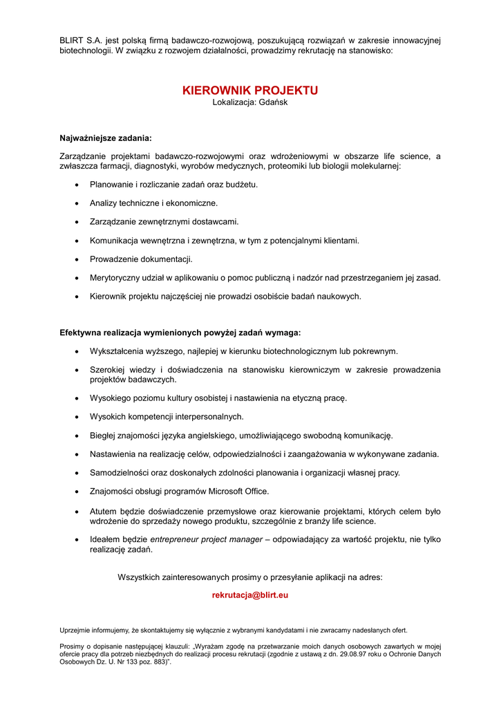 BLIRT S.A. jest polską firmą badawczo-rozwojową, poszukującą rozwiązań w zakresie innowacyjnej biotechnologii. W związku z rozwojem działalności, prowadzimy rekrutację na stanowisko: KIEROWNIK PROJEKTU Lokalizacja: Gdańsk Najważniejsze zadania: Zarządzanie projektami badawczo-rozwojowymi oraz wdrożeniowymi w obszarze life science, a zwłaszcza farmacji, diagnostyki, wyrobów medycznych, proteomiki lub biologii molekularnej: Planowanie i rozliczanie zadań oraz budżetu. Analizy techniczne i ekonomiczne. Zarządzanie zewnętrznymi dostawcami. Komunikacja wewnętrzna i zewnętrzna, w tym z potencjalnymi klientami. Prowadzenie dokumentacji. Merytoryczny udział w aplikowaniu o pomoc publiczną i nadzór nad przestrzeganiem jej zasad. Kierownik projektu najczęściej nie prowadzi osobiście badań naukowych. Efektywna realizacja wymienionych powyżej zadań wymaga: Wykształcenia wyższego, najlepiej w kierunku biotechnologicznym lub pokrewnym. Szerokiej wiedzy i doświadczenia na stanowisku kierowniczym w zakresie prowadzenia projektów badawczych. Wysokiego poziomu kultury osobistej i nastawienia na etyczną pracę. Wysokich kompetencji interpersonalnych. Biegłej znajomości języka angielskiego, umożliwiającego swobodną komunikację. Nastawienia na realizację celów, odpowiedzialności i zaangażowania w wykonywane zadania. Samodzielności oraz doskonałych zdolności planowania i organizacji własnej pracy. Znajomości obsługi programów Microsoft Office. Atutem będzie doświadczenie przemysłowe oraz kierowanie projektami, których celem było wdrożenie do sprzedaży nowego produktu, szczególnie z branży life science. Ideałem będzie entrepreneur project manager – odpowiadający za wartość projektu, nie tylko realizację zadań. Wszystkich zainteresowanych prosimy o przesyłanie aplikacji na adres: [email protected] Uprzejmie informujemy, że skontaktujemy się wyłącznie z wybranymi kandydatami i nie zwracamy nadesłanych ofert. Prosimy o dopisanie następującej klauzuli: „Wyrażam zgodę na przetwarzanie moich danych osobowych zawartych w mojej ofercie pracy dla potrzeb niezbędnych do realizacji procesu rekrutacji (zgodnie z ustawą z dn. 29.08.97 roku o Ochronie Danych Osobowych Dz. U. Nr 133 poz. 883)”.