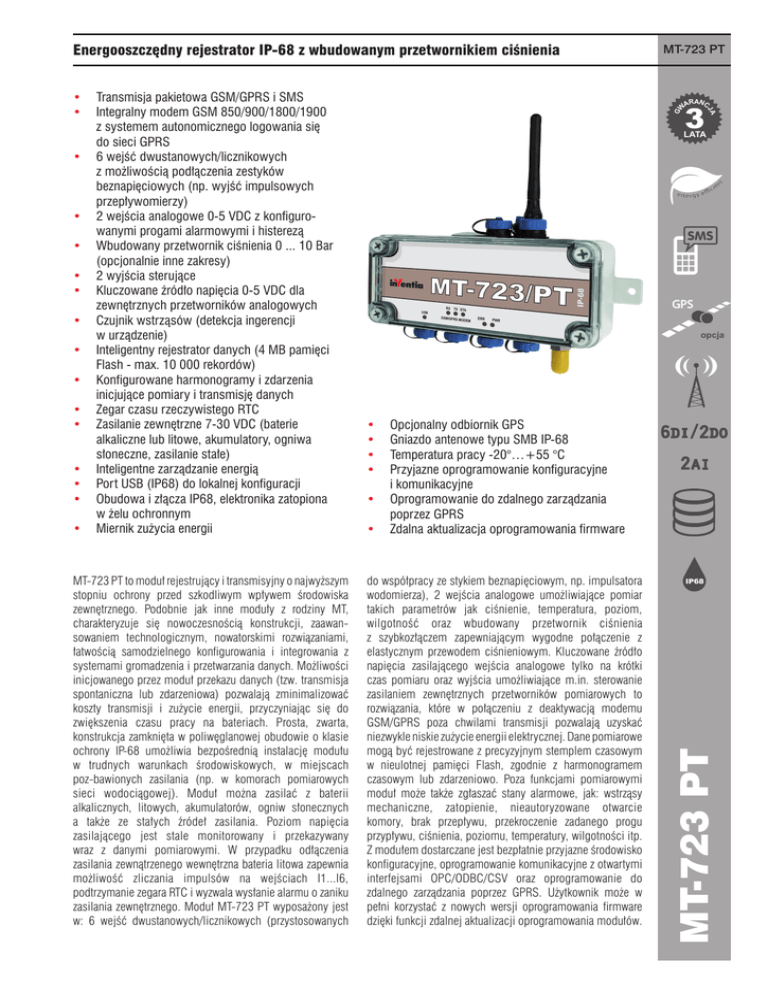 Energooszczędny rejestrator IP-68 z wbudowanym przetwornikiem ciśnienia G LATA e-mail IP67 GPS GPRS MODEM • • • • Opcjonalny odbiornik GPS Gniazdo antenowe typu SMB IP-68 Temperatura pracy -20°…+55 °C Przyjazne oprogramowanie konfiguracyjne i komunikacyjne • Oprogramowanie do zdalnego zarządzania poprzez GPRS • Zdalna aktualizacja oprogramowania firmware do współpracy ze stykiem beznapięciowym, np. impulsatora e-mail wodomierza), 2 wejścia analogowe umożliwiające pomiar takich parametrów jak ciśnienie, temperatura, poziom, wilgotność oraz wbudowany przetwornik ciśnienia z szybkozłączem zapewniającym wygodne połączenie z elastycznym przewodem ciśnieniowym. Kluczowane źródło napięcia zasilającego wejścia analogowe tylko naGPRS krótki MODEM czas pomiaru oraz wyjścia umożliwiające m.in. sterowanie zasilaniem zewnętrznych przetworników pomiarowych to rozwiązania, które w połączeniu z deaktywacją modemu GSM/GPRS poza chwilami transmisji pozwalają uzyskać niezwykle niskie zużycie energii elektrycznej. Dane pomiarowe mogą być rejestrowane z precyzyjnym stemplem czasowym w nieulotnej pamięci Flash, zgodnie z harmonogramem czasowym lub zdarzeniowo. Poza funkcjami pomiarowymi moduł może także zgłaszać stany alarmowe, jak: wstrząsy mechaniczne, zatopienie, nieautoryzowane otwarcie komory, brak przepływu, przekroczenie zadanego progu przypływu, ciśnienia, poziomu, temperatury, wilgotności itp. Z modułem dostarczane jest bezpłatnie przyjazne środowisko konfiguracyjne, oprogramowanie komunikacyjne z otwartymi interfejsami OPC/ODBC/CSV oraz oprogramowanie do zdalnego zarządzania poprzez GPRS. Użytkownik może w pełni korzystać z nowych wersji oprogramowania firmware dzięki funkcji zdalnej aktualizacji oprogramowania modułów. IP68 opcja 6di/2do 2ai IP67 IP68 MT-723 PT MT-723 PT to moduł rejestrujący i transmisyjny o najwyższym stopniu ochrony przed szkodliwym wpływem środowiska zewnętrznego. Podobnie jak inne moduły z rodziny MT, charakteryzuje się nowoczesnością konstrukcji, zaawansowaniem technologicznym, nowatorskimi rozwiązaniami, łatwością samodzielnego konfigurowania i integrowania z systemami gromadzenia i przetwarzania danych. Możliwości inicjowanego przez moduł przekazu danych (tzw. transmisja spontaniczna lub zdarzeniowa) pozwalają zminimalizować koszty transmisji i zużycie energii, przyczyniając się do zwiększenia czasu pracy na bateriach. Prosta, zwarta, konstrukcja zamknięta w poliwęglanowej obudowie o klasie ochrony IP-68 umożliwia bezpośrednią instalację modułu w trudnych warunkach środowiskowych, w miejscach poz-bawionych zasilania (np. w komorach pomiarowych sieci wodociągowej). Moduł można zasilać z baterii alkalicznych, litowych, akumulatorów, ogniw słonecznych a także ze stałych źródeł zasilania. Poziom napięcia zasilającego jest stale monitorowany i przekazywany wraz z danymi pomiarowymi. W przypadku odłączenia zasilania zewnątrzenego wewnętrzna bateria litowa zapewnia możliwość zliczania impulsów na wejściach I1...I6, podtrzymanie zegara RTC i wyzwala wysłanie alarmu o zaniku zasilania zewnętrznego. Moduł MT-723 PT wyposażony jest w: 6 wejść dwustanowych/licznikowych (przystosowanych ARANC W JA • Transmisja pakietowa GSM/GPRS i SMS • Integralny modem GSM 850/900/1800/1900 z systemem autonomicznego logowania się do sieci GPRS • 6 wejść dwustanowych/licznikowych z możliwością podłączenia zestyków beznapięciowych (np. wyjść impulsowych przepływomierzy) • 2 wejścia analogowe 0-5 VDC z konfigurowanymi progami alarmowymi i histerezą • Wbudowany przetwornik ciśnienia 0 ... 10 Bar (opcjonalnie inne zakresy) • 2 wyjścia sterujące • Kluczowane źródło napięcia 0-5 VDC dla zewnętrznych przetworników analogowych • Czujnik wstrząsów (detekcja ingerencji w urządzenie) • Inteligentny rejestrator danych (4 MB pamięci Flash - max. 10 000 rekordów) • Konfigurowane harmonogramy i zdarzenia inicjujące pomiary i transmisję danych • Zegar czasu rzeczywistego RTC • Zasilanie zewnętrzne 7-30 VDC (baterie alkaliczne lub litowe, akumulatory, ogniwa słoneczne, zasilanie stałe) • Inteligentne zarządzanie energią • Port USB (IP68) do lokalnej konfiguracji • Obudowa i złącza IP68, elektronika zatopiona w żelu ochronnym • Miernik zużycia energii MT-723 PT Dane Techniczne MT-723 PT Ogólne Rejestrator Wymiary (dł. x szer. x wys.) 80x170x65 mm Waga 870 g Sposób mocowania 4 otwory Temperatura pracy Typ pamięci Pojemność pamięci Minimalny okres zapisu FLASH 4 MB (10 000 rekordów) 1s -20 ... +55 °C Klasa ochrony IP68 Środowisko konfiguracyjne Modem GSM/GPRS Typ modemu SIERRA WIRELESS GSM Czterozakresowy (850/900/1800/1900) Zakresy częstotliwości: GSM 850 EGSM 900 DCS 1800 PCS 1900 Moc szczytowa nadajnika GSM850/EGSM900 Moc szczytowa nadajnika DCS1800/PCS1900 Modulacja Odstęp międzykanałowy Antena Nadajnik: 824 MHz – 849 MHz Odbiornik: 869 MHz– 894 MHz Nadajnik: 880 MHz – 915 MHz Odbiornik: 925 MHz– 960 MHz Nadajnik: 1710 MHz – 1785 MHz Odbiornik: 1805 MHz– 1880 MHz Nadajnik: 1850 MHz– 1910 MHz Odbiornik: 1930 MHz– 1990 MHz 33 dBm (2W) stacja klasy 4 30 dBm (1W) stacja klasy 1 0,3 GMSK 200 kHz 50 Ω Rysunki i wymiary (wszystkie wymiary w milimetrach) Zasilanie Zakres dopuszczalnych napięć zasilających Średni prąd w stanie uśpienia modemu (dla 12 V) Średni prąd w trybie aktywności modemu GSM (dla 12 V) Maksymalny chwilowy prąd w trybie aktywności modemu GSM (dla 12 V) 7 ... 30 VDC < 250 µA 25 mA 500 mA Wejścia analogowe AN2...AN3 (napięciowe, różnicowe) Zakres pomiarowy Rezystancja wejściowa Rozdzielczość Dokładność w pełnym zakresie temperatur Dokładność w 25°C 0 ... 5,0 V >600 kΩ typ. 12 bitów ± 0,3 % ± 0,1 % Wbudowany przetwornik ciśnienia AN1 Zakres pomiarowy Temperatura medium Dokładność 0 ... 10 Bar 0 ... 80 °C 0,5 % MT-723 PT Wejścia binarne 