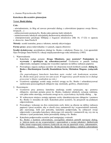 s. Joanna Wojciechowska FMA Katecheza dla uczniów gimnazjum Temat: Boski dialog. Cele: - uświadomienie, że Bóg od zawsze prowadzi dialog z człowiekiem (poprzez swoje Słowo, świętych…) - zafascynowanie postacią Ks. Bosko jako patrona ludzi młodych - zainteresowanie młodych salezjańską duchowością młodzieżową - zinterpretowanie perykopy biblijnej o bogatym młodzieńcu (Mk 10, 17-22) w oparciu o słowa św. Jana Pawła II Metody: scenki teatralne, praca z tekstem, metody aktywizujące Formy pracy: praca indywidualna i w parach, zajęcia zbiorowe Środki dydaktyczne: przykładowe dialogi ks. Bosko z młodymi, Pismo św., List apostolski Ojca Świętego Jana Pawła II z okazji międzynarodowego roku młodzieży (1985) 1. Wprowadzenie Katecheta zadaje pytanie: Droga Młodzieży, jacy jesteście? Podejmijcie to wyzwanie i spróbujcie się scharakteryzować! Uczniowie w parach szukają odpowiedzi, następnie zostają one wszystkie zapisane na tablicy (arkuszu papieru). Prowadzący zajęcia zachęca uczniów do obejrzenia trzech krótkich scenek: dialog ks. Bosko z Bartłomiejem Garelli, Dominikiem Savio, Michałem Magone. (załącznik I) (Na poprzedzającej katechezie katecheta może rozdać role konkretnym uczniom. Ks. Bosko może grać zawsze ten sam uczeń. W najprostszy sposób można też te dialogi przeczytać w klasie z podziałem na role.) Uczniowie oglądając scenki mają zwrócić uwagę na Ks. Bosko i scharakteryzować zachowanie poszczególnych chłopców (np. nieśmiały, gorliwy, zbuntowany) 2. Rozwinięcie: Uczniowie przy pomocy katechety analizują scenki sytuacyjne, np.: postawy chłopców, stawiane pytania przez ks. Bosko, trudności młodych, sytuacja rodzinna, cele jakie sobie stawiają, zwrócenie uwagi na to, czym kończy się każdy dialog … itp. W widocznym miejscu zostają zapisane cechy charakterystyczne chłopców i postawa Ks. Bosko w stosunku do nich. Katecheta prosi uczniów, by przyjrzeli się podanym odpowiedziom. Prowadzący wskazuje na dwa zestawienia cech, które są obecne na tablicy (arkuszu papieru) i prosi uczniów, aby w chwili ciszy zastanowili się i wypowiedzieli wniosek, jaki zauważają. Jeśli jest potrzeba, katecheta podpowiada, by zobaczyli swoje odpowiedzi z początku katechezy (dotyczące ich samych) i zastanowili się, czy nie są zbieżne z tymi postaciami, które prowadziły dialog z ks. Bosko. Katecheta podprowadza uczniów pod następujący wniosek: Ks. Bosko z każdym człowiekiem, szczególnie młodym potrafił nawiązać dialog, w którym może on się wypowiedzieć i opowiedzieć o swojej młodości. Jakikolwiek byłby temat rozpoczętej rozmowy kończyła się ona na sprawach wiary, sakramentów, Maryi, świętości… Także dzisiaj Ks. Bosko prowadzi dialog z młodym człowiekiem 1 proponując mu świętość w codzienności, kierując jego wzrok na Chrystusa. Młodzi byli centrum życia ks. Bosko, dla nich oddał swoje życie, jest ich Ojcem, Nauczycielem, Patronem. Po podsumowaniu dialogów z ks. Bosko katecheta ukazuje postać Boga, który od zawsze rozmawiał z człowiekiem. Na potwierdzenie tych słów prowadzący czyta fragment o bogatym młodzieńcu Mk 10, 17-22. Katecheta rozdaje uczniom fragmenty listu apostolskiego Ojca Świętego Jana Pawła II do młodych całego świata z okazji międzynarodowego roku młodzieży (1985) (załącznik II), które są pomocą do analizy tekstu biblijnego o bogatym młodzieńcu Mk 10, 17-22. Czytając katechizowani podkreślają zdanie, które jest dla nich osobistym przesłaniem. Jeśli ktoś z uczniów chce, może przeczytać na głos wybrane przez siebie słowa z listu. Wniosek katechety: Chrystus prowadzi dialog z młodym człowiekiem, proponuje mu nieprzemijające wartości. Św. Jan Paweł II ukazuje młodość jako bogactwo. Młodość może być święta! 3. Podsumowanie: Prowadzący katechezę przedstawia salezjańską duchowość młodzieżową prowadzącą do świętości w codzienności na przykładzie przepisu na świętość, który ks. Bosko podarował Dominikowi Savio: „Po pierwsze : radość. To, co niepokoi i odbiera spokój, nie pochodzi od Boga. Po drugie: obowiązki związane z nauką i z pobożnością. Uwaga w szkole, gorliwość w nauce, gorliwość w modlitwie. Wszystko rób z miłości do Boga, a nie dla ambicji. Po trzecie: czyń dobrze drugim. Zawsze pomagaj swym kolegom, nawet gdy to wymaga ofiar. Świętość sprowadza się do tego właśnie.” („Spełniony sen.” Opowieść biograficzna o świętym Janie Bosko Teresio Bosco, Wydawnictwo salezjańskie, Warszawa 1988 r.; 336) 12 czerwca 1954 r. Dominik Savio zostaje ogłoszony świętym Kościoła katolickiego, zmarł w wieku 15 lat. Przepis na świętość, który otrzymał od ks. Bosko jest możliwy do zrealizowania i aktualny dla każdego gimnazjalisty. Katecheta prosi uczniów o zinterpretowanie tematu katechezy. Jeśli jest potrzeba to wyjaśnia dwuznaczność tematu: - „Boski dialog” to dialog z Ks. Bosko - „Boski dialog” to rozmowa z Bogiem, czyli modlitwa Zadanie domowe Nie podlega ono kontroli, ale odnosi się do sumienia i własnej pracy nad sobą, jest pierwszym krokiem do świętości w młodości: Pójdę na „Boski dialog” czyli adorację Najświętszego Sakramentu (choćby 10 min.) i opowiem Jezusowi o mojej młodości. 2 Załącznik Ia DIALOG KS. BOSKO Z BARTŁOMIEJEM GARELLI „W święto Niepokalanego Poczęcia Maryi (8 grudnia 1841) ubierałem się właśnie, by odprawić o wyznaczonej godzinie Mszę świętą, gdy zakrystianin, Józef Comotti, zawołał stojącego w kącie chłopca, by służył mi do Mszy. - Kiedy nie potrafię – odpowiedział ze wstydem. - Chodź, będziesz służył do Mszy – nalegał zakrystianin. - Ale kiedy nie potrafię, nigdy tego nie robiłem. - Jesteś osioł! – rozzłościł się zakrystianin. – Jeśli nie potrafisz służyć do Mszy, to po co przychodzisz do zakrystii? - Wściekły chwycił biednego chłopaka , który