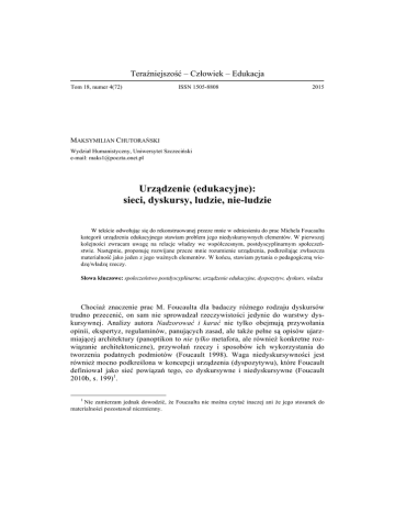 Teraźniejszość – Człowiek – Edukacja Tom 18, numer 4(72) ISSN 1505-8808 2015 MAKSYMILIAN CHUTORAŃSKI Wydział Humanistyczny, Uniwersytet Szczeciński e-mail: [email protected] Urządzenie (edukacyjne): sieci, dyskursy, ludzie, nie-ludzie W tekście odwołując się do rekonstruowanej przeze mnie w odniesieniu do prac Michela Foucaulta kategorii urządzenia edukacyjnego stawiam problem jego niedyskursywnych elementów. W pierwszej kolejności zwracam uwagę na relacje władzy we współczesnym, postdyscyplinarnym społeczeństwie. Następnie, proponuję rozwijane przeze mnie rozumienie urządzenia, podkreślając zwłaszcza materialność jako jeden z jego ważnych elementów. W końcu, stawiam pytania o pedagogiczną wiedzę/władzę rzeczy. Słowa kluczowe: społeczeństwo postdyscyplinarne, urządzenie edukacyjne, dyspozytyw, dyskurs, władza Chociaż znaczenie prac M. Foucaulta dla badaczy różnego rodzaju dyskursów trudno przecenić, on sam nie sprowadzał rzeczywistości jedynie do warstwy dyskursywnej. Analizy autora Nadzorować i karać nie tylko obejmują przywołania opinii, ekspertyz, regulaminów, panujących zasad, ale także pełne są opisów ujarzmiającej architektury (panoptikon to nie tylko metafora, ale również konkretne rozwiązanie architektoniczne), przywołań rzeczy i sposobów ich wykorzystania do tworzenia podatnych podmiotów (Foucault 1998). Waga niedyskursywności jest również mocno podkreślona w koncepcji urządzenia (dyspozytywu), które Foucault definiował jako sieć powiązań tego, co dyskursywne i niedyskursywne (Foucault 2010b, s. 199)1. 1 Nie zamierzam jednak dowodzić, że Foucaulta nie można czytać inaczej ani że jego stosunek do materialności pozostawał niezmienny. 8 Maksymilian CHUTORAŃSKI W prezentowanym tekście spróbuję ukazać znaczenie badania materialnych elementów urządzenia. Będę starał się rozwinąć tezę, że kategoria urządzenia edukacyjnego daje nowe możliwości analizowania wzajemnych relacji pomiędzy różnymi rodzajami władzy, które występują nie tylko w edukacji. Umożliwia ona analityczne ujęcie „współpracy” zarówno dyscyplinarnych mechanizmów władzy jak i jej różnych „miękkich” odmian, które odwołują się do podmiotowego egoizmu czy potrzeby samorealizacji. Pozwala przy tym, co szczególne istotne dla prezentowanych rozważań, na analityczne ujęcie tych mechanizmów rządzenia, które wymykają się analizom dyskursywnym, a wpisane są w otaczające nas przedmioty, architekturę, materialność. Innymi słowy pozwala przemówić tym wszystkim nie-ludzkim aktorom, którzy uczestniczą w sprawowaniu władzy i którzy są urządzani. Czym zatem jest urządzenie edukacyjne? Jako że do tej kategorii odwoływałem się w innych miejscach (Chutorański 2013a–c; 2015), w prezentowanym tekście ograniczę się do jego ogólnej charakterystyki. Oto jego wstępna definicja: urządzenie edukacyjne jest siecią, powiązaniami powstałymi między tym, co dyskursywne i niedyskursywne (rzeczami, dyskursami, tezami filozoficznymi, strukturami architektonicznymi, etc.). Jest nazwą tych elementów procesów liberalnego urządzania (Foucault 2010a), dla których „konieczność wspierania ludzkiego rozwoju” jest imperatywem strategicznym (Foucault 2010b, s. 199), wyznacza pole problemowe i wiąże różne strategie władzy i rodzaje wiedzy. Ten dyspozytyw jest więc sumą wszystkich problematyzacji budowanych na założeniu o konieczności wspomagania ludzi w realizacji ich różnie definiowanego potencjału, samorealizacji, osiągania pełni, np. poznawczej, moralnej, emocjonalnej, duchowej. Innymi słowy urządzenie edukacyjne wpływa na to, kto decyduje o tym, czym jest wspieranie rozwoju, a także na to, na podstawie jakich kryteriów należy decydować i za pomocą jakich środków, w jakich warunkach należy rozwój wspierać. Efektem jego działania są podmioty (z)motywowane do ciągłej zmiany, która przedstawiana jest im jako troska o „interes własny”, o własną potencjalność (Chutorański 2015). Urządzenie edukacyjne jest zatem siecią wielu różnych sieci, procesów, logik, aktorów przekraczającą działanie określonych instytucji. Jego mechanizmy możemy identyfikować zarówno w przedszkolach, szkołach, uniwersytetach, jak i w instytucjach administracji państwowej czy w przedsiębiorstwach (np. odwoływanie się w procesach zarządzania do potrzeby myślenia o firmie jako o środowisku rozwoju pracowników). Natomiast działanie poszczególnych instytucji, np. szkoły, nie ogranicza się do „bycia” elementem jednego urządzenia, przeciwnie – są one punktami, węzłami wielu różnych dyspozytywów (seksualności, opieki społecznej etc.). Mój wywód zakłada następujący porządek: w pierwszej kolejności zwrócę uwagę na relacje władzy we współczesnym, postdyscyplinarnym społeczeństwie, którego specyfika wymusza istnienie urządzeń władzy. Następnie zaproponuję rozwijane przeze Urządzenie (edukacyjne): sieci, dyskursy, ludzie, nie-ludzie 9 mnie rozumienie urządzenia, podkreślając zwłaszcza materialność jako jeden z jego ważnych elementów. W końcu, przejdę do pytań o pedagogiczną wiedzę/władzę rzeczy. Rządzenie w społeczeństwie postdyscyplinarnym Główną zasadą po foucaultowsku rozumianej władzy nie jest mówienie „nie”, zakazywanie czy cenzurowanie, ale spiralne łączenie przymusu, przyjemności i prawdy. Gdyby bowiem władza miała za zadanie jedynie represjonować, gdyby działała wyłącznie jak cenzura, wykluczenie, blokada, odrzucenie, a więc na modłę wielkiego superego, gdyby zatem działała tylko w sposób negatywny, byłaby bardzo krucha. Jeśli jest silna, to dlatego, że wywołuje pozytywne skutki na poziomie pragnienia (...) a także na poziomie wiedzy – pisze M. Foucault (2013, s. 349). Chociaż współczesne relacje władzy nie dają się ująć wyłącznie w kategoriach władzy dyscy