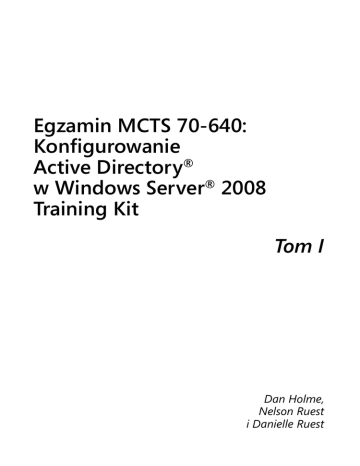 Egzamin MCTS 70-640: Konfigurowanie Active Directory® w Windows Server® 2008 Training Kit Tom I Dan Holme, Nelson Ruest i Danielle Ruest Egzamin MCTS 70-640: Konfigurowanie Active Directory® w Windows Server® 2008 Training Kit, tom 1 Edycja polska Microsoft Press Original English language edition © 2008 Microsoft Corporation Tytuł oryginału: MCTS Self-Paced Training Kit (Exam 70-640): Configuring Windows Server® 2008 Active Directory® Polish edition by APN PROMISE Sp. z o. o. Warszawa 2009 APN PROMISE Sp. z o. o., biuro: ul. Kryniczna 2, 03-934 Warszawa tel. +48 22 35 51 642, fax +48 22 35 51 699 e-mail: [email protected] Wszystkie prawa zastrzeżone. Żadna część niniejszej książki nie może być powielana ani rozpowszechniana w jakiejkolwiek formie i w jakikolwiek sposób (elektroniczny, mechaniczny), włącznie z fotokopiowaniem, nagrywaniem na taśmy lub przy użyciu innych systemów bez pisemnej zgody wydawcy. Microsoft, Microsoft Press, Active Directory, ActiveX, Internet Explorer, MSDN, Outlook, SQL Server, Visual Basic, Visual Studio, Windows, Windows Media, Windows Server oraz Windows Vista są zarejestrowanymi znakami towarowymi Microsoft Corporation. Wszystkie inne nazwy handlowe i towarowe występujące w niniejszej publikacji mogą być znakami towarowymi zastrzeżonymi lub nazwami zastrzeżonymi odpowiednich firm odnośnych właścicieli. Przykłady firm, produktów, osób i wydarzeń opisane w niniejszej książce są fikcyjne i nie odnoszą się do żadnych konkretnych firm, produktów, osób i wydarzeń. Ewentualne podobieństwo do jakiejkolwiek rzeczywistej firmy, organizacji, produktu, nazwy domeny, adresu poczty elektronicznej, logo, osoby, miejsca lub zdarzenia jest przypadkowe i niezamierzone. APN PROMISE Sp. z o. o. dołożyła wszelkich starań, aby zapewnić najwyższą jakość tej publikacji. Jednakże nikomu nie udziela się rękojmi ani gwarancji. APN PROMISE Sp. z o. o. nie jest w żadnym wypadku odpowiedzialna za jakiekolwiek szkody będące następstwem korzystania z informacji zawartych w niniejszej publikacji, nawet jeśli APN PROMISE została powiadomiona o możliwości wystąpienia szkód. ISBN (t. I/II): 978-83-7541-044-0 Przekład: Jakub Niedźwiedź, Kamil Warowny, Tomasz Sochacki Redakcja: Marek Włodarz Korekta: Magdalena Kalina Swoboda Skład i łamanie: MAWart Marek Włodarz Podziękowania z głębi serca Nelson, Danielle, Tony i ja chcielibyśmy oddać hołd niewiarygodnym ludziom z Microsoft Press za danie nam możliwości udziału w wysiłkach na rzecz szkoleń certyfikacyjnych dotyczących systemu Windows Server 2008. Zaczynając od Laury Sackerman i Kena Jonesa: zebraliście nas razem w 2007 roku i utworzyliście strukturę, która była zarówno wygodna, jak i wydajna, wykorzystując to co najlepsze w nas autorach i doprowadzając do powstania świetnej pozycji wydawniczej dla środowiska profesjonalistów IT korzystających z Windows. Dziękujemy za danie nam szansy pisania o technologii, którą kochamy! Maureen Zimmerman, twoje niezmordowane przywiązanie do szczegółów i czuwanie nad całym procesem doprowadziły nas i ten zestaw szkoleniowy do linii mety, która momentami wydawała się nieosiągalna. Wiem, że winien Ci jestem specjalne podziękowania za Twoją wiarę we mnie i Twoje wsparcie oraz ostoję w trakcie pracy. Bob Hogan, rzetelnie oceniałeś naszą pracę i wniosłeś świetne pomysły do tego projektu. Kerin Forsyth, dziękujemy za poprawianie brzemienia naszych słów. Bob Dean, jesteśmy wdzięczni, że dzięki Twoim wysiłkom pytania do testów dla tego zestawu ćwiczeniowego są pierwsza klasa. Chris Norton, bez Ciebie nie byłoby żadnej strony do przeczytania, nie mówiąc o setkach stron cennych ćwiczeń i informacji. Podziękowania dla Was wszystkich od nas wszystkich! Na koniec chciałbym wyrazić swoją własną najgłębszą wdzięczność swojemu Einsteinowi, a my wszyscy dziękujemy swoim rodzinom, przyjaciołom i muzom za umożliwienie powstania tej książki. Egzamin 70-640: TS: Konfigurowanie Active Directory® w Windows Server® 2008 Cel Rozdział Lekcja 9 9 9 1 2 2 1, 10, 12 11 10 Rozdział 1, Lekcje 1, 2 Rozdział 10, Lekcje 1, 2 Rozdział 12, Lekcje 1, 2 2 1, 2 Rozdział 8, Lekcja 3 Rozdział 10, Lekcja 3 Rozdział 11, Lekcja 3 2 2 14 1, 2 16 1, 2 8 17 3 1, 2 3, 4, 5 Rozdział 3, Lekcje 1, 2 Rozdział 4, Lekcje 1, 2 Rozdział 5, Lekcje 1, 2 Rozdział 2, Lekcje 2, 3 Rozdział 3, Lekcje 1, 2, 3 Rozdział 4, Lekcje 1, 2, 3 Rozdział 5, Lekcje 1, 2, 3 1, 2, 3 Rozdział 6, Lekcje 1, 2, 3 Rozdział 7, Lekcje 1, 2, 3 3 1 Rozdział 7, Lekcja 4 Rozdział 8, Lekcja 2 Konfigurowanie systemu DNS – Domain Name System dla Active Directory (16%) Konfigurowanie stref. Konfigurowanie ustawień serwera DNS. Konfigurowanie transferów stref i replikacji. Konfigurowanie infrastruktury Active Directory (25%) Konfigurowanie lasu lub domeny. Konfigurowanie relacji zaufania. Konfigurowanie lokacji. Konfigurowanie replikacji Active Directory. 12 11 8, 10, 11 Konfigurowanie wykazu globalnego. Konfigurowanie wzorców operacji. Konfigurowanie dodatkowych ról serwerowych Active Directory (9%) Konfigurowanie usług AD LDS – Active Directory Lightweight Directory Services (Usługi LDS w usłudze Active Directory). Konfigurowanie usług AD RMS – Active Directory Rights Management Service (Usługi zarządzania prawami dostępu w usłudze Active Directory). Konfigurowanie kontrolera domeny tylko do odczytu (RODC). Konfigurowanie usług AD FS – Active Directory Federation Services. Tworzenie i utrzymywanie obiektów Active Directory (24%) Automatyzacja tworzenia kont Active Directory. Utrzymywanie kont Active Directory. 2, 3, 4, 5 Tworzenie i stosowanie obiektów zasad grupy (GPO). Konfigurowanie szablonów GPO. 6 6, 7 Konfigurowanie obiektów GPO do wdrażania oprogramowania. Konfigurowanie zasad konta. Konfigurowanie zasad inspekcji przy użyciu obiektów GPO. 7 8 7, 8 Utrzymywanie środowiska Active Direct