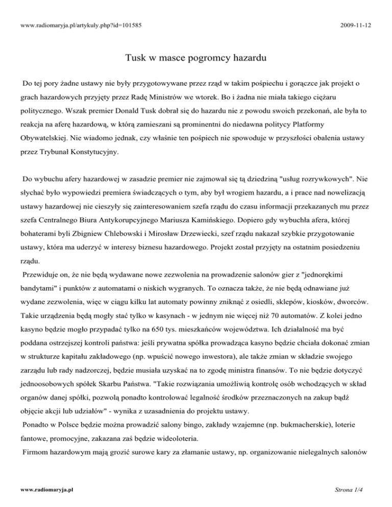 www.radiomaryja.pl/artykuly.php?id=101585 2009-11-12 Tusk w masce pogromcy hazardu Do tej pory żadne ustawy nie były przygotowywane przez rząd w takim pośpiechu i gorączce jak projekt o grach hazardowych przyjęty przez Radę Ministrów we wtorek. Bo i żadna nie miała takiego ciężaru politycznego. Wszak premier Donald Tusk dobrał się do hazardu nie z powodu swoich przekonań, ale była to reakcja na aferę hazardową, w którą zamieszani są prominentni do niedawna politycy Platformy Obywatelskiej. Nie wiadomo jednak, czy właśnie ten pośpiech nie spowoduje w przyszłości obalenia ustawy przez Trybunał Konstytucyjny. Do wybuchu afery hazardowej w zasadzie premier nie zajmował się tą dziedziną "usług rozrywkowych". Nie słychać było wypowiedzi premiera świadczących o tym, aby był wrogiem hazardu, a i prace nad nowelizacją ustawy hazardowej nie cieszyły się zainteresowaniem szefa rządu do czasu informacji przekazanych mu przez szefa Centralnego Biura Antykorupcyjnego Mariusza Kamińskiego. Dopiero gdy wybuchła afera, której bohaterami byli Zbigniew Chlebowski i Mirosław Drzewiecki, szef rządu nakazał szybkie przygotowanie ustawy, która ma uderzyć w interesy biznesu hazardowego. Projekt został przyjęty na ostatnim posiedzeniu rządu. Przewiduje on, że nie będą wydawane nowe zezwolenia na prowadzenie salonów gier z "jednorękimi bandytami" i punktów z automatami o niskich wygranych. To oznacza także, że nie będą odnawiane już wydane zezwolenia, więc w ciągu kilku lat automaty powinny zniknąć z osiedli, sklepów, kiosków, dworców. Takie urządzenia będą mogły stać tylko w kasynach - w jednym nie więcej niż 70 automatów. Z kolei jedno kasyno będzie mogło przypadać tylko na 650 tys. mieszkańców województwa. Ich działalność ma być poddana ostrzejszej kontroli państwa: jeśli prywatna spółka prowadząca kasyno będzie chciała dokonać zmian w strukturze kapitału zakładowego (np. wpuścić nowego inwestora), ale także zmian w składzie swojego zarządu lub rady nadzorczej, będzie musiała uzyskać na to zgodę ministra finansów. To nie będzie dotyczyć jednoosobowych spółek Skarbu Państwa. "Takie rozwiązania umożliwią kontrolę osób wchodzących w skład organów danej spółki, pozwolą ponadto kontrolować legalność środków przeznaczonych na zakup bądź objęcie akcji lub udziałów" - wynika z uzasadnienia do projektu ustawy. Ponadto w Polsce będzie można prowadzić salony bingo, zakłady wzajemne (np. bukmacherskie), loterie fantowe, promocyjne, zakazana zaś będzie wideoloteria. Firmom hazardowym mają grozić surowe kary za złamanie ustawy, np. organizowanie nielegalnych salonów www.radiomaryja.pl Strona 1/4 gier, umożliwienie udziału w grze osobom nieletnim. Będą też prowadzone ograniczenia w reklamowaniu hazardu w miejscach publicznych i mediach. To, co ma uderzyć w biznes hazardowy, to także podniesienie podatków. W przypadku loterii fantowej i bingo fantowego będzie to 10 procent. Loterie pieniężne zostaną obłożone 15-procentowym podatkiem, gry liczbowe i zakłady wzajemne na współzawodnictwo zwierząt - 20-procentowym, bingo pieniężne, telebingo 25-procentowym, a najwyższa - 50-procentowa stawka - ma obejmować np. ruletkę, gry w kości i karty, gry na automatach i pozostałe zakłady wzajemne. Pieniądze z tych podatków mają być przeznaczane na sport, kulturę i walkę ze skutkami uzależnienia od hazardu. Legislacyjny ekspres Ledwie rząd przyjął projekt ustawy hazardowej, a premier już namawiał w Sejmie kluby poselskie do jak najszybszego przyjęcia nowego prawa, tak aby zostało ono podpisane przez prezydenta i ogłoszone w Dzienniku Ustaw najpóźniej 30 listopada. Inaczej przepisy podatkowe zawarte w projekcie nie mogłyby wejść w życie. Projekt już dzisiaj będzie na biurku marszałka Sejmu. Donald Tusk jest przekonany, że "nikt nie będzie przeszkadzał w szybkim uchwaleniu ustawy hazardowej". - Gwarancją tego, że ustawa zostanie przeprowadzona i hazard w Polsce zostanie ograniczony do absolutnego minimum, jest dobra współpraca partii koalicyjnych. Ale w tej szczególnej sytuacji ważne byłoby także pełne wsparcie partii opozycyjnych - mówił Tusk w Sejmie po spotkaniu z posłami. Marszałek Bronisław Komorowski zapowiedział, że najbliższe posiedzenie Sejmu, na którym będzie można rozpocząć prace nad rządowa ustawą, rozpocznie się we wtorek, 17 listopada. Z kolei jutro przedstawiciele klubów poselskich mają się spotkać z ministrem Michałem Bonim i ekspertami rządowymi, którzy będą im wyjaśniać niektóre aspekty ustawy. Ma to przekonać PiS i SLD do poparcia ustawy. Bardziej sceptyczni są posłowie z lewicy. Przewodniczący SLD Grzegorz Napieralski powiedział po spotkaniu z szefem rządu i marszałkiem, że obawia się o prawną jakość ustawy hazardowej. - Apelowałem do premiera i marszałka, żeby stali na straży stanowienia dobrego prawa, żeby później ktoś nie zarzucił, iż pod wpływem afery hazardowej premier ucieka od odpowiedzialności - stwierdził Napieralski. Zwrócił również uwagę na ogromny pośpiech, jaki towarzyszy tej ustawie. - Taki pośpiech jest spowodowany tym, że Donald Tusk czuje brzemię afery hazardowej i zaangażowania jego najbliższych kolegów w tę aferę. Pan premier chce dzisiaj odwrócić uwagę, chce iść na komisję śledczą jako pogromca hazardu, a nie ten, który się z tym hazardem, że tak powiem, wozi i z tym hazardem współpracuje - surowo oceniał intencje szefa rządu Grzegorz Napieralski. Z kolei poseł Henryk Kowalczyk (PiS) mówił, że jego klub rozważa zgłoszenie do projektu ustawy hazardowej poprawek. - Mamy wiele pytań do ustawy - stwierdził Kowalczyk, który liczy na to, że zostaną www.radiomaryja.pl Strona 2/4 one wyjaśnione podczas jutrzejszego spotkania z ekspertami. Główna wątpliwość to to, czy tryb prac nad projektem ustawy jest zgodny z 