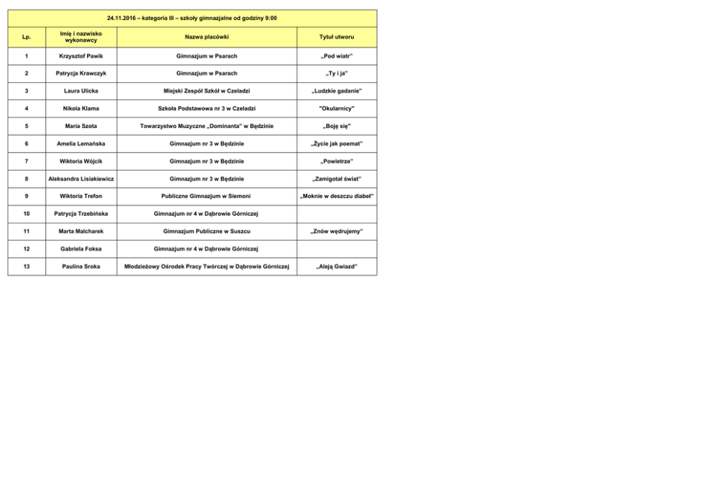 24.11.2016 – kategoria III – szkoły gimnazjalne od godziny 9:00 Lp. Imię i nazwisko wykonawcy Nazwa placówki Tytuł utworu 1 Krzysztof Pawik Gimnazjum w Psarach „Pod wiatr” 2 Patrycja Krawczyk Gimnazjum w Psarach „Ty i ja” 3 Laura Ulicka Miejski Zespół Szkół w Czeladzi „Ludzkie gadanie” 4 Nikola Klama Szkoła Podstawowa nr 3 w Czeladzi "Okularnicy" 5 Maria Szota Towarzystwo Muzyczne „Dominanta” w Będzinie „Boję się" 6 Amelia Lemańska Gimnazjum nr 3 w Będzinie „Życie jak poemat” 7 Wiktoria Wójcik Gimnazjum nr 3 w Będzinie „Powietrze” 8 Aleksandra Lisiakiewicz Gimnazjum nr 3 w Będzinie „Zamigotał świat” 9 Wiktoria Trefon Publiczne Gimnazjum w Siemoni „Moknie w deszczu diabeł” 10 Patrycja Trzebińska Gimnazjum nr 4 w Dąbrowie Górniczej 11 Marta Malcharek Gimnazjum Publiczne w Suszcu 12 Gabriela Foksa Gimnazjum nr 4 w Dąbrowie Górniczej 13 Paulina Sroka Młodzieżowy Ośrodek Pracy Twórczej w Dąbrowie Górniczej „Znów wędrujemy” „Aleją Gwiazd” 14 Miłosz Mogielski Gimnazjum nr 1 w Czeladzi „Kiedyś” 15 Karolina Moska Gimnazjum nr 6 w Dąbrowie Górniczej „Napraw” 16 Natalia Rakoczy Gimnazjum nr 9 Katowicach „Tato nie pij” 17 Anna Nowak Młodzieżowy Ośrodek Pracy Twórczej w Dąbrowie Górniczej „Z ciszą pośród czterech ścian” 18 Jagoda Kuszka Młodzieżowy Ośrodek Pracy Twórczej w Dąbrowie Górniczej „Nieprawda” 19 Weronika Jaskuła Gimnazjum nr 9 Katowicach 20 Katarzyna Posikata Ognisko Pracy Pozaszkolnej nr 1 w Sosnowcu „Autostop” 21 Tymoteusz Masarczyk Ośrodek Kultury w Będzinie „Nieznajomy” 22 Patrycja Krzykawska Gimnazjum w Mierzęcicach „Profesorowie” 23 Damian Nowak Gimnazjum w Mierzęcicach „Życia mała garśc” 24 Wiktoria Ćwik PMDK w Będzinie „Orła cień” 25 Zuzanna Ferdyn Zespół Szkół w Rogoźniku „Tańczące Eurydyki” 26 Laura Florczyk Zespół Szkół w Rogoźniku „Kiedy powiem sobie dośc” 27 Aleksandra Kasjaniuk Zespół Szkół w Rogoźniku „Chłopiec z gitarą” 28 Martyna Frej Zespół Szkół w Rogoźniku „Życie jak poemat” 29 Klaudia Lorczyk Zespół Szkół w Rogoźniku „Zanim pójdę” 30 Tomasz Wyłupek Gimnazjum nr 9 w Dąbrowie Górniczej „Syberiada Polska” 31 Maja Pietruszczak Prywatne Gimnazjum w Dąbrowie Górniczej „Mruczy winyl” 32 Julia Jurczak Siemianowickie Centrum Kultury w Siemianowicach Śląskich „Tango na głos orkiestra i jeszcze jeden głos” 33 Martyna Szczęsna Gimnazjum nr 9 w Dąbrowie Górniczej „Kolęda Warszawska” 34 Wiktoria Wydra Szkoła Podstawowa nr 34 w Dąbrowie Górniczej 35 Wiktor Piękoś Gimnazjum nr 2 w Będzinie „Jej Portret" 36 Zuzanna Kędzierska Gimnazjum nr 2 w Będzinie „Znam cię na pamięć" 37 Karolina Łyczko Gimnazjum nr 2 w Będzinie „Wszystkiego na raz” 38 Martyna Musiał Gimnazjum nr 2 w Będzinie „Piosenka na zły czas” 39 Zuzanna Krzepkowska PMDK w Będzinie