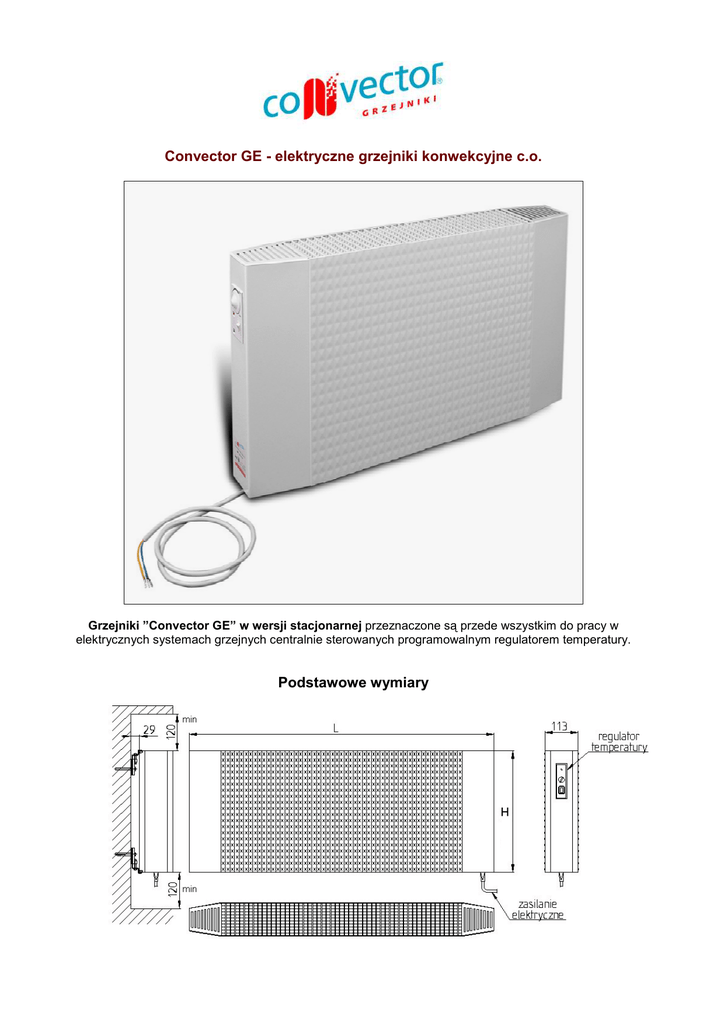 Convector GE - elektryczne grzejniki konwekcyjne c.o. Grzejniki ”Convector GE” w wersji stacjonarnej przeznaczone są przede wszystkim do pracy w elektrycznych systemach grzejnych centralnie sterowanych programowalnym regulatorem temperatury. Podstawowe wymiary Dane techniczne Typ grzejnika stacjonarne przenośne GE-05/2/7 GE-10/2/10 GE-14/2/13 GE-18/2/16 GE-10/4/7 GE-20/4/10 GE-28/4/13 GE-10 GE-20 Napięcie zasilania Zakres regulacji temperatury Klasa bezpieczeństwa Stopień ochrony obudowy Efektywność energetyczna Znak bezpieczeństwa Wymiary wysokość długość H L cm 70 100 20 130 160 70 40 100 130 70 47 100 Masa wymiennika Moc elektryczna NatęŜenie prądu I max kg 3,1 4,0 5,0 5,9 5,2 7,0 8,9 5,4 7,3 W 500 1000 1400 1800 1000 2000 2800 1000 2000 A 2,3 4,6 6,4 8,2 4,6 9,1 12,8 4,6 9,1 ~ 230 V AC 8÷26°C Klasa I IP 45 czas nagrzewu pow. roboczej < 9 min. Deklaracja zgodności z Dyrektywą Niskonapięciową LVD 72/23/EWG Przeznaczenie grzejników elektrycznych typu „Convector GE” Przeznaczone są do ogrzewania pomieszczeń w budynkach mieszkalnych, budynkach uŜyteczności publicznej, w pomieszczeniach usługowych, biurowych, obiektach słuŜby zdrowia i innych. Przez zastosowanie specjalnych rozwiązań konstrukcyjnych grzejniki posiadają wysoki stopień ochrony obudowy IP45. MoŜna je bez obawy montować w łazienkach i pomieszczeniach basenów – są bowiem odporne na wnikanie wody (bryzgoszczelne). Ekonomia w eksploatacji Minimalna bezwładność cieplna grzejników „Convector GE” zapewnia szybką reakcję układu grzejnego na sygnały automatyki, co pozwala na uzyskanie znacznych oszczędności energii. Silnie rozwinięta powierzchnia wymiany ciepła, przy odpowiednio dobranej mocy grzejnika, daje niskie obciąŜenie powierzchniowe, co z jednej strony gwarantuje długowieczność i stosunkowo niską temperaturę dotykową zewnętrznych powierzchni urządzenia, z drugiej zaś odpowiednią temperaturę powietrza wylotowego. 3 Przez średni grzejnik z typoszeregu GE - w wyniku konwekcji naturalnej – przepływa ponad 100 m powietrza na godzinę. Gwarantuje to szybkie nagrzewanie pomieszczenia bez zbędnej utraty energii. Wygoda i bezpieczeństwo Grzejnik wyposaŜony jest w ogranicznik temperatury zabezpieczający przed przegrzaniem w razie nieprawidłowego uŜytkowania oraz w precyzyjny, nastawialny regulator temperatury mierzący temperaturę powietrza w pomieszczeniu z dokładnością do 0,5°C. Skutkiem tego pobór energii elektrycznej odpowiada faktycznemu chwilowemu zapotrzebowaniu na ciepło z uwzględnieniem wszystkich zysków ciepła występujących w pomieszczeniu. Ogrzewanie elektryczne „Convector” to najbardziej czysty typ ogrzewania - nie zanieczyszcza środowiska ani na zewnątrz, ani w pomieszczeniach. Reguluje się właściwie „samo” – dostosowując do zadanej temperatury. Właściwy mikroklimat pomieszczenia Zastosowanie grzejników GE w pomieszczeniu znacząco przyczynia się do utrzymania w nim korzystnego mikroklimatu. Rozwinięta powierzchnia wymiany ciepła sprawia, Ŝe temperatura elementów grzejnych wewnątrz grzejnika nie przekracza 120°C. Dzięki temu wyeliminowane zostało przypalanie się kurzu i grzejnik nie wydziela charakterystycznego draŜniącego zapachu. Niska temperatura dotykowa grzejników umoŜliwia zastosowanie ich w pokojach dziecinnych i przedszkolach. Inne zalety grzejników GE Wykonane są wyłącznie z aluminium (za wyjątkiem grzałek wykonanych z drutu kanthalowego w osłonie ze stali Ŝarowytrzymałej, które umieszczone są wewnątrz grzejnika). Aluminium jest metalem o duŜym przewodnictwie cieplnym a jednocześnie niskim cięŜarze właściwym – dzięki temu grzejnik ma małą masę, moŜna więc mocować go praktycznie do kaŜdej ściany (nawet kartonowo-gipsowej). Grzejniki w wersji stacjonarnej wyposaŜone są w komplet zawieszek do zamocowania urządzenia na ścianie. Przewód zasilający 3-Ŝyłowy (z Ŝyłą ochronną) jest przystosowany do podłączenia bezpośrednio do puszki rozdzielczej. Korpus pomalowany jest poliestrowo-epoksydowym lakierem proszkowym, utwardzanym w temperaturze 200°C, co zapewnia trwałą, estetyczną i odporną na korozję powłokę zewnętrzną. Dostępne są w ponad 200 kolorach (wg palety RAL). Producent grzejników: EXTREME Sp.z o.o. Ul. Kantorowicka 400 31-763 KRAKÓW Tel/fax: 012-645-10-06, 012-645-10-08 e-mail: [email protected] Zalety ogrzewania elektrycznego 1. NajniŜsze koszty inwestycyjne: bez kotła, bez kosztownej ochrony komina przed działaniem spalin, bez przewodów wodnych i ich drogiej izolacji cieplnej (wystarcza jeden przewód zasilający, montowany w płytkiej bruździe łatwej do wykucia), bez osobnych pomieszczeń na kotłownie i paliwa do kotłów, tanie i proste urządzenia do regulacji instalacji. 2. Bezpieczeństwo uŜytkownika nie ma urządzeń gazowych (nie istnieje ewentualność zagroŜenia wybuchem) nie ma nagromadzenia materiałów łatwopalnych (paliwa do ogrzewania) nie ma spalin (nie istnieje zagroŜenie zaczadzenia) nie ma moŜliwości zalania mieszkania (przy awarii instalacji wodnej istnieje taka moŜliwość) nie ma zagroŜenia zamarznięcia instalacji w przypadku awaryjnego lub celowego wyłączenia instalacji z ruchu. 3. Komfort uŜytkowania i oszczędność prosta i precyzyjna regulacja i moŜliwość programowania temperatury ogólnie jednym regulatorem dla całego obiektu zastąpienie zaworów termoregulacyjnych bardzo prostym nastawiennikiem temperatury przy grzejniku (moŜliwość regulacji temperatury w kaŜdym pomieszczeniu oddzielnie) niemoŜliwość rozregulowania układu grzewczego (instalacja wodna jest wraŜliwa na zmiany oporów hydraulicznych przepływu), nie ma problemu zapowietrzenia instalacji awaria jednego grzejnika nie wyklucza pracy pozostałej części instalacji, co występuje czasem w instalacjach wodnych (konieczność zatrzymania pracy części instalacji wodnej w celu spuszczenia wody i demontaŜu gr