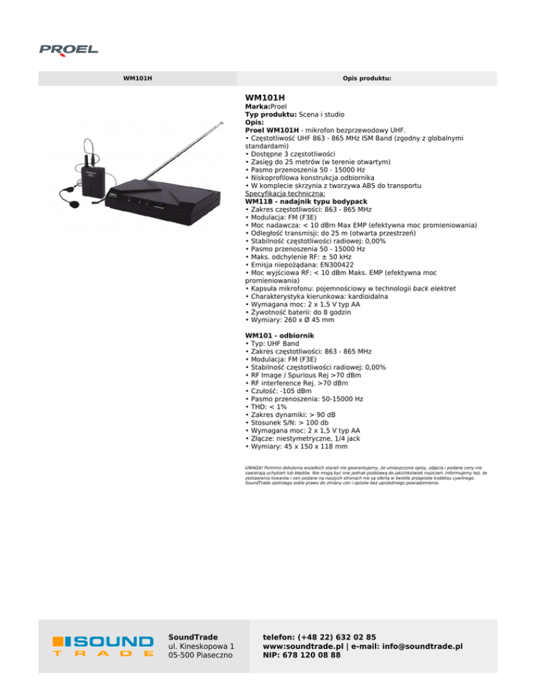 WM101H Opis produktu: WM101H Marka:Proel Typ produktu: Scena i studio Opis: Proel WM101H - mikrofon bezprzewodowy UHF. • Częstotliwość UHF 863 - 865 MHz ISM Band (zgodny z globalnymi standardami) • Dostępne 3 częstotliwości • Zasięg do 25 metrów (w terenie otwartym) • Pasmo przenoszenia 50 - 15000 Hz • Niskoprofilowa konstrukcja odbiornika • W komplecie skrzynia z tworzywa ABS do transportu Specyfikacja techniczna: WM11B - nadajnik typu bodypack • Zakres częstotliwości: 863 - 865 MHz • Modulacja: FM (F3E) • Moc nadawcza: < 10 dBm Max EMP (efektywna moc promieniowania) • Odległość transmisji: do 25 m (otwarta przestrzeń) • Stabilność częstotliwości radiowej: 0,00% • Pasmo przenoszenia 50 - 15000 Hz • Maks. odchylenie RF: ± 50 kHz • Emisja niepożądana: EN300422 • Moc wyjściowa RF: < 10 dBm Maks. EMP (efektywna moc promieniowania) • Kapsuła mikrofonu: pojemnościowy w technologii back elektret • Charakterystyka kierunkowa: kardioidalna • Wymagana moc: 2 x 1,5 V typ AA • Żywotność baterii: do 8 godzin • Wymiary: 260 x Ø 45 mm WM101 - odbiornik • Typ: UHF Band • Zakres częstotliwości: 863 - 865 MHz • Modulacja: FM (F3E) • Stabilność częstotliwości radiowej: 0,00% • RF Image / Spurious Rej >70 dBm • RF interference Rej. >70 dBm • Czułość: -105 dBm • Pasmo przenoszenia: 50-15000 Hz • THD: < 1% • Zakres dynamiki: > 90 dB • Stosunek S/N: > 100 db • Wymagana moc: 2 x 1,5 V typ AA • Złącze: niestymetryczne, 1/4 jack • Wymiary: 45 x 150 x 118 mm UWAGA! Pomimo dołożenia wszelkich starań nie gwarantujemy, że umieszczone opisy, zdjęcia i podane ceny nie zawierają uchybień lub błędów. Nie mogą być one jednak podstawą do jakichkolwiek roszczeń. Informujemy też, że zestawienia towarów i cen podane na naszych stronach nie są ofertą w świetle przepisów kodeksu cywilnego. SoundTrade zastrzega sobie prawo do zmiany cen i opisów bez uprzedniego powiadomienia. SoundTrade ul. Kineskopowa 1 05-500 Piaseczno telefon: (+48 22) 632 02 85 www:soundtrade.pl | e-mail: [email protected] NIP: 678 120 08 88