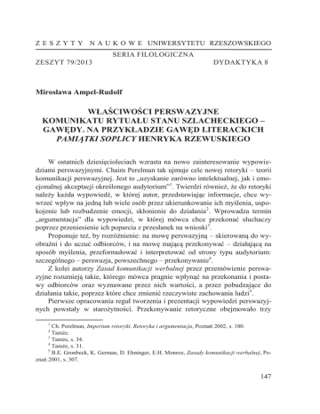 Z E S Z Y T Y N A U K O W E UNIWERSYTETU RZESZOWSKIEGO SERIA FILOLOGICZNA ZESZYT 79/2013 DYDAKTYKA 8 Mirosława Ampel-Rudolf WŁAŚCIWOŚCI PERSWAZYJNE KOMUNIKATU RYTUAŁU STANU SZLACHECKIEGO – GAWĘDY. NA PRZYKŁADZIE GAWĘD LITERACKICH PAMIĄTKI SOPLICY HENRYKA RZEWUSKIEGO W ostatnich dziesięcioleciach wzrasta na nowo zainteresowanie wypowiedziami perswazyjnymi. Chaim Perelman tak ujmuje cele nowej retoryki – teorii komunikacji perswazyjnej. Jest to „uzyskanie zarówno intelektualnej, jak i emocjonalnej akceptacji określonego audytorium”1. Twierdzi również, że do retoryki należy każda wypowiedź, w której autor, przedstawiając informacje, chce wywrzeć wpływ na jedną lub wiele osób przez ukierunkowanie ich myślenia, uspokojenie lub rozbudzenie emocji, skłonienie do działania2 . Wprowadza termin „argumentacja” dla wypowiedzi, w której mówca chce przekonać słuchaczy poprzez przeniesienie ich poparcia z przesłanek na wnioski3. Proponuje też, by rozróżnienie: na mowę perswazyjną – skierowaną do wyobraźni i do uczuć odbiorców, i na mowę mającą przekonywać – działającą na sposób myślenia, przeformułować i interpretować od strony typu audytorium: szczególnego – perswazja, powszechnego – przekonywanie4. Z kolei autorzy Zasad komunikacji werbalnej przez przemówienie perswazyjne rozumieją takie, którego mówca pragnie wpłynąć na przekonania i postawy odbiorców oraz wyznawane przez nich wartości, a przez pobudzające do działania takie, poprzez które chce zmienić rzeczywiste zachowania ludzi5. Pierwsze opracowania reguł tworzenia i prezentacji wypowiedzi perswazyjnych powstały w starożytności. Przekonywanie retoryczne obejmowało trzy 1 Ch. Perelman, Imperium retoryki. Retoryka i argumentacja, Poznań 2002, s. 180. Tamże. 3 Tamże, s. 34. 4 Tamże, s. 31. 5 B.E. Gronbeck, K. German, D. Ehninger, E.H. Monroe, Zasady komunikacji werbalnej, Poznań 2001, s. 307. 2 147 zintegrowane cele oddziaływania na słuchacza, na jego intelekt – funkcja informująco-pouczająca, na wolę – zniewalająca (kształtowanie postaw), oraz uczucia – estetyczna. Funkcja zniewalająca była traktowana jako najważniejsza6. Wypowiedzi perswazyjne dzielono na trzy rodzaje i wiązano z jednym z trzech stylów: doradczy ze stylem wysokim, osądzający z niskim i popisowy (oceniający) ze średnim7. Mowy popisowe obejmowały wypowiedzi zawierające pochwałę lub naganę osób, rzeczy, spraw, wartości. Przez Arystotelesa były traktowane jako służące chwale oratora8. Według Chaima Perelmana ich głównym celem było wzmocnienie akceptacji dla wartości respektowanych w danej społeczności i stwarzanie gotowości wśród słuchaczy do podjęcia przyszłego działania9. Przedmiotem rozważań w tym artykule są gawędy szlacheckie ze zbioru Pamiątki Soplicy Henryka Rzewuskiego, których sposób realizacji funkcji perswazywnej jest zbieżny z wypowiedziami popisowymi. Chcę zaproponować i uzasadnić tezę, że w przypadku tego typu wypowiedzi realizowany jest model komunikacji ekspresywnej (lub rytuału), którego podstawą jest uzyskanie przez mówcę „rezonansu emocjonalnego” z audytorium. Model komunikacji ekspresywnej wprowadził James Carey10. Podstawową funkcją takiej prezentacji nie jest przekaz informacji w przestrzeni, lecz podtrzymanie trwania społeczności w czasie. Nadawca i odbiorcy czerpią satysfakcję ze wspólnie podzielanych przekonań i emocji. Głównym celem tego typu komunikacji jest budowanie i podtrzymywanie spójności grupy11. Uważam, że podstawą tego typu komunikatu i miarą osiągniętego sukcesu przez mówcę jest umiejętne rozpoznanie nastawienia emocjonalnego audytorium i odpowiednie „dostrojenie” go. Wielokrotnie w przeszłości zwracano uwagę na to, że aby być wielkim mówcą, trzeba umieć „porwać tłum”, dysponować specyficznym talentem. Prowadzone ostatnio badania nad inteligencją emocjonalną pozwalają wyjaśnić pewne aspekty tego problemu. Potwierdzono w nich istnienie zjawiska przekazywania emocji, przede wszystkim przez lidera grupy, wśród osób przebywających razem w określonej przestrzeni. Efekt ten nazwano współbrzmieniem, rezonansem emocjonalnym. Najsilniejszym sygnałem uzyskania rezonansu jest uśmiech i śmiech, a wspólny śmiech najszybciej prowadzi do pozytyw6 M. Korolko, Sztuka retoryki. Przewodnik encyklopedyczny, Warszawa 1990, s. 45. Tamże, s. 47–49. 8 Tamże, s. 48. 9 Ch. Perelman, dz. cyt., s. 33. 10 J. Carey, A Cultural Approach to Communication, „Communication” 1975, nr 2, s. 1–22. 11 Za: T. Goban-Klas, Media i komunikowanie masowe. Teorie i analizy prasy, radia, telewizji i Internetu, Warszawa–Kraków 2001, s. 67. 7 148 nego „porwania” emocjonalnego. Daje on poczucie najmniejszego dystansu między ludźmi, sygnalizuje zaufanie, poczucie komfortu i podobne spojrzenie na świat. Emocje jako bardzo silne uczucia mogą być również szkodliwe dla funkcjonowania grupy, zwłaszcza te negatywne, jak gniew i wrogość. O wiele istotniejsze są powstałe po epizodzie emocjonalnym nastroje, które trwają dłużej, sprzyjają współpracy i konsolidują grupę wokół wspólnych wartości12. W związku z tym, że większość informacji związanych z emocjami jest przekazywanych pozawerbalnie, w modelu komunikatu „rezonansu” emocjonalnego należy uwzględnić (o ile to możliwe) gesty i mimikę mówcy, ton głosu, sposób akcentowania oraz zachowania audytorium. Cechy stylu gawęd szlacheckich jako komunikatu „rezonansu” emocjonalnego13 Funkcja perswazyjna realizuje się we wszystkich wymiarach zdarzenia komunikacyjnego i dotyczy zarówno cech kontekstu (nadawca, odbiorca, ich intencje i oczekiwania), jak i kształtu samej wypowiedzi: struktury poznawczej (temat, treść, ich organizacja), funkcjonalnej oraz kompozycji i języka. Zadaniem nadawcy jest skłonienie odbiorców, by wysłuchali go i zaakceptowali zarówno jako nadawcę, j