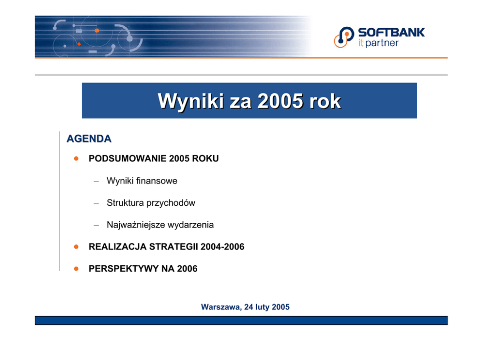 Wyniki za 2005 rok AGENDA PODSUMOWANIE 2005 ROKU – Wyniki finansowe – Struktura przychodów – Najważniejsze wydarzenia REALIZACJA STRATEGII 2004-2006 PERSPEKTYWY NA 2006 Warszawa, 24 luty 2005 Plan prezentacji AGENDA PODSUMOWANIE 2005 ROKU – Wyniki finansowe – Struktura przychodów – Najważniejsze wydarzenia REALIZACJA STRATEGII 2004-2006 PERSPEKTYWY NA 2006 Wyniki finansowe Skonsolidowany rachunek wyników za IV kw. 2005 r. mln PLN IV kw '05 IV kw '04 zmiana Przychody ze sprzedaży 258,2 223,1 16% Zysk/strata brutto ze sprzedaży 26,9 26,0 3% Koszty sprzedaży -6,0 -4,3 Koszty ogólnego zarządu -11,3 -12,8 Zysk/strata netto ze sprzedaży 9,6 8,9 Pozostałe przychody operacyjne 1,7 2,5 Pozostałe koszty operacyjne -1,3 -2,6 Zysk z działalności operacyjnej 10,1 8,8 Przychody finansowe 14,7 61,7 Koszty finansowe -8,2 -74,1 Zysk/strata brutto 16,6 -8,1 Zysk strata/netto dla akcjonariuszy Softbank 12,1 -3,2 Wyniki za 2005 rok Zawiera przychody Grupy Koma SA, Incenti, Gladstone, brak przychodów Epsilio 8% 14% Niedopasowanie zabezpieczeń instrumentów. Zwiększenie efektywności zabezpieczeń instrumentów 3 Wyniki finansowe Skonsolidowany rachunek wyników za 2005 r. mln PLN 2005 2004 zmiana Przychody ze sprzedaży 536,9 482,0 11% Zysk/strata brutto ze sprzedaży 99,3 96,0 3% Koszty sprzedaży -15,7 -13,9 Koszty ogólnego zarządu -42,0 -54,4 Zysk/strata netto ze sprzedaży 41,6 27,8 Pozostałe przychody operacyjne 14,9 8,0 Pozostałe koszty operacyjne -4,3 -14,3 Zysk z działalności operacyjnej 52,3 21,5 Przychody finansowe 59,8 73,7 Koszty finansowe -59,5 -96,1 Zysk/strata brutto 52,5 -5,4 Zysk strata/netto dla akcjonariuszy Softbank 44,7 0,4 Wyniki za 2005 rok 50% zawiera odprawy dla zarządu i kierownictwa ok. 10 mln PLN 143% zawiera 11,3 mln PLN zwrotu podatku 4 Wyniki finansowe Bilans na koniec 2005 r. mln PLN 31.12.05 31.12.04 Aktywa trwałe (długoterminowe) 320,5 246,3 Aktywa obrotowe (krótkoterminowe) 352,0 284,1 SUMA AKTYWÓW 672,5 530,4 Kapitał własny 288,6 140,7 Zobowiązania długoterminowe 93,6 86,7 Zobowiązania krótkoterminowe 290,2 302,9 SUMA PASYWÓW 672,5 530,4 Wyniki za 2005 rok Wzrost wynika z zakupu akcji Koma, Gladstone, Incenti i Asseco. Wzrost należności handlowych +43 mln PLN, śr.pien. +15 mln Podwyższenie kapitału o 110 mln PLN w Softbank SA Wynik za 2005 rok +45 mln PLN 5 Wyniki finansowe Rachunek przepływów pieniężnych za 2005 r. mln PLN Środki pieniężne netto z działalności operacyjnej Amortyzacja 2005 2004 39,9 -26,4 10,1 10,9 Zwrot podatku 11 mln PLN Akwizycje – gotówka spółek Środki pieniężne netto w działalności inwestycyjnej -14,6 -58,9 Środki pieniężne netto z działalności finansowej -10,5 80,5 30,6 0,0 Zmiana netto stanu środków pieniężnych 14,8 -4,8 Środki pieniężne na koniec okresu 62,2 47,3 Wpływy z tytułu emisji akcji Zmiana struktury należności do zobowiązań handlowych. Spłata zadłużenia Softbank – 22,5 mln PLN Koma – 20,3 mln PLN Incenti – 8,3 mln PLN Sawan- 4,4 mln PLN Gladstone – 3,5 mln PLN Wyniki za 2005 rok 6 Wskaźniki finansowe Rentowność Grupy w 2005 r. % IV kw '05 IV kw '04 2005 2004 Marża brutto ze sprzedaży, w tym: 10,4% 11,7% 18,5% 19,9% na sprzedaży produktów i usług 21,4% 11,8% 29,3% 20,6% na sprzedaży towarów i materiałów 5,5% 11,6% 9,2% 19,0% Marża netto ze sprzedaży 3,7% 4,0% 7,7% 5,8% Marża operacyjna 3,9% 4,0% 9,7% 4,5% Marża brutto 6,4% -3,6% 9,8% -1,1% Marża netto 4,7% -1,4% 8,3% 0,1% Optymalizacja wykorzystania zasobów w projektach, Zwiększenie rentowności kontraktu CEPiK Wyniki za 2005 rok Spadek ze względu na kontrakty sprzętowe Koma SA Różnice kursowe obniżyły wynik fin. 7 Plan prezentacji AGENDA PODSUMOWANIE 2005 ROKU – Wyniki finansowe – Struktura przychodów – Najważniejsze wydarzenia REALIZACJA STRATEGII 2004-2006 PERSPEKTYWY NA 2006 Struktura sprzedaży Struktura przychodów 2005 Struktura sprzedaży wg sektorów mln PLN 2005 2004 Bankowość 323 303 Administracja Publiczna 141 146 Pozostałe sektory 73 33 RAZEM 537 482 Pozostałe sektory 14% Administracja publiczna 26% Bankowość 60% Największe kontrakty mln PLN 2003 2004 2005 2006-2010 ZSI w PKO BP 6 37 53 568 CEPiK w MSWiA 15 53 31 113 RAZEM 22 90 84 681 % przychodów 6% 18% 16% b.d. Wyniki za 2005 rok 9 Struktura sprzedaży Struktura przychodów ze sprzedaży produktów mln PLN 2005 2004 Oprogramowanie i wdrożenia 132 156 Serwis 106 85 Sprzęt komputerowy 4 39 Pozostałe 6 4 248 284 RAZEM Struktura przychodów ze sprzedaży towarów i materiałów mln PLN 2005 2004 Sprzęt komputerowy 209 134 Oprogramowanie 80 64 RAZEM 289 198 Wyniki za 2005 rok Struktura przychodów 2005 Pozostałe 1% Serwis 20% Oprogramowanie 39% Sprzęt 40% 10 Plan prezentacji AGENDA PODSUMOWANIE 2005 ROKU – Wyniki finansowe – Struktura przychodów – Najważniejsze wydarzenia REALIZACJA STRATEGII 2004-2006 PERSPEKTYWY NA 2006 2005 rok w sektorze bankowym Najważniejsze kontrakty Realizacja Zintegrowanego Systemu Informatycznego dla banku PKO BP (wdrożenie pilotowego systemu) Wdrożenie Systemu Monitorowania Obrotu Gotówkowego w banku Pekao SA Przychody z sektora bankowego + 6% 300 303 323 2004 2005 227 Realizacja systemu informatycznego "Wspomagający System Centralny" w PKO BP Rozbudowy konfiguracji sprzętowych dla potrzeb eksploatacji Systemu ZORBA-3000 Realizacja kontraktów na wdrożenia systemu zarządzania ryzykiem dla Raiffeisen Polska i Raiffeisen Zentralbank Österreich AG. 2002 2003 Kontynuacja wdrożenia systemu do obsługi ubezpieczeń w PZU SA oraz systemu fin.-księgowego w PZU Życie SA Wdrożenie systemu Egzekutor w ING Bank Śląski (nagroda za Produkt Roku 2005) Kontrakt na realizację Bankowej Platformy Integracyjnej dla BGŻ S.A. Wyniki za 2005 rok 12 2005 rok w administracji publicznej Najważniejsze kontrakty Przychody z sektora administracji publicznej Realizacja kontraktu na wdrożenie systemu informatycznego Centralnej Ewidencji Pojazdów i Kierowców (