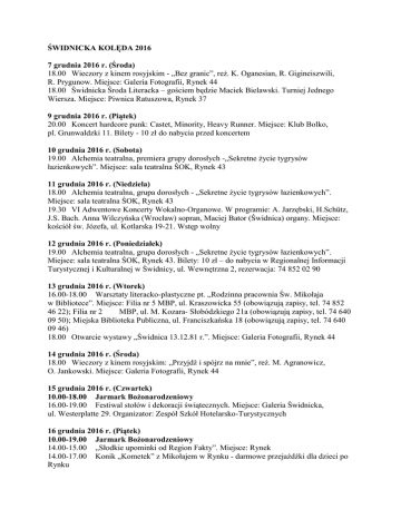 ŚWIDNICKA KOLĘDA 2016 7 grudnia 2016 r. (Środa) 18.00 Wieczory z kinem rosyjskim - „Bez granic”, reż. K. Oganesian, R. Gigineiszwili, R. Prygunow. Miejsce: Galeria Fotografii, Rynek 44 18.00 Świdnicka Środa Literacka – gościem będzie Maciek Bielawski. Turniej Jednego Wiersza. Miejsce: Piwnica Ratuszowa, Rynek 37 9 grudnia 2016 r. (Piątek) 20.00 Koncert hardcore punk: Castet, Minority, Heavy Runner. Miejsce: Klub Bolko, pl. Grunwaldzki 11. Bilety - 10 zł do nabycia przed koncertem 10 grudnia 2016 r. (Sobota) 19.00 Alchemia teatralna, premiera grupy dorosłych -„Sekretne życie tygrysów łazienkowych”. Miejsce: sala teatralna ŚOK, Rynek 43 11 grudnia 2016 r. (Niedziela) 18.00 Alchemia teatralna, grupa dorosłych - „Sekretne życie tygrysów łazienkowych”. Miejsce: sala teatralna ŚOK, Rynek 43 19.30 VI Adwentowe Koncerty Wokalno-Organowe. W programie: A. Jarzębski, H.Schütz, J.S. Bach. Anna Wilczyńska (Wrocław) sopran, Maciej Bator (Świdnica) organy. Miejsce: kościół św. Józefa, ul. Kotlarska 19-21. Wstęp wolny 12 grudnia 2016 r. (Poniedziałek) 19.00 Alchemia teatralna, grupa dorosłych - „Sekretne życie tygrysów łazienkowych”. Miejsce: sala teatralna ŚOK, Rynek 43. Bilety: 10 zł – do nabycia w Regionalnej Informacji Turystycznej i Kulturalnej w Świdnicy, ul. Wewnętrzna 2, rezerwacja: 74 852 02 90 13 grudnia 2016 r. (Wtorek) 16.00-18.00 Warsztaty literacko-plastyczne pt. „Rodzinna pracownia Św. Mikołaja w Bibliotece”. Miejsce: Filia nr 5 MBP, ul. Kraszowicka 55 (obowiązują zapisy, tel. 74 852 46 22); Filia nr 2 MBP, ul. M. Kozara- Słobódzkiego 21a (obowiązują zapisy, tel. 74 640 09 50); Miejska Biblioteka Publiczna, ul. Franciszkańska 18 (obowiązują zapisy, tel. 74 640 09 46) 18.00 Otwarcie wystawy „Świdnica 13.12.81 r.”. Miejsce: Galeria Fotografii, Rynek 44 14 grudnia 2016 r. (Środa) 18.00 Wieczory z kinem rosyjskim: „Przyjdź i spójrz na mnie”, reż. M. Agranowicz, O. Jankowski. Miejsce: Galeria Fotografii, Rynek 44 15 grudnia 2016 r. (Czwartek) 10.00-18.00 Jarmark Bożonarodzeniowy 16.00-19.00 Festiwal stołów i dekoracji świątecznych. Miejsce: Galeria Świdnicka, ul. Westerplatte 29. Organizator: Zespół Szkół Hotelarsko-Turystycznych 16 grudnia 2016 r. (Piątek) 10.00-19.00 Jarmark Bożonarodzeniowy 14.00-15.00 „Słodkie upominki od Region Fakty”. Miejsce: Rynek 14.00-17.00 Konik „Kometek” z Mikołajem w Rynku - darmowe przejażdżki dla dzieci po Rynku 17.00 Wigilia organizacji pozarządowych. Miejsce: Centrum Organizacji Pozarządowych, ul. Długa 33 17.00 VIII Międzyszkolny Konkurs Kolęd i Pastorałek dla dzieci w wieku przedszkolnym. W programie: kiermasz ozdób i stroików świątecznych, kącik rękodzieła, kawiarenka „Pod reniferem”, wspólne śpiewanie kolęd i pastorałek. Miejsce: sala teatralna ŚOK, Rynek 43. Organizator: Szkoła Podstawowa nr 315 17.30 Milan Lhotak – Trutnov - wernisaż wystawy fotograficznej. Miejsce: Wieża Ratuszowa 18.00 Wernisaż wystawy plastycznej „Świdnicka Szopka Bożonarodzeniowa”. Miejsce: Muzeum Dawnego Kupiectwa, Rynek 37 19.00 „Sportowa Kolęda” – ognisko z pieczeniem kiełbasek i barszczykiem. Miejsce: plac przed lodowiskiem, ul. Śląska 35 17 grudnia 2016 r. (Sobota) 10.00-19.00 Jarmark Bożonarodzeniowy 12.00-15.00 W blasku odblasków – konna Straż Miejska rozdaje dzieciom gadżety odblaskowe i łakocie. Miejsce: Rynek 12.00-16.00 Domek Świętego Mikołaja – atrakcje dla dzieci w towarzystwie prawdziwego Mikołaja i jego pomocnika Skrzata, przygotowane przez firmę Ale Heca 12.00-16.00 Maxi gry dla dzieci przygotowane przez firmę Ale Heca 15.00-16.30 Teatr Prawdziwy „Mikołajkowa parada”. Miejsce: Rynek 18.00 Alchemia teatralna, grupa dorosłych - „Sekretne życie tygrysów łazienkowych”. Miejsce: sala teatralna ŚOK, Rynek 43 18 grudnia 2016 r. (Niedziela) 10.00-19.00 Jarmark Bożonarodzeniowy 13.00-15.00 W blasku odblasków – konna Straż Miejska rozdaje dzieciom gadżety odblaskowe i łakocie. Miejsce: Rynek 13.00-16.00 Wizyta Mikołaja i krasnali - Mikołaj będzie wręczał dzieciom prezenty przygotowane przez rodziców. Miejsce: Rynek 14.00-17.00 Konik „Kometek” z Mikołajem w Rynku - darmowe przejażdżki dla dzieci po Rynku. 16.30 Żywa Szopka „Jego natchnienie” – inscenizacja teatralna według tekstu Magdaleny Szarwaryn. Miejsce: Rynek 17.00 Świdnica24.pl rozdaje sianko 17.00 „Wigilia wszystkich Świdniczan”: przekazanie Gospodarzom światła betlejemskiego przez harcerzy; życzenia od Gospodarzy oraz przedstawicieli wyznań religijnych Świdnicy dla zebranych gości, dzielenie się opłatkiem i gorący barszczyk; wspólne kolędowanie z chórem Stowarzyszenia Exultet 19.30 VI Adwentowe Koncerty Wokalno-Organowe. W programie: A. Jarzębski, H.Schütz, J.S. Bach. Marcjanna Myrlak (Wrocław/Warszawa) mezzosopran, Dagmara Barna (Warszawa) sopran, Zuzanna Bator (Świdnica) organy. Miejsce: kościół św. Józefa, ul. Kotlarska 19-21. Wstęp wolny 19 grudnia 2016 r. (Poniedziałek) 10.00-19.00 Jarmark Bożonarodzeniowy 16.00-17.00 Spotkanie dla przyjaciół „Akademii Przedszkolaka”. Miejsce: sala teatralna ŚOK, Rynek 43 20 grudnia 2016 r. (Wtorek) 10.00-19.00 Jarmark Bożonarodzeniowy 17.00 Koncert Kolęd Młodzieżowego Domu Kultury. Miejsce: Klub Bolko, Pl. Grunwaldzki 11 21 grudnia 2016 r. (Środa) 10.00-19.00 Jarmark Bożonarodzeniowy 16.00-18.00 Wieczornica Wigilijna. Miejsce: Klub Bolko, pl. Grunwaldzki 11 18.00 Koncert wigilijny chóru Pryma Voce. Miejsce: III Liceum Ogólnokształcące w Świdnicy, ul. Kościelna 32 22 grudnia 2016 r. (Czwartek) 10.00-19.00 Jarmark Bożonarodzeniowy 16.00 Wernisaż konkursu plastycznego „Kartka Świąteczna - Boże Narodzenie - Nowy Rok”. Miejsce: hol sali teatralnej ŚOK, Rynek 43 17.00 Wieczór Kolęd z Zespołem Dawnym – „Totus Musicus i przyjaciele”. Miejsce: sala teatralna ŚOK, Rynek 43 17.30 Rozstrzygnięcie konkursu „Na naj