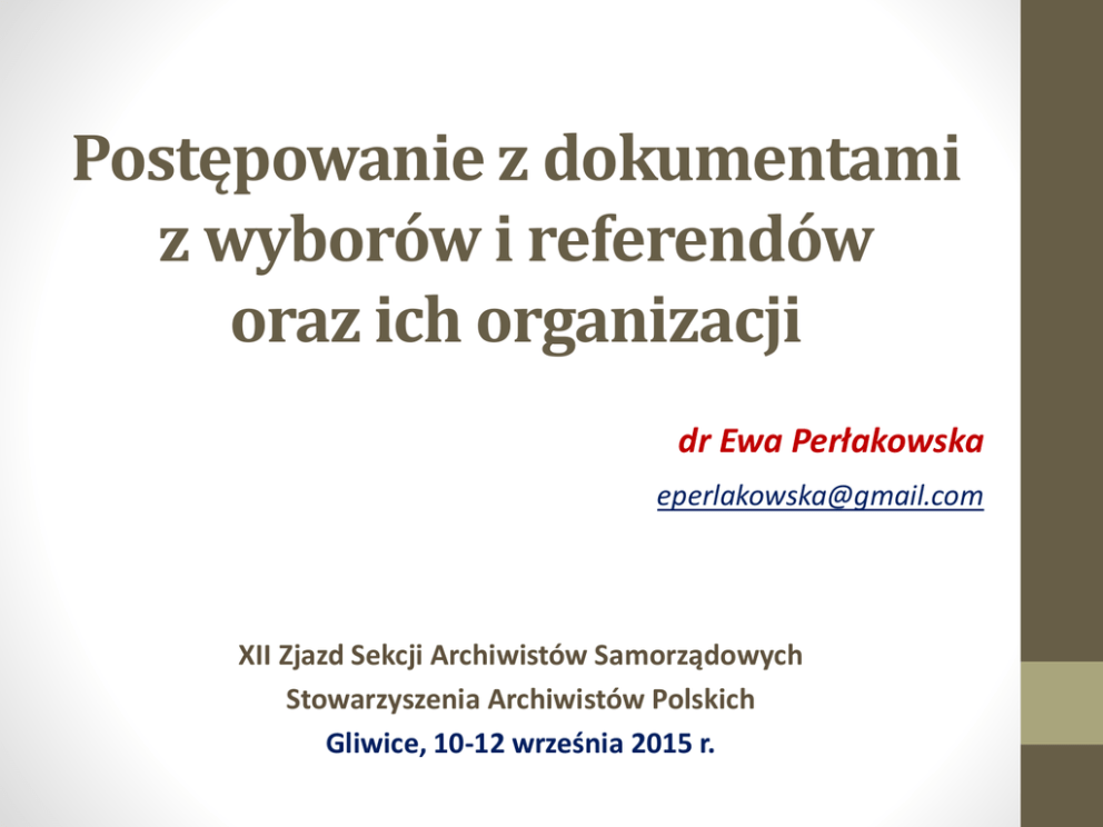 Postępowanie z dokumentami z wyborów i referendów oraz ich organizacji dr Ewa Perłakowska [email protected] XII Zjazd Sekcji Archiwistów Samorządowych Stowarzyszenia Archiwistów Polskich Gliwice, 10-12 września 2015 r. Plan • Pojęcie dokumentów z wyborów i referendów • Regulacje prawne w zakresie postępowania z dokumentami z wyborów i referendów • Zakres stosowania jednolitego rzeczowego wykazu akt. • Zakres odpowiedzialności jednostek samorządu terytorialnego. • Wartość archiwalna i czas przechowywania dokumentów z wyborów • Przechowywanie, ewidencjonowanie i zabezpieczanie dokumentów z wyborów • Procedura brakowania dokumentów z wyborów • Przekazywanie dokumentów z wyborów stanowiących materiały archiwalne do archiwów państwowych © dr Ewa Perłakowska Pojęcie dokumentów z wyborów i referendów Dokumentacja czy dokumenty ? • w Kodeksie wyborczym mowa jest o dokumentach z wyborów; • w ustawie o narodowym zasobie archiwalnym i archiwach mowa jest o dokumentacji; pojęcia w Kodeksie wyborczym = pojęcia w ustawie archiwalnej • stanowisko Sądu Najwyższego w ramach uzgodnień projektu – brak zdefiniowania w Kodeksie pojęcia „dokumenty z wyborów” (pismo Prezesa SN z dnia 6 czerwca 2012 r., znak: BSA III-021205/12); • odpowiedź MKiDN (NDAP) z dnia 19 kwietnia 2013 r., znak: DL/465/13 – w Kodeksie używa się też innych pojęć niż dokumenty z wyborów, np. w art. 6 – „wszelkie pisma” Źródło: http://legislacja.rcl.gov.pl/projekt/45831 Dokumenty z wyborów • w Kodeksie wyborczym używa się też pojęć: dokument stwierdzający tożsamość, dokumenty z głosowania, pozostałe dokumenty z wyborów, itp.; • przykłady regulacji w Kodeksie: Dokumenty z wyborów Dokumenty z wyborów to dokumenty zgromadzone i wytworzone przez komisje wyborcze i komisarzy wyborczych, w tym dokumenty z głosowania, w związku z organizowanymi wyborami; Regulacje prawne w zakresie postępowania z dokumentacją z wyborów Kodeks wyborczy • Ustawa z dnia 5 stycznia 2011 r. – Kodeks wyborczy (Dz. U. Nr 21, poz. 112, z późn. zm.) • data wejścia w życie – 1 sierpnia 2011 r. • art. 8 § 1. Dokumenty z wyborów są przekazywane do archiwów państwowych i mogą być udostępniane. § 2. Minister właściwy do spraw kultury i ochrony dziedzictwa narodowego, po zasięgnięciu opinii Państwowej Komisji Wyborczej oraz Naczelnego Dyrektora Archiwów Państwowych, określi, w drodze rozporządzenia, sposób przekazywania, przechowywania i udostępniania dokumentów z wyborów, ze szczególnym uwzględnieniem okresu, po jakim muszą być one przekazywane do archiwów państwowych, potrzeby ochrony przekazywanych, przechowywanych materiałów i zawartych w nich danych oraz podmiotów, którym dokumenty mogą być udostępniane. Kodeks wyborczy Brzmienie upoważnienia ustawowego, zawartego w art. 8 § 2 ustawy z dnia 5 stycznia 2011 r. – Kodeks wyborczy, jest tożsame co do zakresu przedmiotowego z brzmieniem upoważnienia w art. 169 ust. 2 dotychczas obowiązującej ustawy z dnia 23 stycznia 2004 r. – Ordynacja wyborcza do Parlamentu Europejskiego (Dz. U. Nr 25, poz. 219, z późn. zm.). Poprzednie akty prawne • rozporządzenie Ministra Kultury i Dziedzictwa Narodowego z dnia 6 października 2000 r. w sprawie sposobu przekazywania, przechowywania i udostępniania dokumentów z wyborów Prezydenta Rzeczypospolitej Polskiej (Dz. U. Nr 83, poz. 944, z późn. zm.), • rozporządzenie Ministra Kultury i Dziedzictwa Narodowego z dnia 23 sierpnia 2001 r. w sprawie sposobu przekazywania, przechowywania i udostępniania dokumentów z wyborów do Sejmu Rzeczypospolitej Polskiej i do Senatu Rzeczypospolitej Polskiej (Dz. U. Nr 90, poz. 1005, z późn. zm.), • rozporządzenie Ministra Kultury z dnia 27 listopada 2002 r. w sprawie sposobu przekazywania, przechowywania i udostępniania dokumentów z wyborów organów jednostek samorządu terytorialnego (Dz. U. Nr 209, poz. 1781, z późn. zm.), • rozporządzenie Ministra Kultury z dnia 16 czerwca 2004 r. w sprawie sposobu przekazywania, przechowywania i udostępniania dokumentów z wyborów posłów do Parlamentu Europejskiego (Dz. U. Nr 150, poz. 1580, z późn. zm.). Okres przejściowy w Kodeksie wyborczym Wyżej wymienione akty wykonawcze zachowywały moc obowiązującą, zgodnie z art. 15 ustawy z dnia 5 stycznia 2011 r. – Przepisy wprowadzające ustawę – Kodeks wyborczy (Dz. U. Nr 21, poz. 113, z późn. zm.), do dnia wejścia w życie rozporządzenia wydanego na podstawie art. 8 § 2 Kodeksu wyborczego. Inne akty prawne • ustawa z dnia 15 września 2000 r. o referendum lokalnym (Dz. U. z 2013 r., poz. 706, z późn. zm.) Inne akty prawne • ustawa z dnia 14 marca 2003 r. o referendum ogólnokrajowym (Dz. U. z 2003 r. Nr 57, poz. 507, z późn. zm.) • rozporządzenie Ministra Kultury z dnia 3 czerwca 2003 r. .... (Dz. U. Nr 102, poz. 951) Rozporządzenie rozporządzenie Ministra Kultury i Dziedzictwa Narodowego z dnia 13 listopada 2013 r. w sprawie sposobu przekazywania, przechowywania i udostępniania dokumentów z wyborów (Dz. U. poz. 1488) data wejścia w życie – 25 grudnia 2013 r. Układ rozporządzenia Przyjęty układ rozdziałów wynika z chronologii postępowania z dokumentami z wyborów w różnych organach oraz jednostkach organizacyjnych, jak i w różnym czasie. • rozdział 1 – Przepisy ogólne, • rozdział 2 – Postępowanie z dokumentami z wyborów z obwodowych komisji wyborczych, • rozdział 3 – Postępowanie z dokumentami z wyborów z okręgowych, rejonowych i terytorialnych komisji wyborczych oraz od komisarzy wyborczych, • rozdział 4 – Postępowanie z dokumentami z wyborów w delegaturach Krajowego Biura Wyborczego, • rozdział 5 – Postępowanie z dokumentami z wyborów w Państwowej Komisji Wyborczej, • rozdział 6 – Przepisy przejściowe i końcowe. Inny akt prawny Rozporządzenie Prezesa Rady Ministrów z dnia 18 styczni