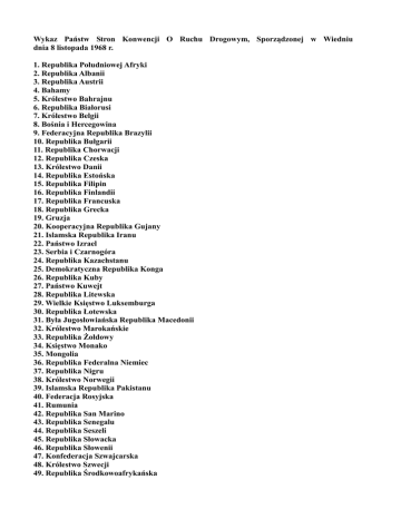 Wykaz Państw Stron Konwencji O Ruchu Drogowym, Sporządzonej w Wiedniu dnia 8 listopada 1968 r. 1. Republika Południowej Afryki 2. Republika Albanii 3. Republika Austrii 4. Bahamy 5. Królestwo Bahrajnu 6. Republika Białorusi 7. Królestwo Belgii 8. Bośnia i Hercegowina 9. Federacyjna Republika Brazylii 10. Republika Bułgarii 11. Republika Chorwacji 12. Republika Czeska 13. Królestwo Danii 14. Republika Estońska 15. Republika Filipin 16. Republika Finlandii 17. Republika Francuska 18. Republika Grecka 19. Gruzja 20. Kooperacyjna Republika Gujany 21. Islamska Republika Iranu 22. Państwo Izrael 23. Serbia i Czarnogóra 24. Republika Kazachstanu 25. Demokratyczna Republika Konga 26. Republika Kuby 27. Państwo Kuwejt 28. Republika Litewska 29. Wielkie Księstwo Luksemburga 30. Republika Łotewska 31. Była Jugosłowiańska Republika Macedonii 32. Królestwo Marokańskie 33. Republika Żołdowy 34. Księstwo Monako 35. Mongolia 36. Republika Federalna Niemiec 37. Republika Nigru 38. Królestwo Norwegii 39. Islamska Republika Pakistanu 40. Federacja Rosyjska 41. Rumunia 42. Republika San Marino 43. Republika Senegalu 44. Republika Seszeli 45. Republika Słowacka 46. Republika Słowenii 47. Konfederacja Szwajcarska 48. Królestwo Szwecji 49. Republika Środkowoafrykańska 50. Republika Tadżykistanu 51. Turkmenistan 52. Ukraina 53. Wschodnia Republika Urugwaju 54. Republika Uzbekistanu 55. Republika Węgierska 56. Republika Włoska 57. Republika Wybrzeża Kości Słoniowej 58. Republika Zimbabwe 59. Republika Tunezji (wykaz stanowi załącznik do rozporządzenia z dnia 28.12.2004 r. zmieniającego Min. Infrastruktury z dnia 21.01.2004 r. w sprawie wydawania uprawnień do kierowania pojazdami DZ. U. Nr 286 poz.2884 z 2004 r.)