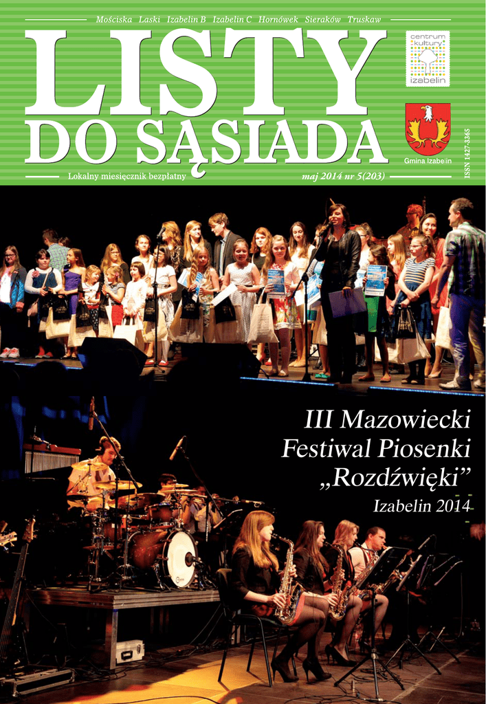 maj 2014 nr 5(203) III Mazowiecki Festiwal Piosenki „Rozdźwięki” Izabelin 2014 2 W N U M ER Z E Strona 2–3 Nowe zasady tworzenia klas czwartych w Szkole Podstawowej w Izabelinie Nie wypalajmy odpadów!!! O tym, co ważne… z Wójtem Gminy Izabelin Witoldem Malarowskim rozmawia Iwona Mazurek Strona 4–5 XXXVI Zwyczajna Sesja Rady Gminy Izabelin Strona 6–7 Nie daj się złapać w tę pułapkę Strażacki Leśnik Zespół Interdyscyplinarny – część 3 Interwencje straży pożarnych Nowe zasady tworzenia klas czwartych w Szkole Podstawowej w Izabelinie W ostatnim czasie trwała ożywiona dyskusja na temat zmiany zasad tworzenia klas czwartych i doboru uczniów do poszczególnych oddziałów w Szkole Podstawowej w Izabelinie, w nadchodzącym roku szkolnym (2014/2015). W jej wyniku, Rada Rodziców Zespołu Szkół w Izabelinie w dniu 12 maja 2014r. podjęła uchwałę, w której zwróciła się z prośbą do Dyrekcji Zespołu Szkół w Izabelinie o odroczenie wprowadzenia nowych zasad tworzenia klas czwartych, do roku szkolnego 2015/2016. Dyrekcja Zespołu Szkół w Izabelinie przychyliła się do rozwiązań proponowanych przez Radę Rodziców i podjęła decyzję o przesunięciu w czasie planowanych zmian. Szczegółowe informacje na stronie internetowej Szkoły Podstawowej w Izabelinie www.izabelin.edu.pl Strona 8–9 Koncert Dziękczynny za kanonizację Polskiego Papieża Jana Pawła II XXII Powiatowy Konkurs Muzyczny Stare Babice 2014 X Jubileuszowy Festiwal Muzyczny „W krainie Chopina” Kronika Budowy Wielkich Organów Laseckich cz. II Strona 10–11 III Mazowiecki Festiwal Piosenki „Rozdźwięki” Izabelin 2014 Strona 12–13 Międzynarodowy Dzień Ziemi w Gminnym Przedszkolu w Laskach „Strusie opowieści” czyli nawet przedszkolak może wydać książkę Ogólnopolska Akcja Ekologiczna „Listy dla Ziemi” Strona 14–15 „Mistrz zadań tekstowych” Jubileuszowa – X edycja wojewódzkiego konkursu matematycznego w Szkole Podstawowej Izabelinie Strona 16–17 Książka o Miejscach Pamięci Narodowej w PWZ Czytamy dzieciom Gminna biblioteka publiczna w Izabelinie Otwarcie placu zabaw w Truskawiu Senior zdrowy i aktywny Koncert muzyki hip hop BARBARA BACEWICZ BORYS NIE WYPALAJMY ODPADÓW!!! Szanowni Mieszkańcy, Lekarze alarmują, że w związku z coraz większą ilością spalanych śmieci w gospodarstwach domowych obserwuje się zwiększającą ilość pacjentów chorych na astmę oskrzelową, alergiczne zapalenia skóry, alergie pokarmowe oraz przypadki chorób nowotworowych u dzieci. Ostatni Raport Komisji Europejskiej informuje, że co roku na choroby wywołane złym stanem powietrza umiera około 28 tysięcy Polaków. I w naszej gminie, wraz z nadejściem wiosny, pojawiają się liczne przypadki wypalania trawy, liści i innych odpadów pochodzących z naszych przydomowych ogródków. Działania takie nie są przyjemne ani dla palącego ani dla sąsiadów, którzy muszą wdychać zanieczyszczone powietrze. Mamy coraz więcej zgłoszeń o tego typu procederze i w związku z tym coraz częściej musi interweniować policja. Po cóż sprawiać sobie niepotrzebne problemy i narażać się na nieprzyjemności? W ramach wywozu odpadów komunalnych od mieszkańców gminy zabierane są również (bez żadnych dodatkowych kosztów) odpady „zielone”. Jedynym obowiązkiem mieszkańca jest zakup worków (max. 120 litrowych) i umieszczenie w nim tej frakcji odpadów. Zatem, za te kilka groszy, można oszczędzić sobie i sąsiadom zbędnych zanieczyszczeń i nieprzyjemności. Jednocześnie przypominamy, że odpady „zielone” nie mogą być umieszczane w workach do zbiórki selektywnej, dostarczanych przez firmę MPO. Dbajmy o środowisko i szanujmy się wzajemnie. MARTA MERCHEL Rodzinny Piknik Sportowy z okazji Dnia Dziecka Klub filmowy w Centrum Kultury Izabelin Strona 18 Ogłoszenia Strona 19–24 Reklamy Okładka Koncert finałowy „Rozdźwięki 2014” w CKI Foto: G. Nowicki Listy do Sąsiada – lokalny miesięcznik bezpłatny • Adres redakcji: 05-080 Izabelin, ul. Matejki 21, tel. 22 752-68-17, fax 22 752-98-14/15 www.izabelin.pl, e-mail: [email protected] • Redaguje zespół w składzie: Iwona Mazurek, Janusz Marciniak, Beata Jagodzińska. Redakcja nie odpowiada za treść reklam i ogłoszeń; zastrzega sobie prawo skrótów w publikowanych listach i treściach. Gazeta jest członkiem Polskiego Stowarzyszenia Prasy Lokalnej z siedzibą w Krakowie. Reklamy i ogłoszenia przyjmujemy do końca każdego miesiąca. Numer konta: PKO BP S.A. II O/W-wa 60 1020 1026 0000 1102 0147 4105 Skład/druk: Agencja Reklamowo-Wydawnicza Arkadiusz Grzegorczyk, ul. Gen. Tadeusza Kutrzeby 15, 05-082 Stare Babice, www.grzeg.com.pl Z ŻYCIA GMINY O tym, co ważne… z Wójtem Gminy Izabelin Witoldem Malarowskim rozmawia Iwona Mazurek Panie Wójcie. Wracając do przerwanego wywiadu chciałam prosić Pana o przedstawienie aktualnych uzgodnień dotyczących stanu bezpieczeństwa mieszkańców gminy. Kontynuując naszą rozmowę sprzed dwóch tygodni powiem, że ostatnie poczynania kierownictwa policji, a zwłaszcza likwidacja najpierw komisariatu, a następnie rewiru dzielnicowych, to w odczuciu nas wszystkich, mieszkańców gminy, najważniejszy i najpoważniejszy problem w zakresie bezpieczeństwa na naszym terenie. Sposób w jaki działa komendant powiatowy uchybia cywilizowanym normom. W grudniu ubiegłego roku, praktycznie bez uprzedzenia, zostaliśmy postawieni przed faktem zlikwidowania komisariatu, ale w zamian otrzymaliśmy obietnicę utrzymania placówki w okrojonym składzie, tzw. rewiru dzielnicowych. Proszę wrócić do styczniowego numeru „Listów do sąsiada”, gdzie w wywiadzie z Panią, komendant „szczerze” tłumaczył istotę swej reformy i przekonywał, że likwidacja, to nie likwidacja, a jedynie przekształcenie komisariatu w inną jednostkę organizacyjną. W tym samym czasie zawierał ze mną umowy o współpracy na kolejny rok, a między innymi
