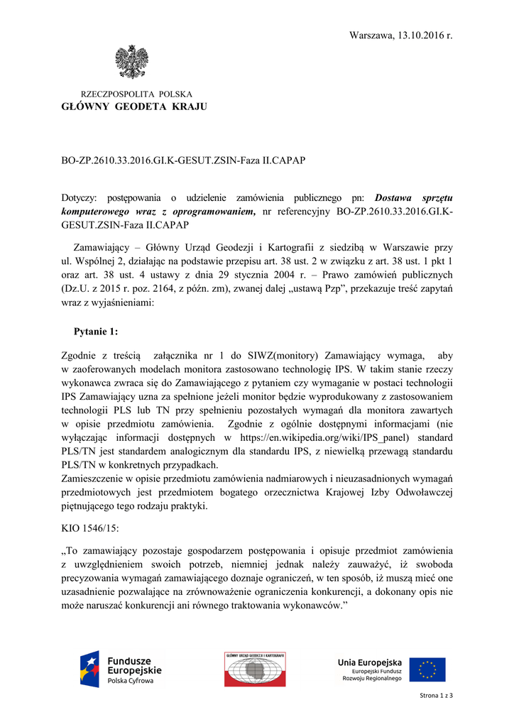 Warszawa, 13.10.2016 r. RZECZPOSPOLITA POLSKA GŁÓWNY GEODETA KRAJU BO-ZP.2610.33.2016.GI.K-GESUT.ZSIN-Faza II.CAPAP Dotyczy: postępowania o udzielenie zamówienia publicznego pn: Dostawa sprzętu komputerowego wraz z oprogramowaniem, nr referencyjny BO-ZP.2610.33.2016.GI.KGESUT.ZSIN-Faza II.CAPAP Zamawiający – Główny Urząd Geodezji i Kartografii z siedzibą w Warszawie przy ul. Wspólnej 2, działając na podstawie przepisu art. 38 ust. 2 w związku z art. 38 ust. 1 pkt 1 oraz art. 38 ust. 4 ustawy z dnia 29 stycznia 2004 r. – Prawo zamówień publicznych (Dz.U. z 2015 r. poz. 2164, z późn. zm), zwanej dalej „ustawą Pzp”, przekazuje treść zapytań wraz z wyjaśnieniami: Pytanie 1: Zgodnie z treścią załącznika nr 1 do SIWZ(monitory) Zamawiający wymaga, aby w zaoferowanych modelach monitora zastosowano technologię IPS. W takim stanie rzeczy wykonawca zwraca się do Zamawiającego z pytaniem czy wymaganie w postaci technologii IPS Zamawiający uzna za spełnione jeżeli monitor będzie wyprodukowany z zastosowaniem technologii PLS lub TN przy spełnieniu pozostałych wymagań dla monitora zawartych w opisie przedmiotu zamówienia. Zgodnie z ogólnie dostępnymi informacjami (nie wyłączając informacji dostępnych w https://en.wikipedia.org/wiki/IPS_panel) standard PLS/TN jest standardem analogicznym dla standardu IPS, z niewielką przewagą standardu PLS/TN w konkretnych przypadkach. Zamieszczenie w opisie przedmiotu zamówienia nadmiarowych i nieuzasadnionych wymagań przedmiotowych jest przedmiotem bogatego orzecznictwa Krajowej Izby Odwoławczej piętnującego tego rodzaju praktyki. KIO 1546/15: „To zamawiający pozostaje gospodarzem postępowania i opisuje przedmiot zamówienia z uwzględnieniem swoich potrzeb, niemniej jednak należy zauważyć, iż swoboda precyzowania wymagań zamawiającego doznaje ograniczeń, w ten sposób, iż muszą mieć one uzasadnienie pozwalające na zrównoważenie ograniczenia konkurencji, a dokonany opis nie może naruszać konkurencji ani równego traktowania wykonawców.” Strona 1 z 3 KIO 15416/15 „Zgodnie z art. 29 ust. 2 p.z.p., nie można opisywać przedmiotu zamówienia w sposób, który może utrudniać uczciwą konkurencję. Zakaz ten oznacza, że zakazane jest dokonywanie opisu przedmiotu zamówienia nie tylko takiego, który utrudnia uczciwą konkurencję, wskazując na konkretny produkt, ale i takiego, który potencjalnie mógłby wpłynąć na konkurencję na rynku. Jednakże zakaz opisywania przedmiotu zamówienia w sposób, który mógłby utrudniać uczciwą konkurencję nie oznacza konieczności nabycia przez zamawiającego dostaw, usług czy robót budowlanych nieodpowiadających jego potrzebom, zarówno co do jakości, funkcjonalności czy wymaganych parametrów technicznych, po to tylko żeby dopuścić możliwość ofertowania przez wszystkich wykonawców i odnośnie wszystkich produktów znajdujących się w ich ofercie. Oznacza jedynie, iż zamawiający winien dopuścić konkurencję między wykonawcami mogącymi spełnić postawione wymogi w odniesieniu do przedmiotu zamówienia bez ograniczania dostępu do niego. Stąd bardzo istotną czynnością zamawiającego jest dokonanie opisu przedmiotu zamówienia przez wskazanie tych jego cech, które mają dla zamawiającego kluczowe znaczenie. Dla stwierdzenia naruszenia art. 29 ust. 2 p.z.p. wystarcza wprawdzie zaistnienie możliwości utrudnienia konkurencji. Jednakże wykazanie możliwości naruszenia uczciwej konkurencji nie może ograniczyć się do twierdzeń wykonawcy, przesuwając w ten sposób cały ciężar dowodzenia wyłącznie na zamawiającego, przy założeniu, iż jeśli nie udowodni on tezy przeciwnej, należy uznać daną okoliczność za wystarczająco wykazaną.” KIO 847/15 „Prawidłowy, czyniący zadość potrzebom zamawiającego i uzasadniony tymi potrzebami, ale także realizujący zasady uczciwej konkurencji, dający szansę wykonawcom na złożenie konkurencyjnych ofert, opis przedmiotu zamówienia stanowi fundament postępowania o zamówienie publiczne. Wszelkie wymagania stawiane wobec przedmiotu zamówienia winny znajdować uzasadnienie w potrzebach postępowania i nie powinny mieć charakteru wybiórczych. Zamawiający powinien zatem poddać refleksji wszelkie sygnały, niezależnie od ich źródła i sfery formalnoprawnej związanej z takim lub innym postawieniem żądań w odwołaniu, jeśli ich wynikiem jest stwierdzenie niedoskonałości w zakresie opisu przedmiotu zamówienia oraz ukształtowania postępowania. Zmiana SIWZ mająca na celu realizację zasad postępowania jest więc zawsze dopuszczalna, a nawet konieczna, jeśli prowadzi do usunięcia dostrzeżonych wad w postępowaniu.” Pozytywne ustosunkowanie się do zadanego pytania pozwoli na przedstawienie korzystnej dla Zamawiającego oferty renomowanego producenta sprzętu IT firmy Samsung. Odpowiedź: Matryca wykonana w technologii PLS jest od strony technicznej tożsama w stosunku do matrycy IPS, wobec czego w przypadku zaoferowania monitora z matrycą typu PLS Zamawiający uzna wymaganie za spełnione. Zamawiający wprowadził wymaganie dotyczące typu matrycy (IPS), ponieważ tego typu monitory charakteryzują się lepszym odwzorowaniem kolorów i większymi kątami widzenia niż monitory z matrycami typu TN. Strona 2 z 3 Wobec powyższego monitory z matrycami typu TN nie spełniają wymagań opisanych w OPZ dotyczących matrycy typu IPS. Pytanie 2: Stacja numer 1 Punkt 15. Wbudowane porty Min.3 x cyfrowe wyjcie video ( np. DisplayPort) Czy ten zapis odnosi się do płyty głównej czy karty graficznej…? Stacja numer 2 Punkt 15. Wbudowane porty Min.4 x cyfrowe wyjcie video ( np. DisplayPort) Czy ten zapis odnosi się do płyty głównej czy karty graficznej…? Stacja numer 3 Punkt 15. Wbudowane porty Min.2 x cyfrowe wyjcie video ( np. DisplayPort) Czy ten zapis odnosi się do płyty głównej czy karty graficznej…? Stacja numer 4 Punkt 15. Wbudowane 