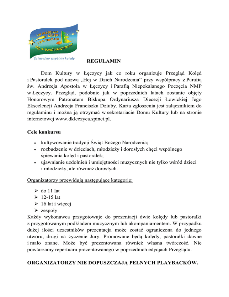 REGULAMIN Dom Kultury w Łęczycy jak co roku organizuje Przegląd Kolęd i Pastorałek pod nazwą „Hej w Dzień Narodzenia” przy współpracy z Parafią św. Andrzeja Apostoła w Łęczycy i Parafią Niepokalanego Poczęcia NMP w Łęczycy. Przegląd, podobnie jak w poprzednich latach zostanie objęty Honorowym Patronatem Biskupa Ordynariusza Diecezji Łowickiej Jego Ekscelencji Andrzeja Franciszka Dziuby. Karta zgłoszenia jest załącznikiem do regulaminu i można ją otrzymać w sekretariacie Domu Kultury lub na stronie internetowej www.dkleczyca.spinet.pl. Cele konkursu kultywowanie tradycji Świąt Bożego Narodzenia; rozbudzenie w dzieciach, młodzieży i dorosłych chęci wspólnego śpiewania kolęd i pastorałek; ujawnianie uzdolnień i umiejętności muzycznych nie tylko wśród dzieci i młodzieży, ale również dorosłych. Organizatorzy przewidują następujące kategorie: do 11 lat 12-15 lat 16 lat i więcej zespoły Każdy wykonawca przygotowuje do prezentacji dwie kolędy lub pastorałki z przygotowanym podkładem muzycznym lub akompaniamentem. W przypadku dużej ilości uczestników prezentacja może zostać ograniczona do jednego utworu, drugi na życzenie Jury. Promowane będą kolędy, pastorałki dawne i mało znane. Może być prezentowana również własna twórczość. Nie powtarzamy repertuaru prezentowanego w poprzednich edycjach Przeglądu. ORGANIZATORZY NIE DOPUSZCZAJĄ PEŁNYCH PLAYBACKÓW. Termin i miejsce konkursu 16 grudnia 2016 r. godz. 11.00 Sala widowiskowa Domu Kultury w Łęczycy – konkurs 6 stycznia 2017 r. godz. 14.00 Kościół p.w. św. Andrzeja w Łęczycy – Rozdanie nagród i Koncert Laureatów Uczestnicy: W przeglądzie mogą wziąć udział soliści, duety, zespoły wokalne i wokalnoinstrumentalne, chóry działające w szkołach, domach kultury, parafiach, stowarzyszeniach, a także osoby niezrzeszone, które amatorsko uprawiają sztukę wokalną. Warunki uczestnictwa: Warunkiem uczestnictwa jest dostarczenie prawidłowo wypełnionej karty uczestnictwa (koniecznie przy tytule należy umieścić nazwisko autora tekstu i kompozytora!) do sekretariatu Domu Kultury w Łęczycy, al. Jana Pawła II 11 99-100 Łęczyca , tel/fax 24 7210349 lub e-mailowo na adres [email protected] do dnia 7 grudnia 2016 r. Jury: W skład jury wejdą osoby profesjonalnie zajmujące się muzyką. Ocena dotyczyć będzie: umiejętności wokalnych uczestników; sposobu wykonania kolęd lub pastorałek pod względem muzycznym; stopień trudności; osobiste zaangażowanie śpiewających. Na ostateczną ocenę mogą mieć również wpływ wszelkie elementy, które dodatkowo wzbogacą występ solisty, duetu, zespołu. Jury zastrzega sobie prawo do oceny według własnych kryteriów. Dodatkowe informacje można uzyskać telefonicznie pod numerem 24 721 03 49 lub w sekretariacie Domu Kultury w Łęczycy. Osoba do kontaktu: Dariusz Kuś dostępny pod numerem 509 991 475. Koszty organizacyjne Koszty organizacji przeglądu ponoszą organizatorzy. Uczestnicy przyjeżdżają na koszt własny lub organizacji delegującej. Organizatorzy nie zapewniają posiłków. Karta zgłoszenia Przegląd Kolęd i Pastorałek „Hej w Dzień Narodzenia” Łęczyca, 16 grudnia 2016 r. Imię i nazwisko ……………………………………………………........... (lub nazwa zespołu) ……………………………………………................ Kategoria wiekowa…………………………………… Instytucja delegująca………….................................................................... (tel. i adres) ……………………………………………………... ……………………………………………………... Tytuły utworów …………………………………………………........ (kompozytor, autor tekstu) ………………………………………………... ……………………………………………….…. …………………………………………….....…. ……………………………………………….…. ……………………………………………….…. Rodzaj akompaniamentu……………………………….. Krótka charakterystyka wykonawcy……………………………………………………………………… …………………………………………………………………………………… …………………………………………………………………………………… …………………………………………………………………………………… Wyrażam zgodę na prezentację mojego wizerunku na stronach internetowych Domu Kultury oraz rejestrację koncertu i publikację w mediach. Data…………………. Podpis……………….