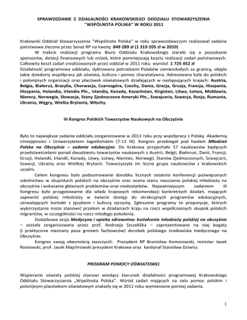 SPRAWOZDANIE Z DZIAŁALNOŚCI KRAKOWSKIEGO ODDZIAŁU STOWARZYSZENIA "WSPÓLNOTA POLSKA” W ROKU 2011 Krakowski Oddział Stowarzyszenia "Wspólnota Polska" w roku sprawozdawczym realizował zadania państwowe zlecone przez Senat RP na kwotę 849 289 zł (1 319 205 zł w 2010) W trakcie realizacji programu Biuro Oddziału Krakowskiego starało się o pozyskanie sponsorów, dotacji finansowych lub zniżek, które pomniejszają koszty realizacji zadań państwowych. Całkowity koszt zadań zrealizowanych przez oddział w 2011 roku wyniósł 1 725 452 zł Działalność programowa oddziału, dyktowana potrzebami Polaków zamieszkałych za granicą, objęła takie dziedziny współpracy jak oświata, kultura i pomoc charytatywna. Adresowana była do polskich i polonijnych organizacji oraz placówek oświatowych działających w następujących krajach: Austria, Belgia, Białoruś, Brazylia, Chorwacja, Czarnogóra, Czechy, Dania, Grecja, Gruzja, Francja, Hiszpania, Hiszpania, Holandia, Irlandia Płn., Islandia, Kanada, Kazachstan, Kirgistan, Litwa, Łotwa, Mołdawia, Niemcy, Norwegia, Słowacja, Stany Zjednoczone Ameryki Płn., Szwajcaria, Szwecja, Rosja, Rumunia, Ukraina, Węgry, Wielka Brytania, Włochy. III Kongres Polskich Towarzystw Naukowych na Obczyźnie Było to największe zadanie oddziału zorganizowane w 2011 roku przy współpracy z Polską Akademią Umiejętności i Uniwersytetem Jagiellońskim (7-11 IX). Kongres przebiegał pod hasłem Młodzież Polska na Obczyźnie – zadanie edukacyjne. Do Krakowa przyjechało 57 naukowców będących przedstawicielami ponad dwudziestu towarzystw naukowych z Austrii, Belgii, Białorusi, Danii, Francji, Gruzji, Holandii, Irlandii, Kanady, Litwy, Łotwy, Niemiec, Norwegii, Stanów Zjednoczonych, Szwajcarii, Szwecji, Ukrainy oraz Wielkiej Brytanii. Towarzyszyła im liczna grupa naukowców z krakowskich uczelni. Celem kongresu było podsumowanie dorobku licznych ostatnio konferencji poświęconych szkolnictwu w skupiskach polskich na obczyźnie oraz ocena stanu nauczania polskiej młodzieży na obczyźnie i wskazanie głównych problemów oraz niedostatków. Najważniejszym zadaniem III Kongresu było przygotowanie dla władz krajowych rekomendacji konkretnych działań, mających zapewnić polskiej młodzieży w świecie dostęp do atrakcyjnych programów edukacyjnych, utrwalających kontakt z językiem i kulturą ojczystą. Zgłoszone programy to propozycje, których wykorzystanie może stanowić przełom w działaniach kraju na rzecz współczesnych skupisk polskich migrantów, w szczególności na rzecz młodego pokolenia. Dodatkowa sesja Medycyna i opieka zdrowotna: kształcenie młodzieży polskiej na obczyźnie – została zorganizowana przez prof. Andrzeja Szczeklika – zaprezentowano na niej bogaty (i praktycznie nieznany poza gronem fachowców) dorobek polskiego środowiska medycznego na Obczyźnie. Kongres swoją obecnością zaszczycili: Prezydent RP Bronisław Komorowski, minister Jacek Rostowski, prof. Jacek Majchrowski prezydent Krakowa oraz kardynał Stanisław Dziwisz. PROGRAM POMOCY OŚWIATOWEJ Wspieranie oświaty polskiej stanowi wiodący kierunek działalności programowej Krakowskiego Oddziału Stowarzyszenia „Wspólnota Polska”. Wśród zadań mających na celu pomoc polskim i polonijnym placówkom oświatowym znalazły się w 2011 roku wymienione poniżej zadania. 1 Realizacja programu szkół patronackich. W ramach tzw. wymiany śródrocznej uczniowie odwiedzają swoich rówieśników, z którymi wspólnie uczęszczają na zajęcia lekcyjne oraz uczestniczą w programie edukacyjno-krajoznawczym. Bardzo często współpraca między szkołami ma już kilkuletnie tradycje. Program szkół patronackich dla nauczycieli obydwu stron jest okazją do porównania metod pracy oraz wymiany doświadczeń dydaktycznych. W 2011 roku w ramach programu Oddział Krakowski dofinansował: pobyt 30 uczniów ze Szkoły Sportowej w Ejszyszkach (Litwa) w Zespole Szkół Ogólnokształcących Sportowych nr 1 w Krakowie połączony z udziałem w Turnieju Piłki Ręcznej „Lajkonik 2011” (28 IV-1 V); wyjazd 35 uczniów z Zespołu Szkół Ogólnokształcących Sportowych nr 1 w Krakowie do szkoły sportowej w Ejszyszkach (Litwa) (2-6 VI); wyjazd 38 uczniów Gimnazjum nr 29 w Krakowie do Szkoły Średniej im. W. Syrokomli w Wilnie (16-22 X); pobyt 32 uczniów Zespołu Szkół Gminnych z Siedlca w szkole polskiej w Mickunach na Litwie (24-29 X); wyjazd 44 uczniów ZSHT z Zakopanego do szkoły polskiej w Jęczmieniszkach na Litwie (14-19 XI); pobyt 22 uczniów Gimnazjum Polskiego z Dyneburgu na Łotwie w Zespole Szkoły Podstawowej i Gimnazjum nr 2 w Białym Dunajcu (16-23 X); pobyt 21 uczniów Szkoły Średniej nr 10 ze Lwowa w krakowskim VII Liceum Ogólnokształcącym (11-15 IV); wyjazd 51 uczniów Gimnazjum nr 1 w Krakowie do Krzemieńca na Ukrainie (5-11 VI); pobyt 27 uczniów Szkoły nr 24 ze Lwowa w Gimnazjum w Szarowie (12-18 IX); wyjazd uczniów Liceum Ogólnokształcącego w Wieliczce i Gimnazjum z Szarowa (w sumie 29 osoby) do Szkoły nr 24 we Lwowie (2-5 X); pobyt 23 uczniów ze Szkoły Podstawowej w Bukowie k/Mogilan w Polskiej Szkole Sobotniej w Dolinie na Ukrainie (23-27 V); wyjazd 19 uczniów VII LO w Krakowie do Szkoły Średniej nr 10 we Lwowie (2-5 XI). Ogółem w programie szkół patronackich wzięło udział 271 uczniów szkół polskich oraz 100 dzieci i młodzieży polskiego pochodzenia z Litwy, Łotwy i Ukrainy. Kolejnym kierunkiem działalności oświatowej jest organizowanie wakacyjnych pobytów, kolonii i obozów językowych dla dzieci i młodzieży polskiego pochodzenia w miejscu ich zamieszkania. Stosunkowo niskie koszty organizacyjne pozwalają na objęcie tego rodzaju wypoczynkiem większej liczby uczestników. Wakacyjny wypoczynek połączony jest z doskonaleniem znajomości języka polskiego oraz poznawaniem polskich tradycji i kultury. W ramach zadań zleconych Oddział Krakowski dofinansował w 2011 roku ze 