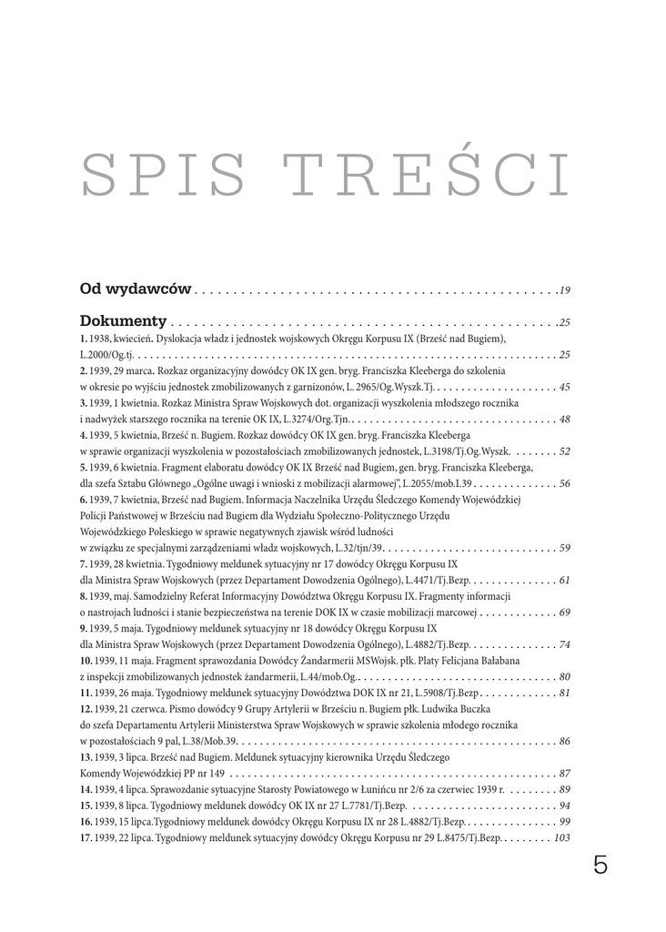 SPIS TREŚCI Od wydawców . . . . . . . . . . . . . . . . . . . . . . . . . . . . . . . . . . . . . . . . . . . . . . 19 Dokumenty . . . . . . . . . . . . . . . . . . . . . . . . . . . . . . . . . . . . . . . . . . . . . . . . . 25 1. 1938, kwiecień. Dyslokacja władz i jednostek wojskowych Okręgu Korpusu IX (Brześć nad Bugiem), L.2000/Og.tj. . . . . . . . . . . . . . . . . . . . . . . . . . . . . . . . . . . . . . . . . . . . . . . . . . . . . . . . . . . . . . . . . . . . . . . 25 2. 1939, 29 marca. Rozkaz organizacyjny dowódcy OK IX gen. bryg. Franciszka Kleeberga do szkolenia w okresie po wyjściu jednostek zmobilizowanych z garnizonów, L. 2965/Og.Wyszk.Tj. . . . . . . . . . . . . . . . . . . . . 45 3. 1939, 1 kwietnia. Rozkaz Ministra Spraw Wojskowych dot. organizacji wyszkolenia młodszego rocznika i nadwyżek starszego rocznika na terenie OK IX, L.3274/Org.Tjn. . . . . . . . . . . . . . . . . . . . . . . . . . . . . . . . . . . 48 4. 1939, 5 kwietnia, Brześć n. Bugiem. Rozkaz dowódcy OK IX gen. bryg. Franciszka Kleeberga w sprawie organizacji wyszkolenia w pozostałościach zmobilizowanych jednostek, L.3198/Tj.Og.Wyszk. . . . . . . . . 52 5. 1939, 6 kwietnia. Fragment elaboratu dowódcy OK IX Brześć nad Bugiem, gen. bryg. Franciszka Kleeberga, dla szefa Sztabu Głównego „Ogólne uwagi i wnioski z mobilizacji alarmowej”, L.2055/mob.I.39 . . . . . . . . . . . . . . 56 6. 1939, 7 kwietnia, Brześć nad Bugiem. Informacja Naczelnika Urzędu Śledczego Komendy Wojewódzkiej Policji Państwowej w Brześciu nad Bugiem dla Wydziału Społeczno-Politycznego Urzędu Wojewódzkiego Poleskiego w sprawie negatywnych zjawisk wśród ludności w związku ze specjalnymi zarządzeniami władz wojskowych, L.32/tjn/39 . . . . . . . . . . . . . . . . . . . . . . . . . . . . . 59 7. 1939, 28 kwietnia. Tygodniowy meldunek sytuacyjny nr 17 dowódcy Okręgu Korpusu IX dla Ministra Spraw Wojskowych (przez Departament Dowodzenia Ogólnego), L.4471/Tj.Bezp. . . . . . . . . . . . . . . 61 8. 1939, maj. Samodzielny Referat Informacyjny Dowództwa Okręgu Korpusu IX. Fragmenty informacji o nastrojach ludności i stanie bezpieczeństwa na terenie DOK IX w czasie mobilizacji marcowej . . . . . . . . . . . . . 69 9. 1939, 5 maja. Tygodniowy meldunek sytuacyjny nr 18 dowódcy Okręgu Korpusu IX dla Ministra Spraw Wojskowych (przez Departament Dowodzenia Ogólnego), L.4882/Tj.Bezp. . . . . . . . . . . . . . . 74 10. 1939, 11 maja. Fragment sprawozdania Dowódcy Żandarmerii MSWojsk. płk. Platy Felicjana Bałabana z inspekcji zmobilizowanych jednostek żandarmerii, L.44/mob.Og. . . . . . . . . . . . . . . . . . . . . . . . . . . . . . . . . . 80 11. 1939, 26 maja. Tygodniowy meldunek sytuacyjny Dowództwa DOK IX nr 21, L.5908/Tj.Bezp . . . . . . . . . . . . . 81 12. 1939, 21 czerwca. Pismo dowódcy 9 Grupy Artylerii w Brześciu n. Bugiem płk. Ludwika Buczka do szefa Departamentu Artylerii Ministerstwa Spraw Wojskowych w sprawie szkolenia młodego rocznika w pozostałościach 9 pal, L.38/Mob.39 . . . . . . . . . . . . . . . . . . . . . . . . . . . . . . . . . . . . . . . . . . . . . . . . . . . . . 86 13. 1939, 3 lipca. Brześć nad Bugiem. Meldunek sytuacyjny kierownika Urzędu Śledczego Komendy Wojewódzkiej PP nr 149 . . . . . . . . . . . . . . . . . . . . . . . . . . . . . . . . . . . . . . . . . . . . . . . . . . . . . . . 87 14. 1939, 4 lipca. Sprawozdanie sytuacyjne Starosty Powiatowego w Łunińcu nr 2/6 za czerwiec 1939 r. . . . . . . . . . 89 15. 1939, 8 lipca. Tygodniowy meldunek dowódcy OK IX nr 27 L.7781/Tj.Bezp. . . . . . . . . . . . . . . . . . . . . . . . . . 94 16. 1939, 15 lipca.Tygodniowy meldunek dowódcy Okręgu Korpusu IX nr 28 L.4882/Tj.Bezp. . . . . . . . . . . . . . . . 99 17. 1939, 22 lipca. Tygodniowy meldunek sytuacyjny dowódcy Okręgu Korpusu nr 29 L.8475/Tj.Bezp. . . . . . . . . 103 5 SGO „Polesie” w dokumentach i wspomnieniach 18. 1939, lipiec. Samodzielny Referat Informacyjny. Informacje o nastrojach ludności i stanie bezpieczeństwa na terenie cywilnym i wojskowym Dowództwa Okręgu Korpusu IX za miesiąc czerwiec 1939 r., L.10561/Inf.tj.IV.39 . . . . . . . . . . . . . . . . . . . . . . . . . . . . . . . . . . . . . . . . . . . . . . . . . . . . . . . . . . . . . . . . 19. 1939, 18 sierpnia, Brześć n. Bugiem. Pismo Wydziału Społeczno-Politycznego Urzędu Wojewódzkiego Poleskiego do Wydziału Bezpieczeństwa Ministerstwa Spraw Wewnętrznych w sprawie o zbiegostwo do ZSRR, L.16-d. . . . . . . . . . . . . . . . . . . . . . . . . . . . . . . . . . . . . . . . . . . . . . . . . . . . . . . . . . . . . . . . . . . . . . . . . . 20. 1939, 31 sierpnia, godz. 15.00, Biała Podlaska. Meldunek informatora z Białej Podlaskiej dla kierownika agentury SRI DOK IX w Brześciu w sprawie nastrojów w związku z ogłoszeniem mobilizacji powszechnej, L.1361 . . . . . . . . . . . . . . . . . . . . . . . . . . . . . . . . . . . . . . . . . . . . . . . . . . . . . . . 21. 1939, 1 września, godz. 7.30. Fragment meldunku sytuacyjnego MSWojsk. na temat nalotów niemieckich (najważniejsze wiadomości zebrane do godz. 7.30) dotyczący sytuacji na terenie OK IX (Brześć n. Bugiem) . . . . . 22. 1939, 1 września, godz. 18.00. Meldunek sytuacyjny MSWojsk. na temat nalotów niemieckich przekazujący treść meldunku dowódcy OK IX . . . . . . . . . . . . . . . . . . . . . . . . . . . . . . . . . . . . . . . . . . . . . . 23. 1939, 1 września, Słonim. Sprawozdanie tygodniowe agenta ps. Roch Jaskólski za okres 25–31 VIII 1939 r. dla kierownika Placówki Oficerskiej SRI DOK IX w Baranowiczach, L.1592/IV.39 . . . . . . . . . . . . . . . . . . . . . . 24. 1939, 2 września. Tygodniowy meldunek sytuacyjny Komendanta Powiatowego PW w Radzyniu Podlaskim por. kontr. Romualda Kompfa dla kierownika Okręgowego Urzędu WF i PW OK IX w Brześciu n. Bugiem, L.129/39.tjn. . . . . . . . . . . . . . . . . . . . . . . . . . . . . . . . . . . . . . . . . . . . . . . . . . . . . . 25. 1939, 2 wr